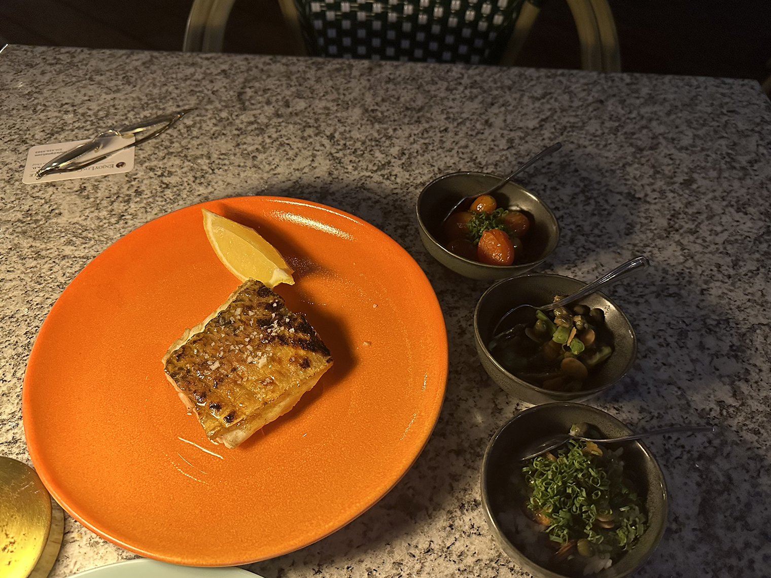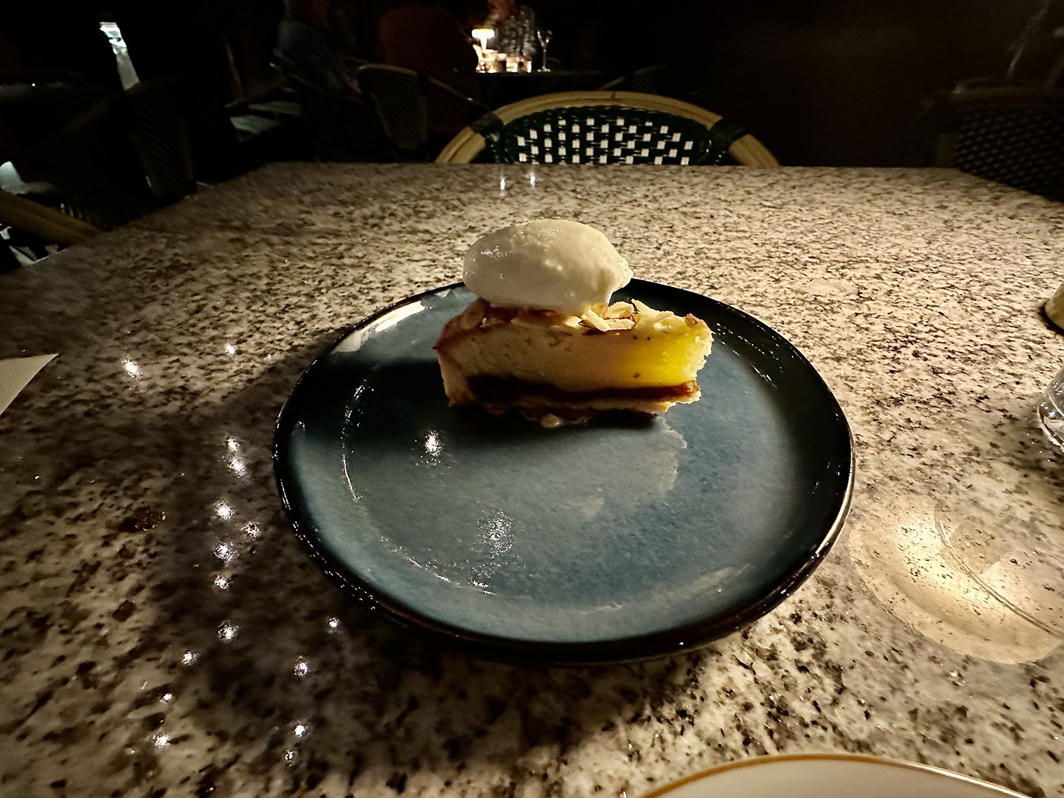 The final dinner item (before dessert) was one of the four items on the main course menu – striped sea bass with capers, jazmin rice and cherry tomatoes. The crusty skin on the top of the sea bass was delicious, as was each of the items included in this dish.