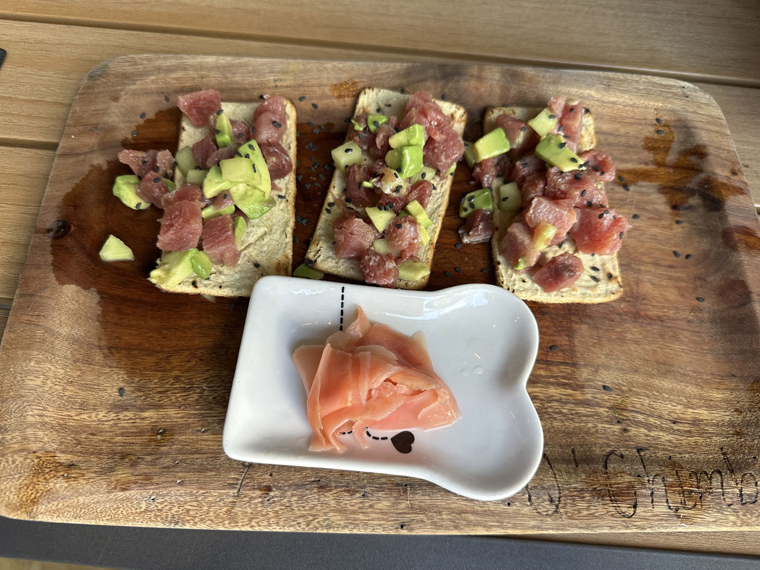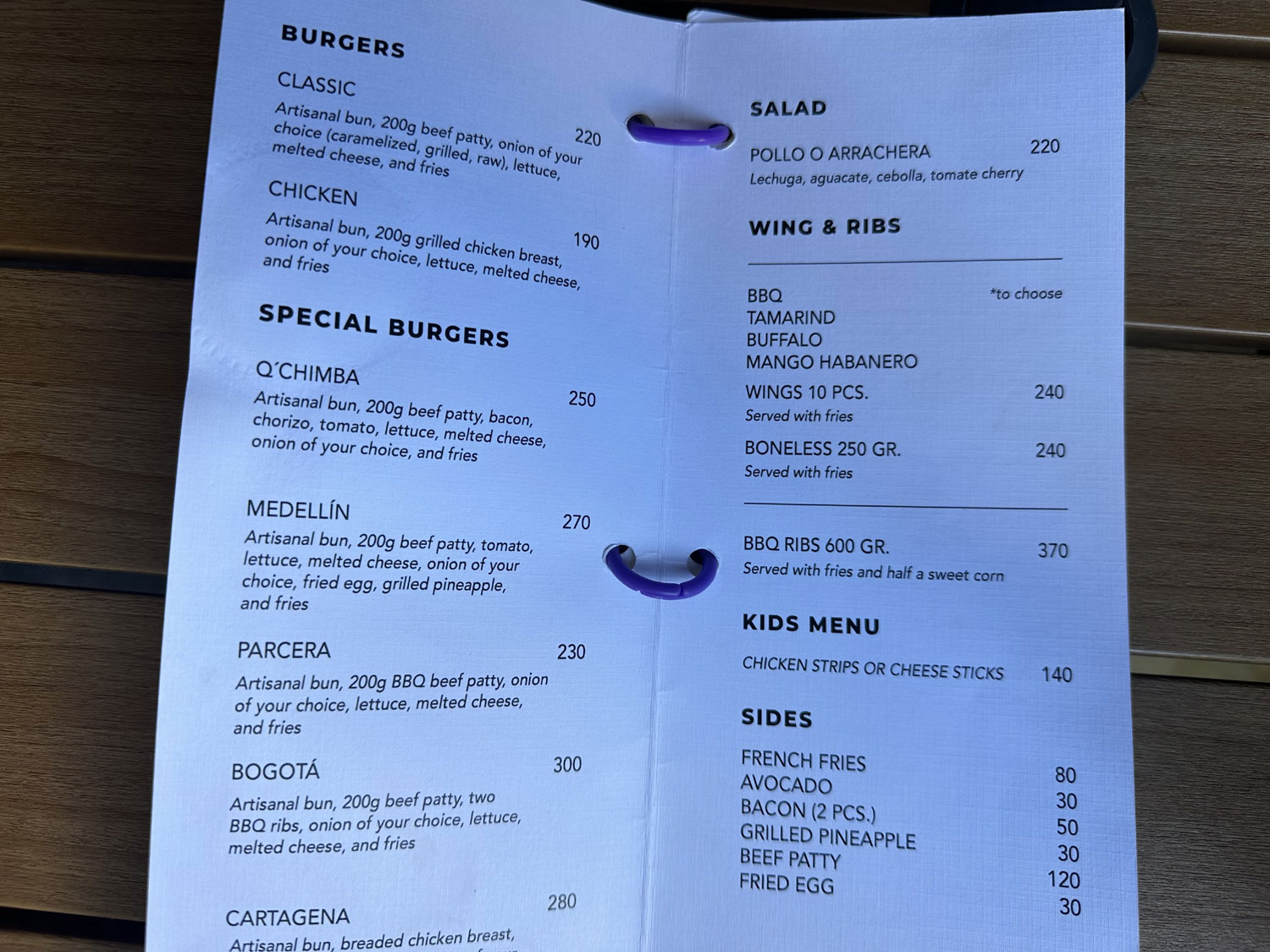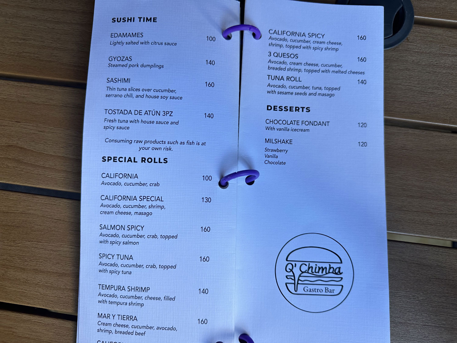 Located right across the street from the entrance to Walmart’s parking lot on Valerio Gonzales is Q’Chimba Gastro Bar. This small two-story restaurant is surrounded by black metal walls. There are dining areas on both the first and second floors, along with a lounge area on the second floor. Entering from the street, there is a bar on the left and the window to the kitchen is at the back of the dining area. The sign on the front of the metal building announces Burgers, Wings, BBQ Ribs and even sushi. The menu is true to the sign. In addition to a breakfast menu, the menu offers Burgers, Special Burgers, Salads, Wings and Ribs, as well as a number of sides. Another page of the menu offers Sashimi, Sushi, Special Rolls and Desserts.