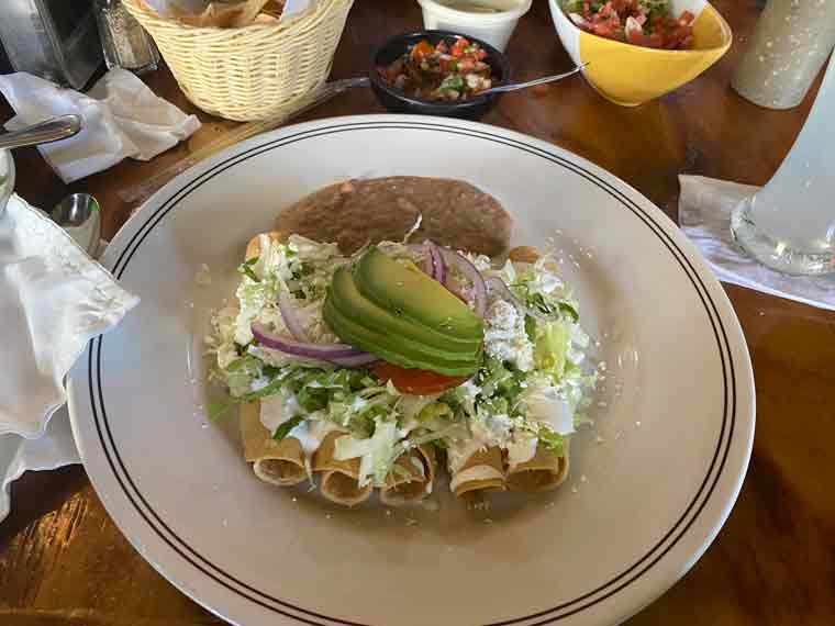 We started our lunch with guacamole that was added to the tortilla chips and salsas that have already been served. Beth ordered the chicken flautas, served with refried beans. Beth said they were very good and took two of the five home. There were five large flautas. I order the plain cheese quesadillas. Much to my surprise, there were three large flour tortillas filled with cheese, served with french fries, pico de gallo, refried beans and avocado slices – all for $95 pesos. They were huge and I took two of the three quesadillas home for two more meals!
