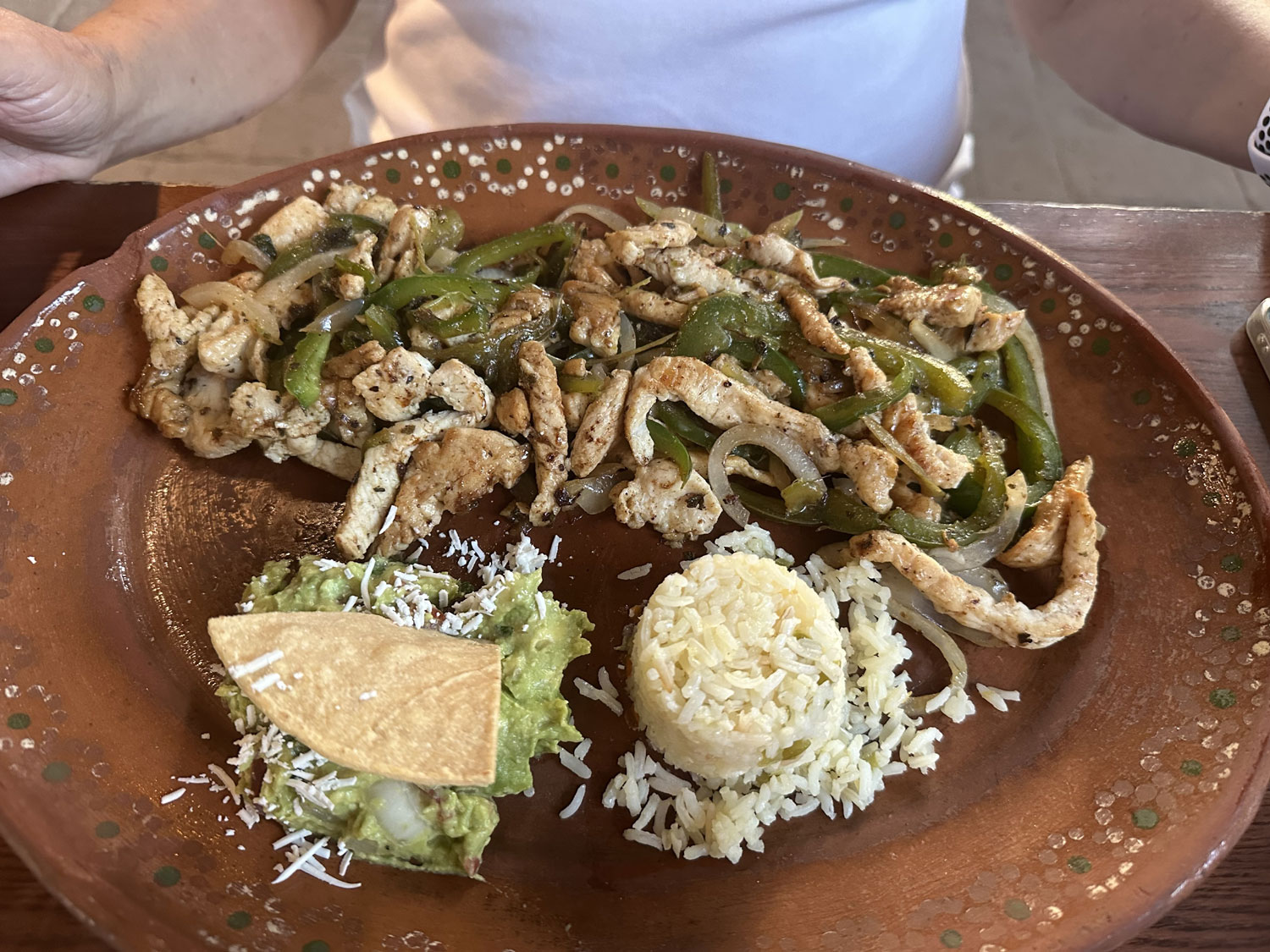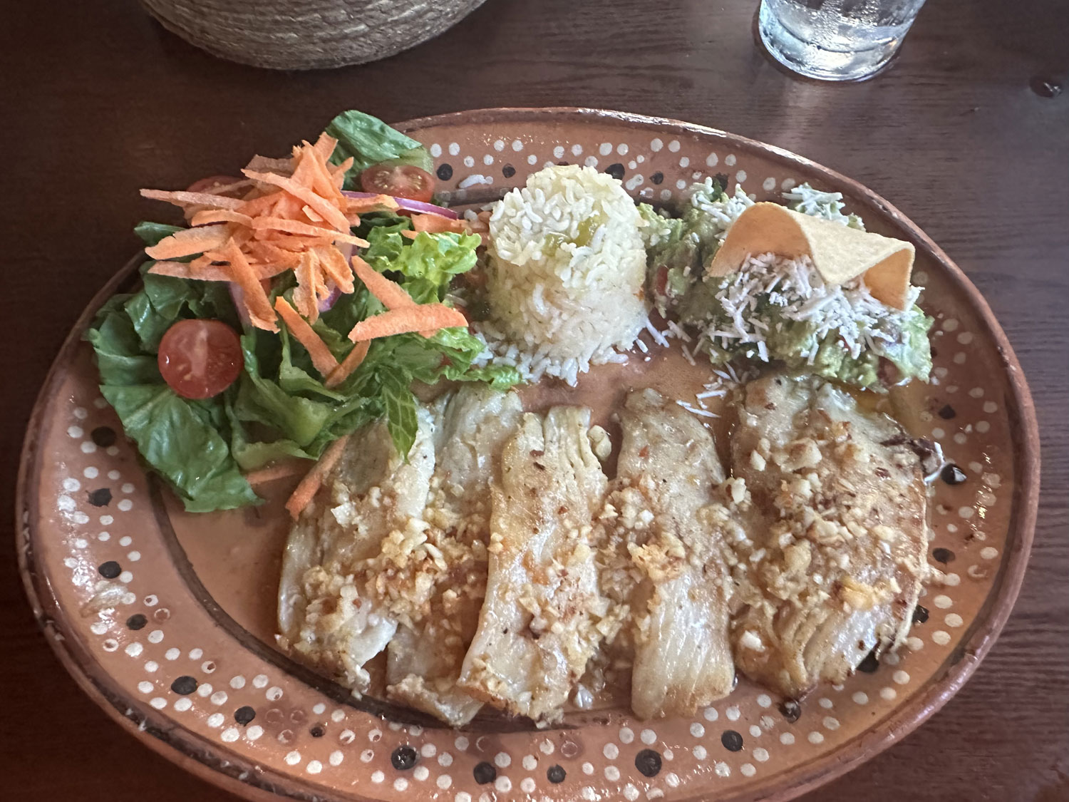 Beth and I went for dinner. As we reviewed the menu, our server brought us tortilla chips with fresh Pico de Gallo and salsa and we ordered our drinks. For a main course, Beth chose the chicken fajitas. The platter was huge with enough chicken and vegetables for a least two people. The fajitas were served with rice, guacamole and flour tortillas. I decided to try the garlic grilled fish. Once again, the portion was very large with five pieces of fish covered with chunks of garlic and served with salad, rice, and guacamole.