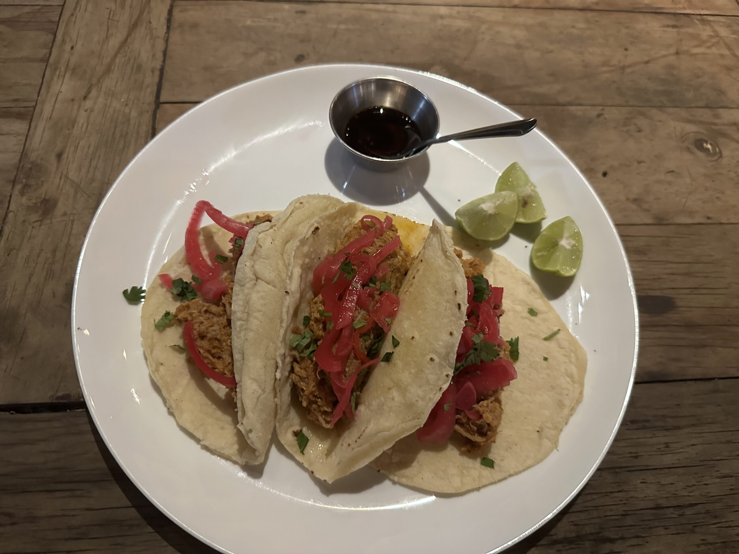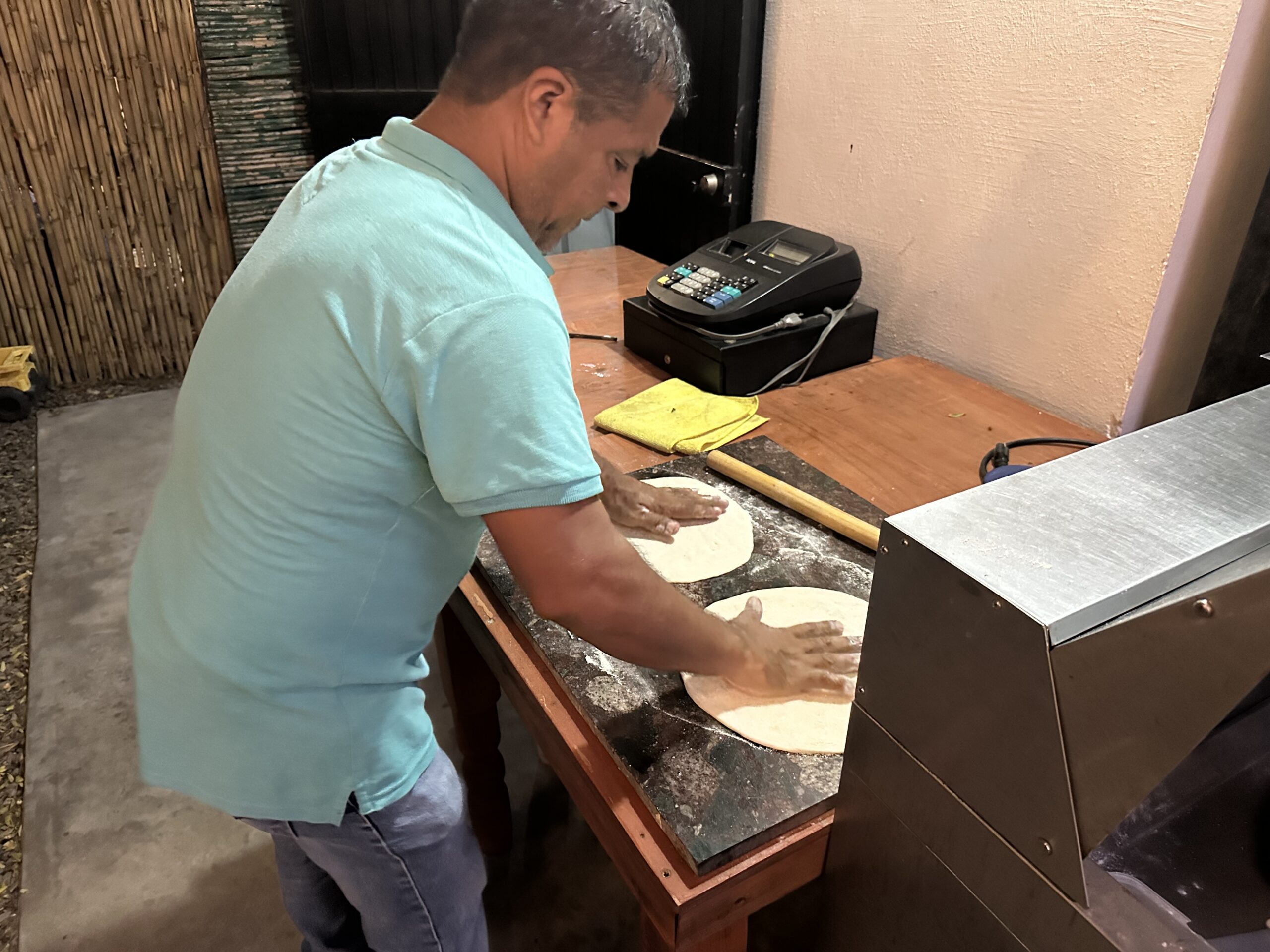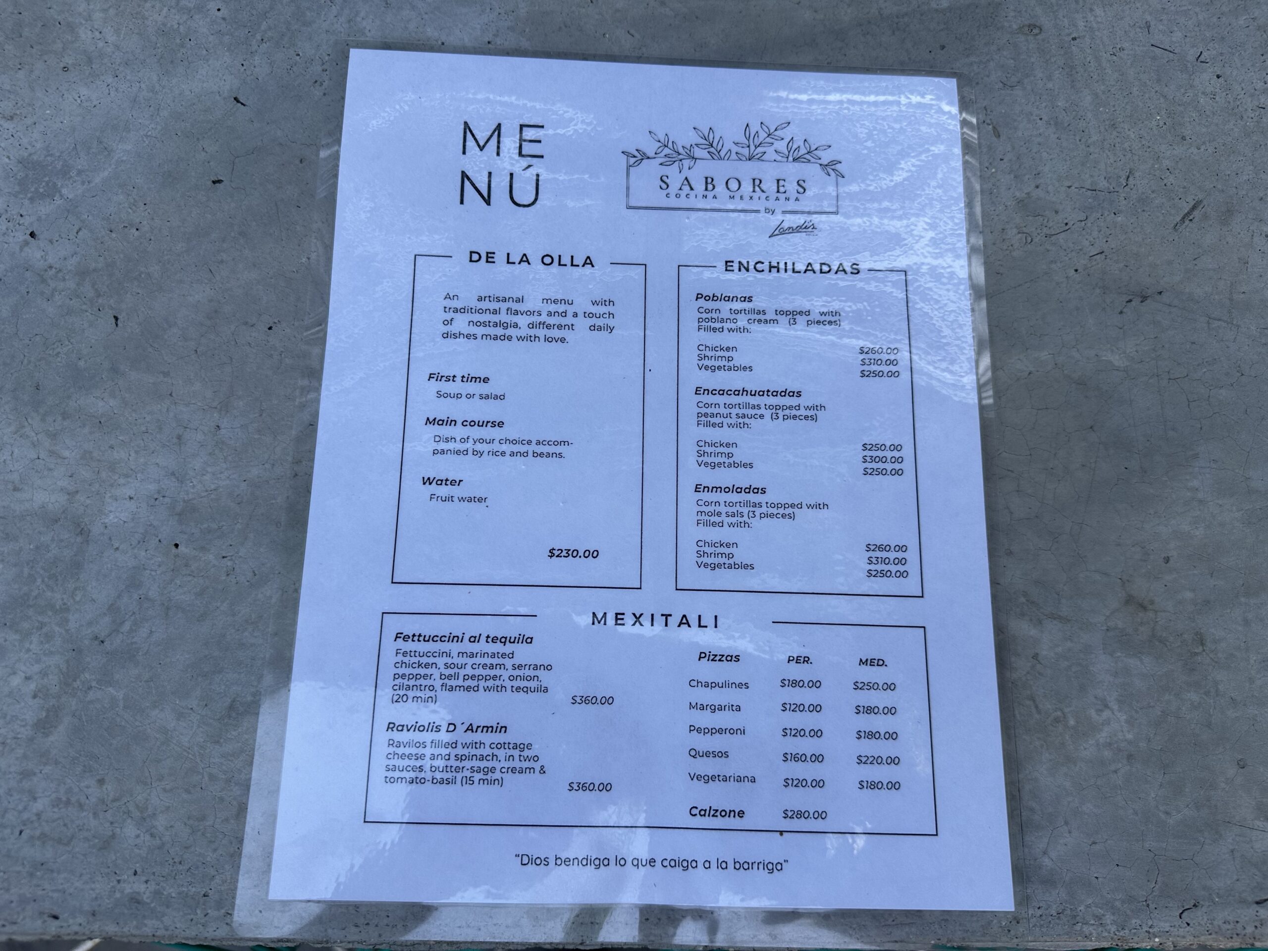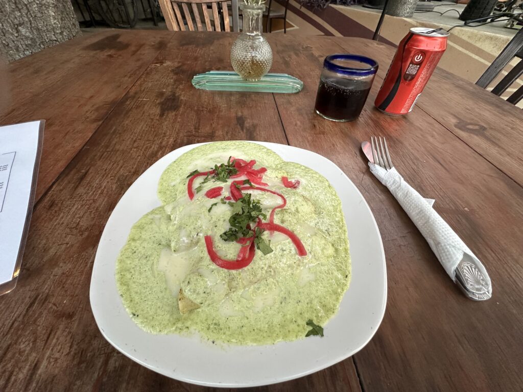 The menu is simple but offers a selection of great flavors. There is a daily special meal, starting with soup or salad and a different entrée each day, accompanied by a flavored water. Three different flavors of enchiladas – stuffed corn tortillas with a choice of chicken, shrimp or vegetables – and with poblano, peanut sauce or mole. Fettuccine, Raviolo or pizza round out the menu. The personal pizza is big enough for two people to share.