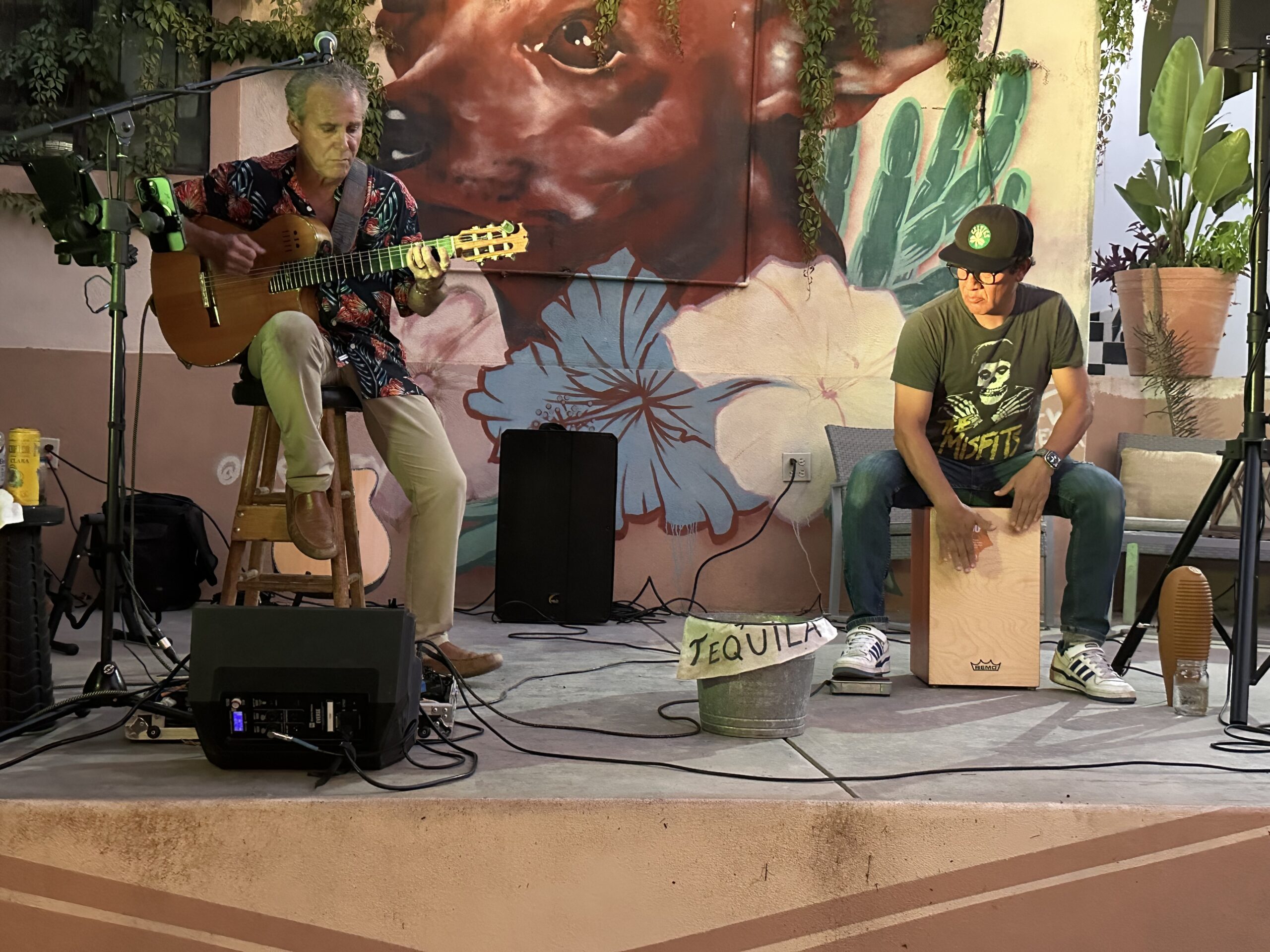 I was at Sabores by Landi’s on a Saturday night and Richard Hastings was there to entertain the customers. He was joined by Jose Lugo on percussion. Richard is an amazing guitarist and vocalist, who lives in Pescadero and performs Spanish and English songs as well as a lot of original music. He started the evening with a Santana instrumental and went on to play for two hours. His repertoire ranges from Spanish guitar, flamenco, jazz, pop, rock, folk and more. It was a great evening.