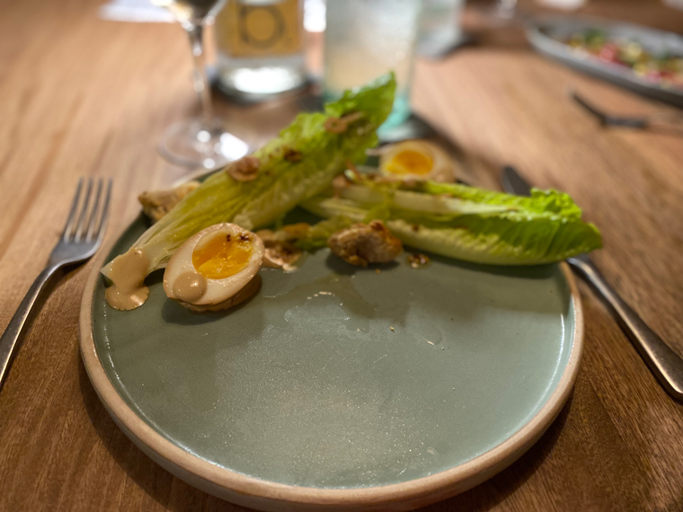 The Romaine Hearts were served with two halves of a hard-boiled egg, garlic croutons and an excellent creamy Caesar dressing. I snuck a taste, and it was very good. My tuna was served with jicama serrano, passion fruit and black garlic oil. The result was a very exciting combination of sweet and spicy.
