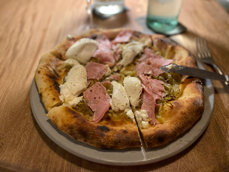 For our main course, Beth ordered the Fugazza Mortadella with fresh burrata, pistachio, oregano, onions on pizza bread. Our server made sure that we were aware that it was pizza. The result was that, while she only ate half of it (and brought the rest home), she said it was her favorite pizza in all of Los Cabos and even better the next day. I ordered the Pork Belly Tortellini with an eggplant-tomatillo sauce, crispy guanciale and mint. The server said that it was his favorite. It turned out to be mine too. It was absolutely delicious.