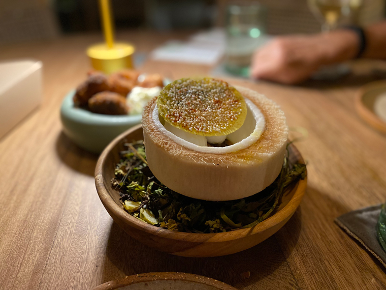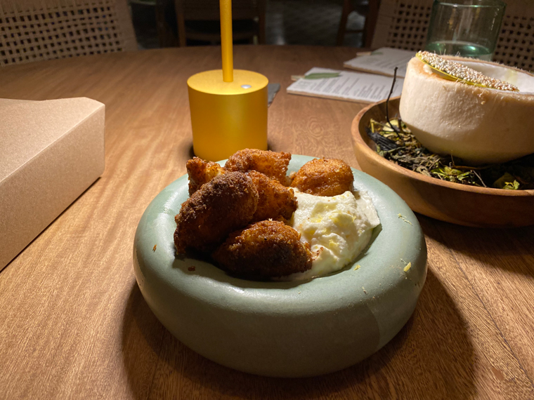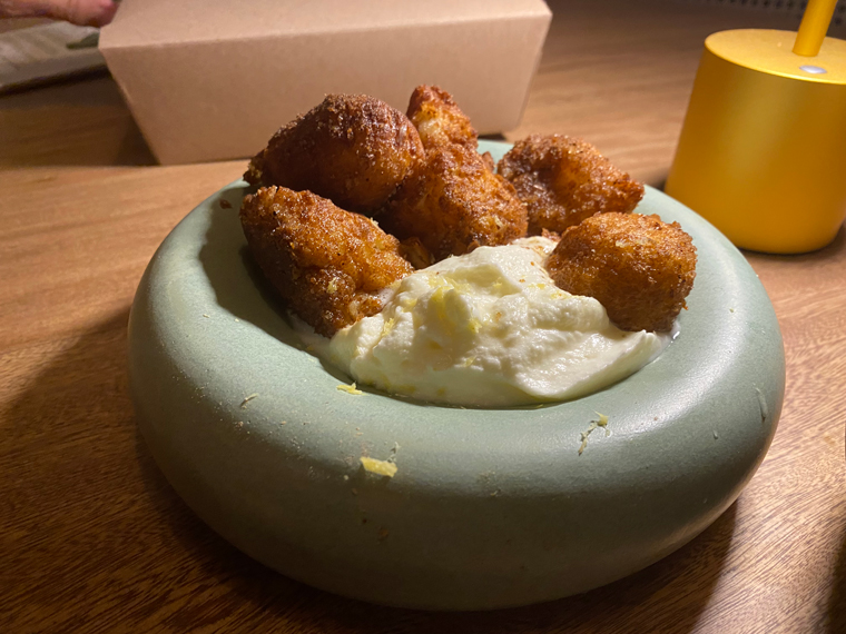 We decided to force ourselves to have dessert and selected two to share. Beth’s choice was the Coconut and Lemongrass Sorbet and mine was the Ricotta Fritters. The sorbet was actually served in a peeled and hollowed coconut with grilled pineapple, saffron juice and flowers crisp. The presentation was amazing and the flavor matched it. The Ricotta Fritters were served with citrus creme fraîche and lavender infused maguey honey and also did not disappoint.