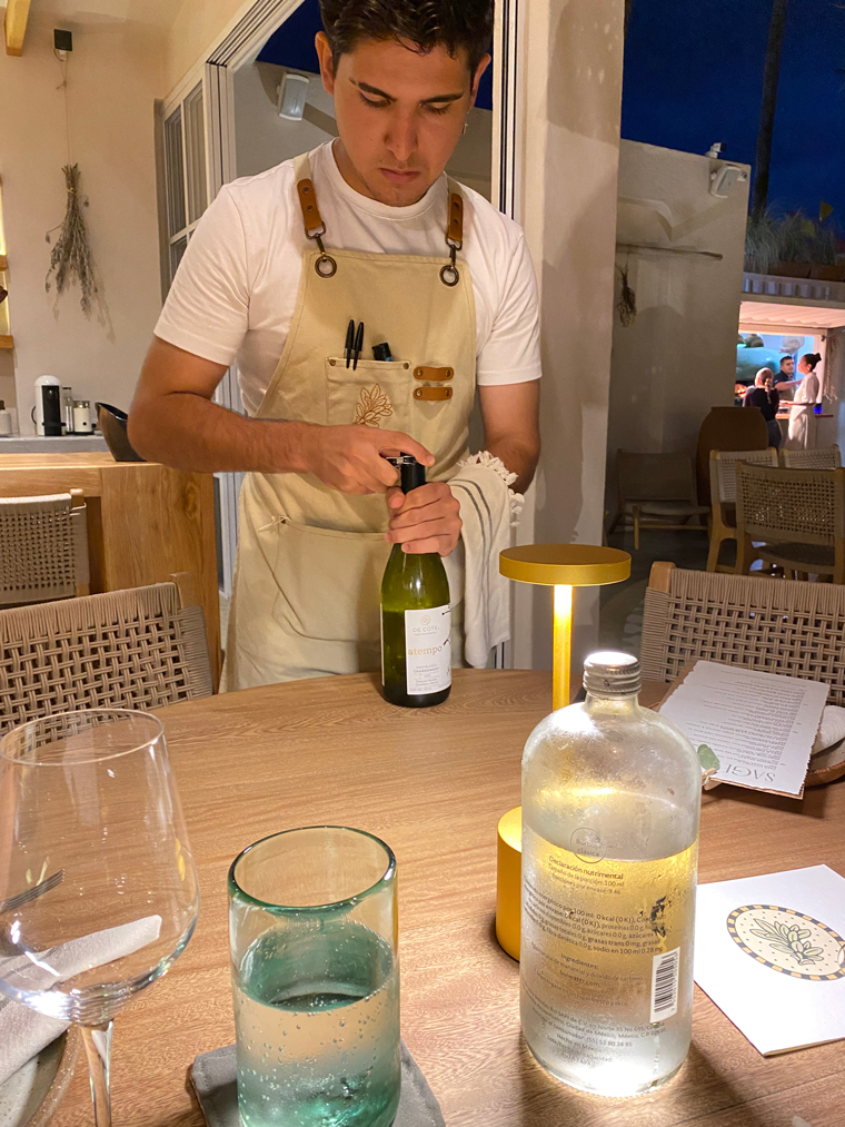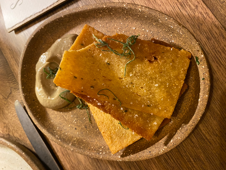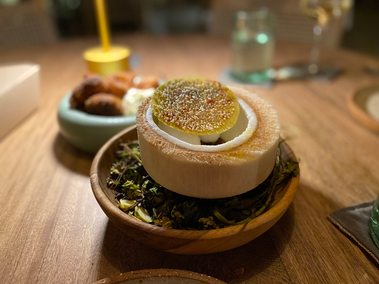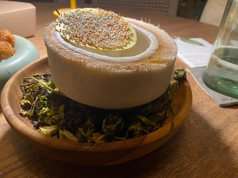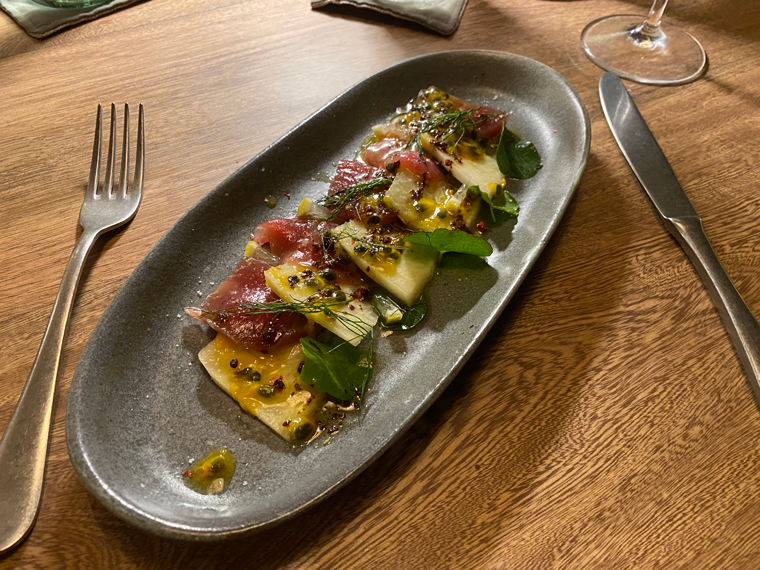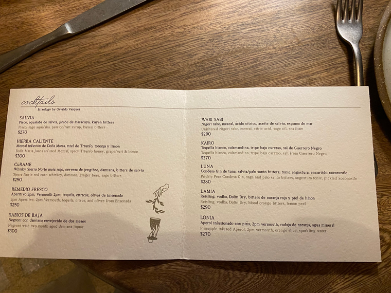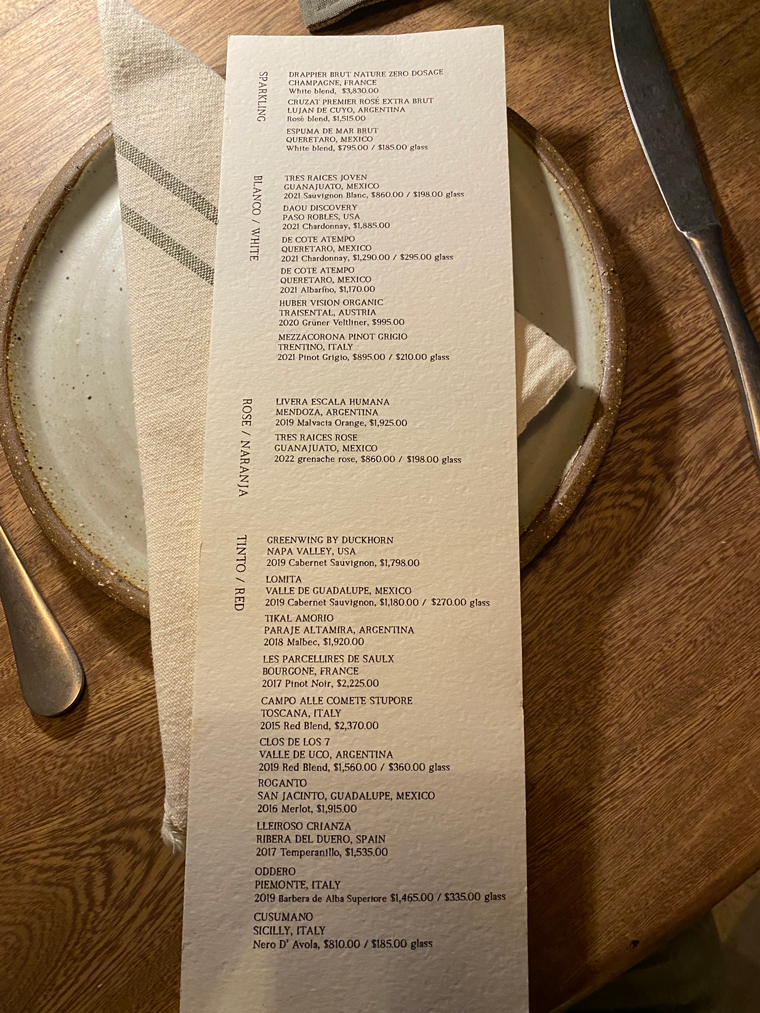 The menu presentation is interesting as it is on high quality scalloped paper on a board with a small clip holding a sage leaf. There were some many interesting choices on a relatively short menu that we had a hard time deciding. Choosing from the long list of appetizers – seafoods, vegetables, beef – Beth selected their Hearts of Romaine Salad and I chose the Tuna Tiradito. While we were waiting for our appetizers, we were presented with an amuse that was delicious and I ordered a bottle of De Cote Atempo Chardonnay from Queretaro, Mexico. It is the first time that I have experienced a Chardonnay from central Mexico – usually I have Valle de Guadalupe wines.