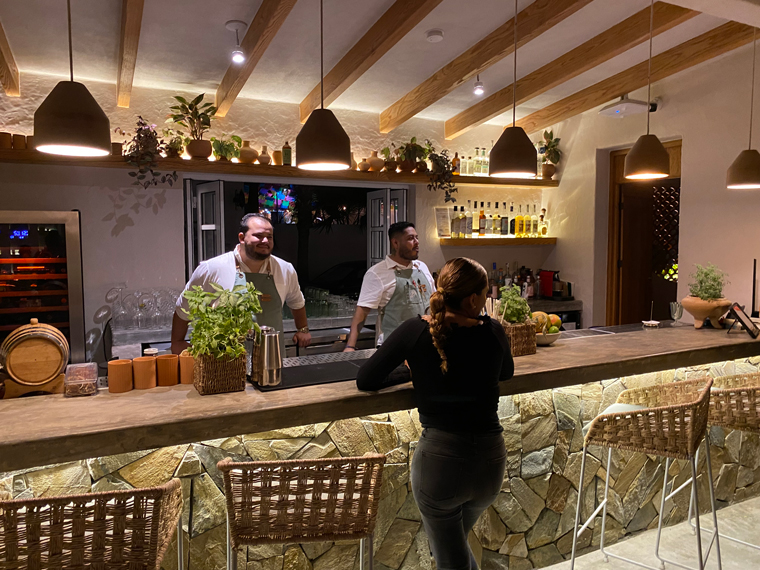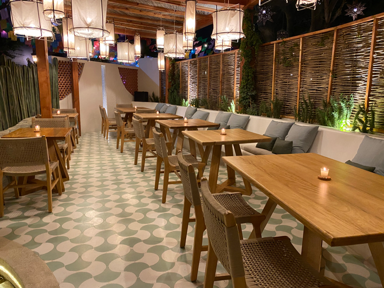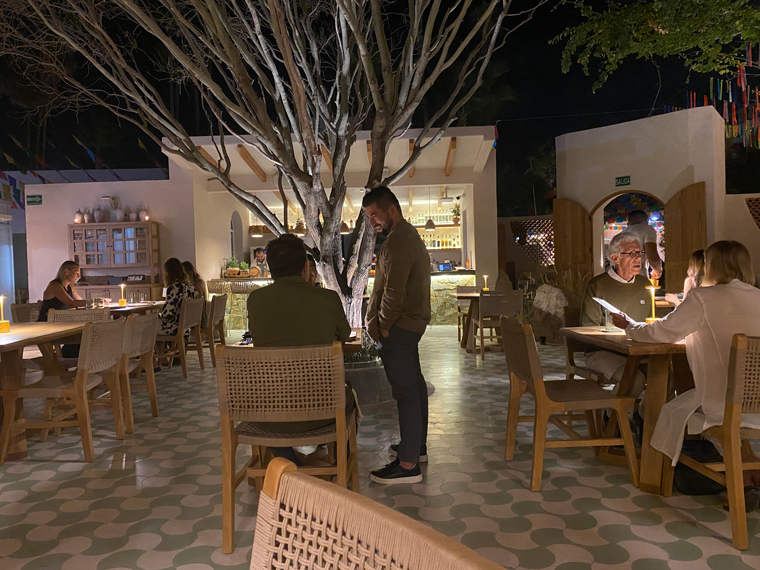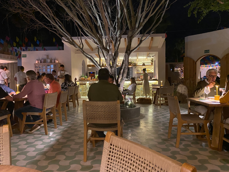 Two weeks ago a new restaurant opened on Jose Maria Morelos across from the El Encanto Inn and Suites on what was a parking lot and grove of trees. The owners have done a stunning job in creating a great environment. As you walk in the gated entrance, the first thing that you see is a large mesquite tree that was transplanted at this location. There are two major sections of the restaurant – an outdoor dining area and a covered dining area with a concrete banquet along the wall. There is also a bar with seats and a lounge area for a drink while waiting to be seated.