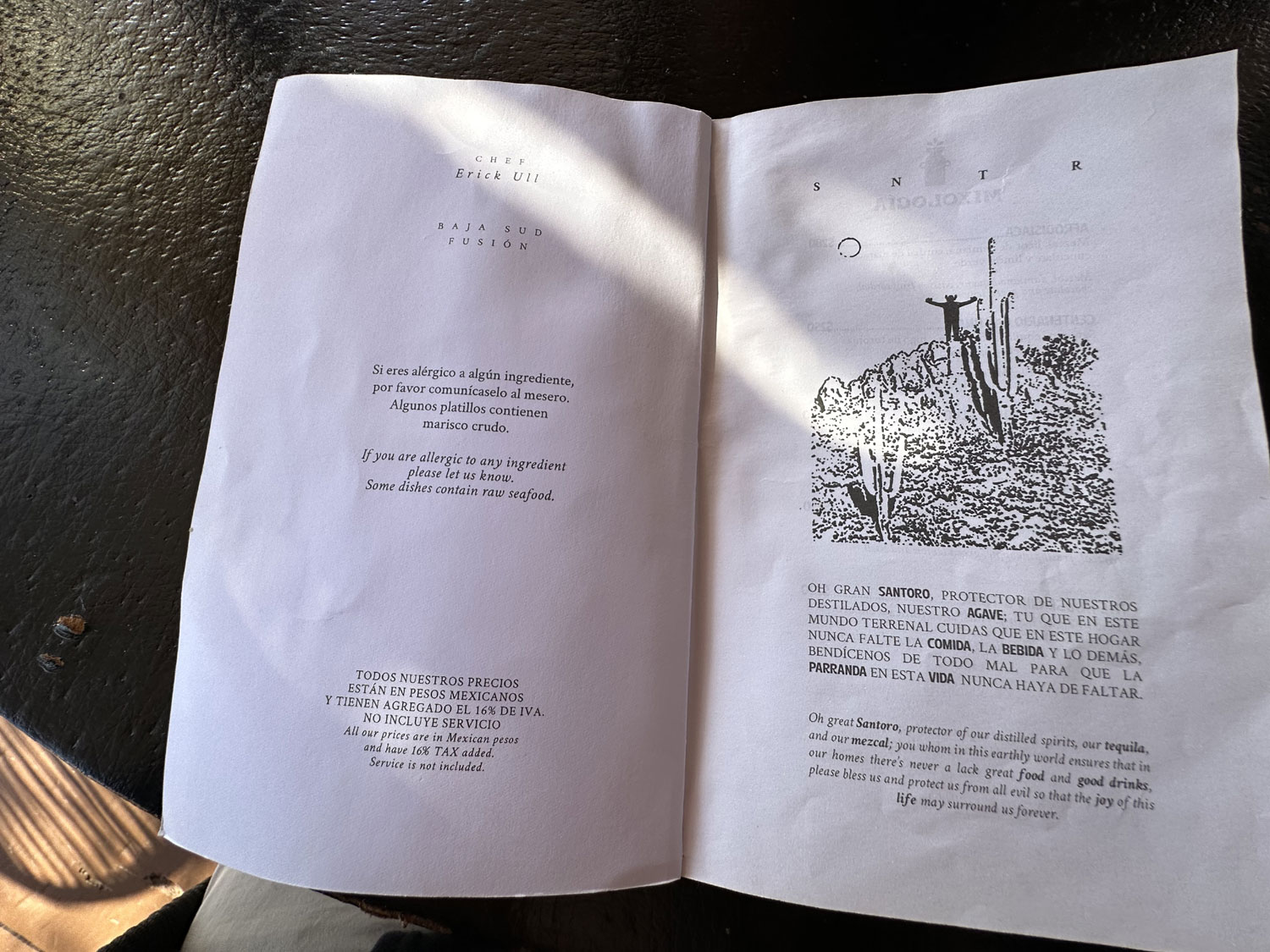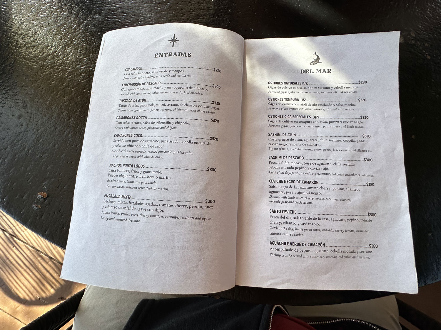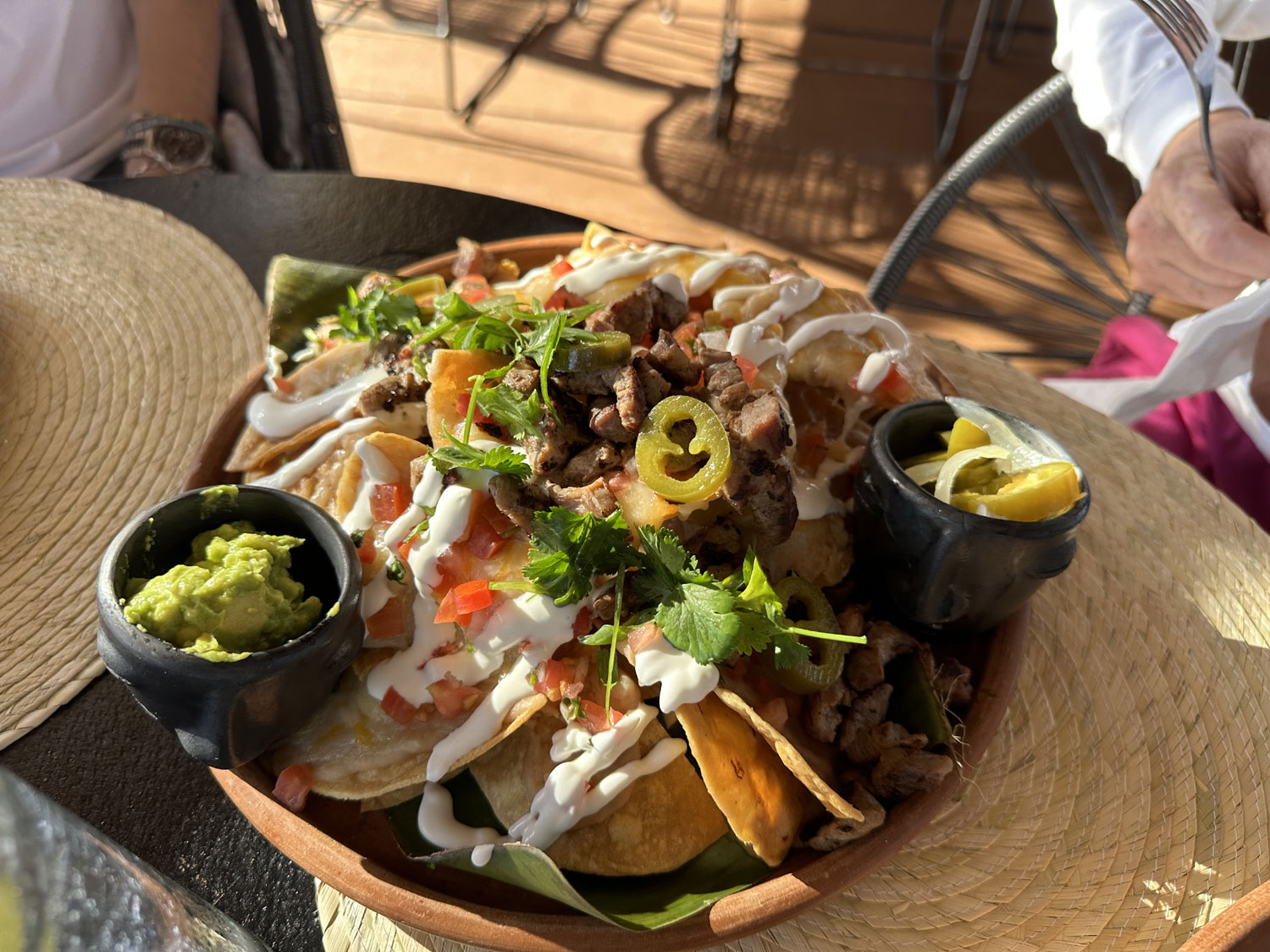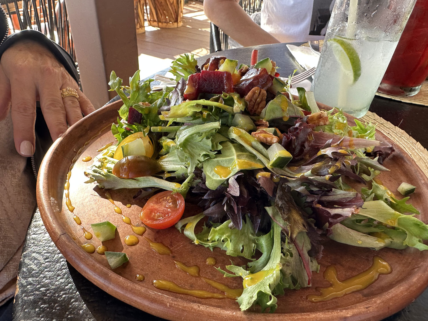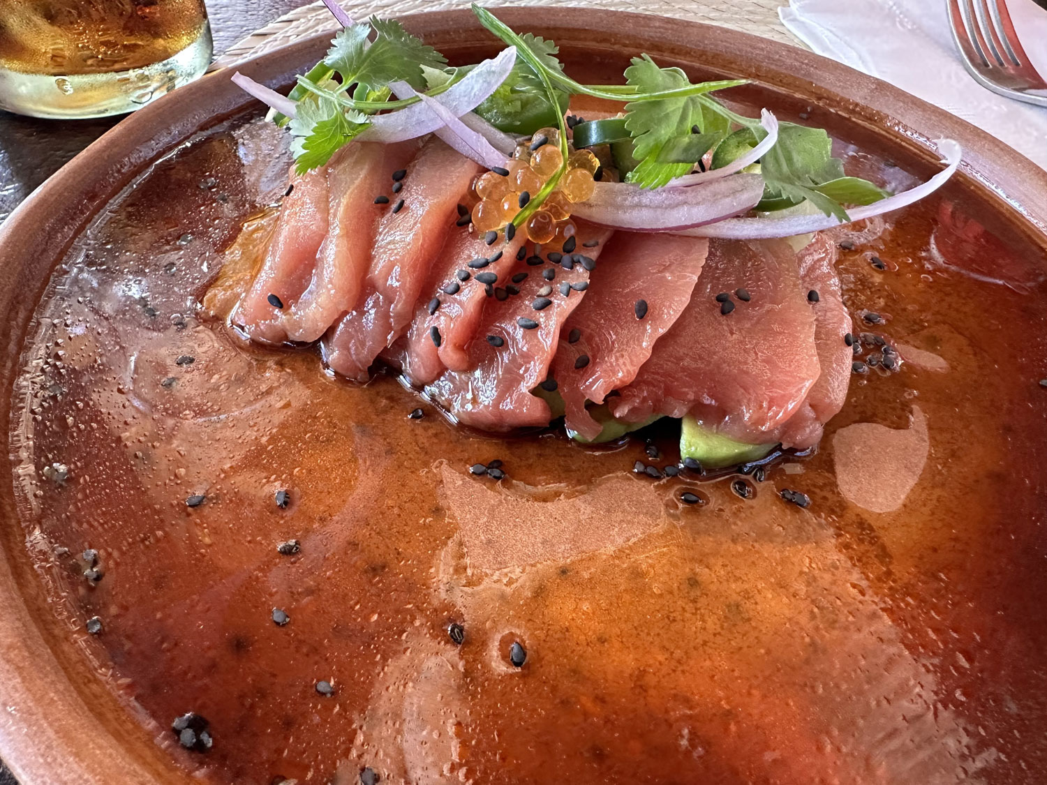 The four of us were looking for a light lunch between visiting galleries as part of the Open Studio Tour in Todos Santos. We were seated in the bar area and offered the menu. The menu was quite extensive with lots of seafood choices in the appetizers, snacks, and main courses. Ranging from guacamole and nachos, to ceviche, burritos, tacos, and sushi to hamburgers and steaks. Eric and Lisa decided to have the nachos to share, which were served with skirt steak. Beth ordered the mixed salad, and I selected the tuna sashimi. The portions sizes were reasonable and the prices moderate.