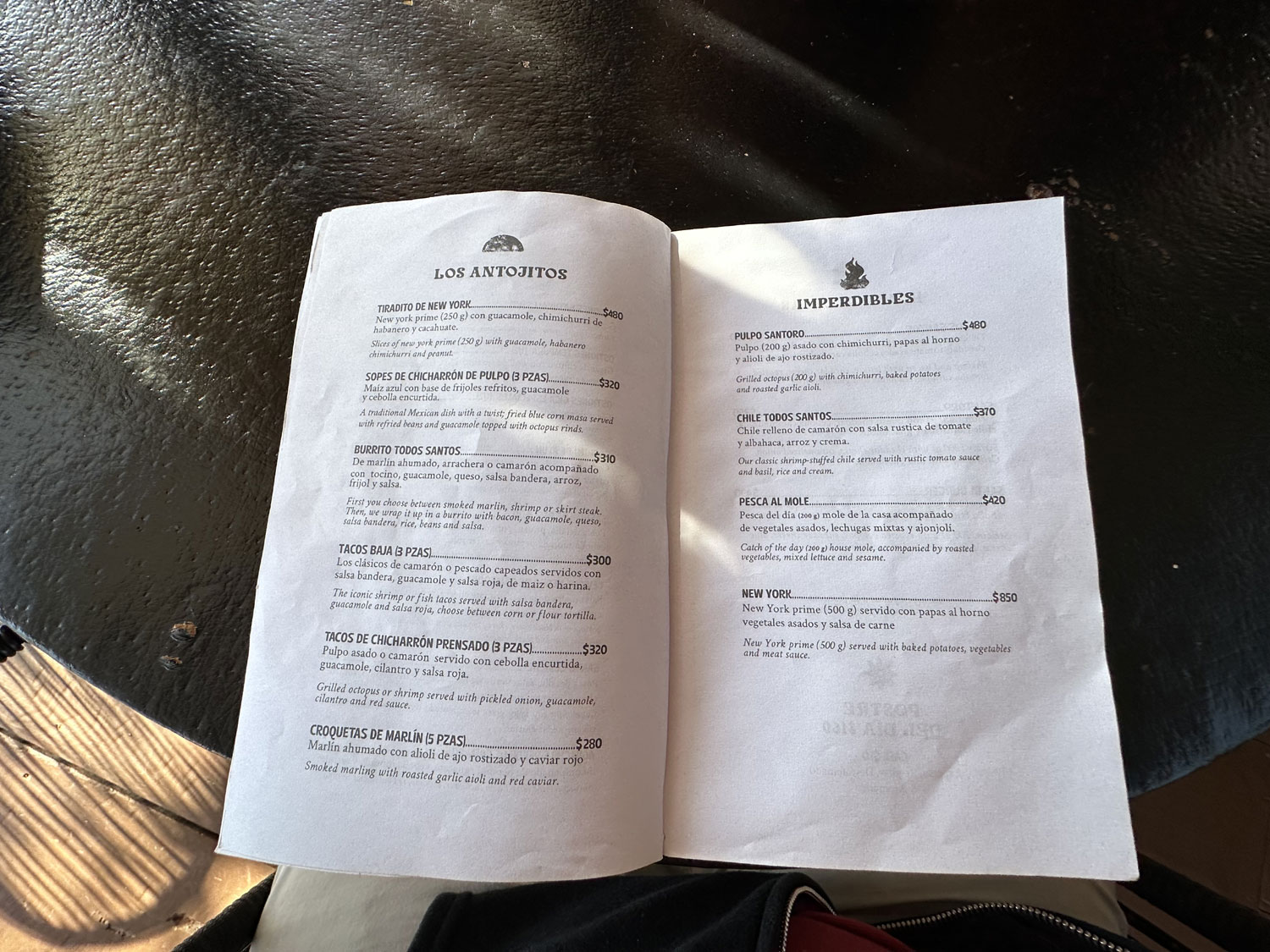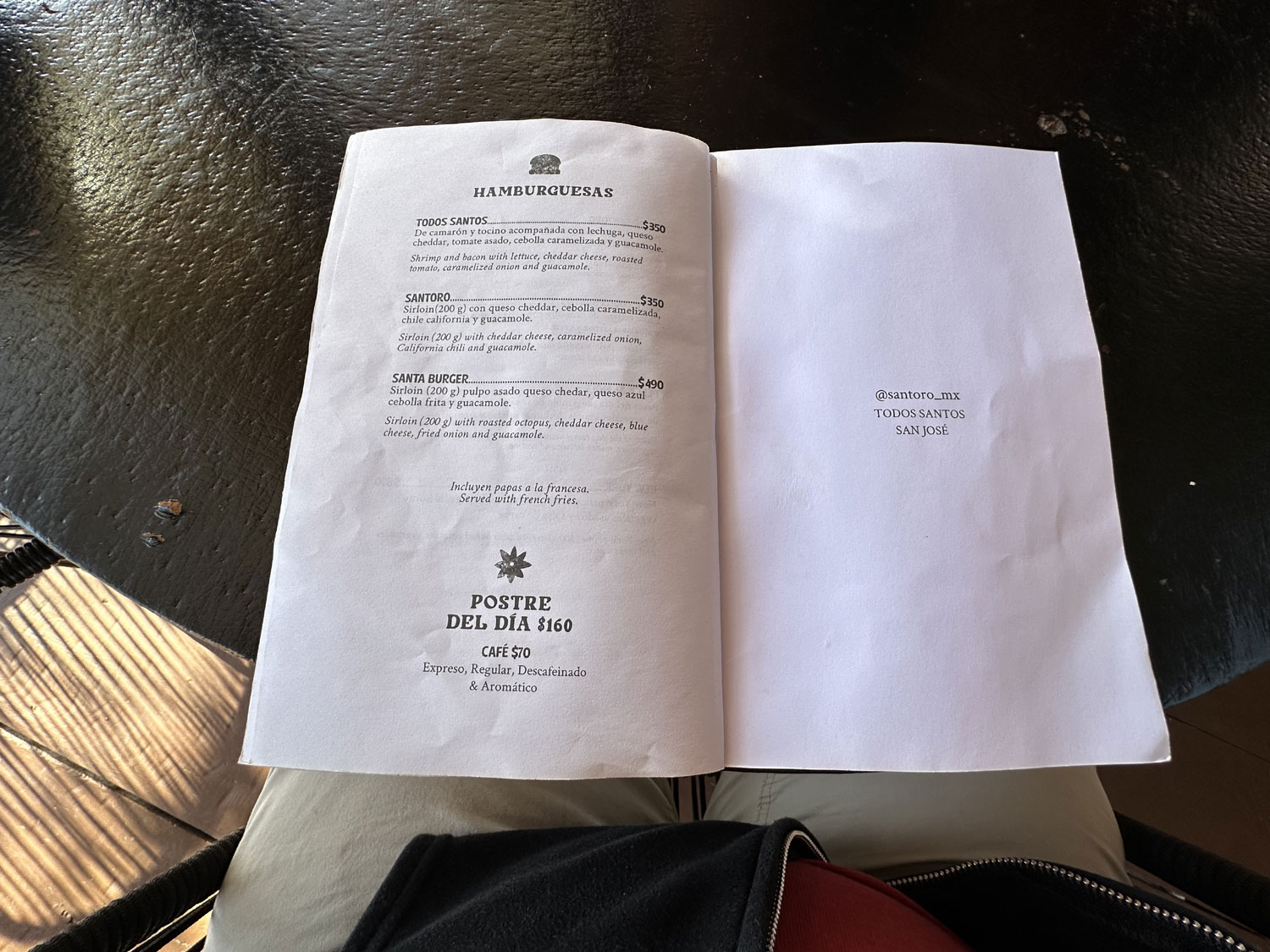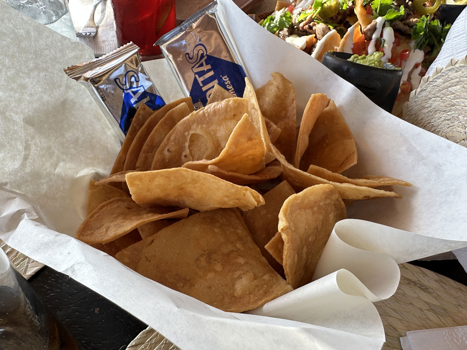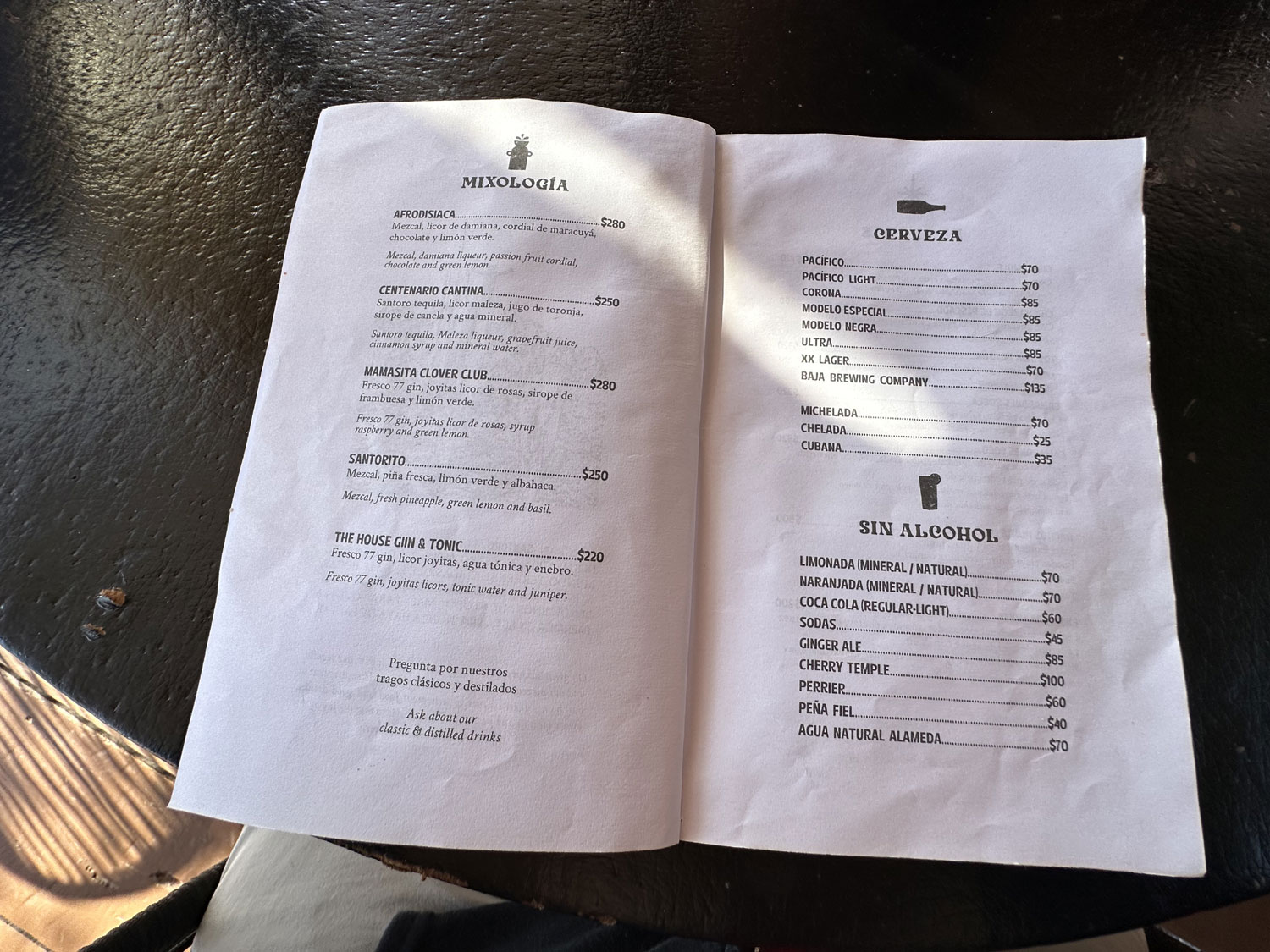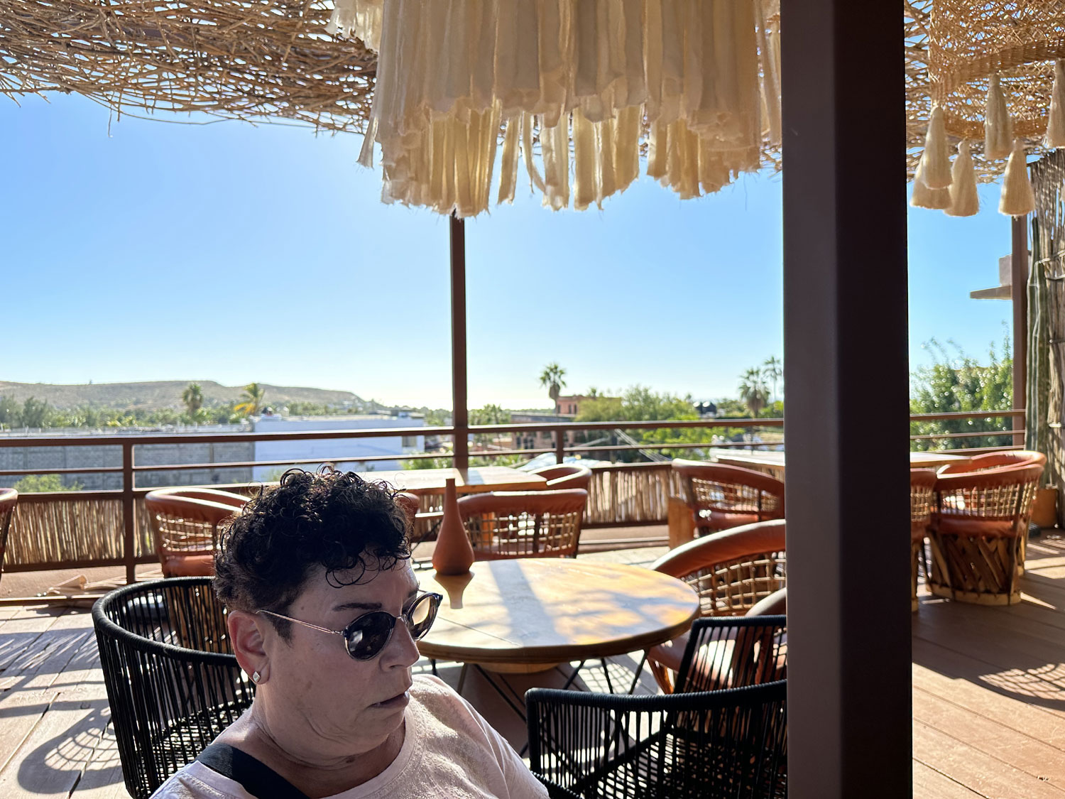 The four of us were looking for a light lunch between visiting galleries as part of the Open Studio Tour in Todos Santos. We were seated in the bar area and offered the menu. The menu was quite extensive with lots of seafood choices in the appetizers, snacks, and main courses. Ranging from guacamole and nachos, to ceviche, burritos, tacos, and sushi to hamburgers and steaks. Eric and Lisa decided to have the nachos to share, which were served with skirt steak. Beth ordered the mixed salad, and I selected the tuna sashimi. The portions sizes were reasonable and the prices moderate.