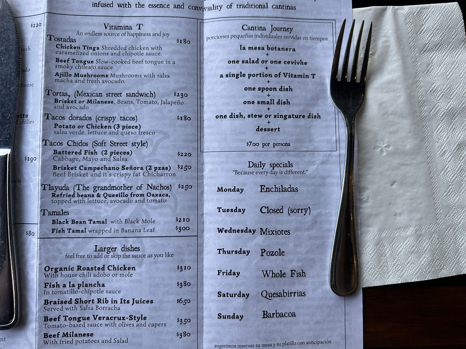 The menu at Senora Cocina Casa & Cantina reflects JP’s desire for a cantina style menu. It starts out with Botanas Cantineras – tortilla chips and six different salsas to warm up your palate before your main course. This incredible spread is complimentary to the restaurant’s diners, and has a great range of flavors to enjoy with the tortilla chips. The appetizer menu includes salads, soups, ceviche, and crudos. For more main courses there at Tostadas, Tortas, Tamales, Tacos and Tlayuda (nachos), as well as bigger dishes – chicken, grilled fish, short ribs, breaded beef, beef tongue, and grilled fish. There is also a daily special for every day except Tuesday, when they are closed. The special the night that we were there was lamb barbacoa, prepared in salt for six hours and then baked for four. The menu also makes it clear that they have 100% plant-based alternatives with a completely separate kitchen, guaranteeing no cross contamination for their vegetarian and vegan guests.