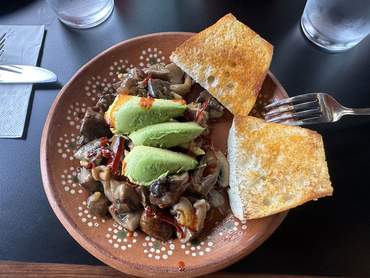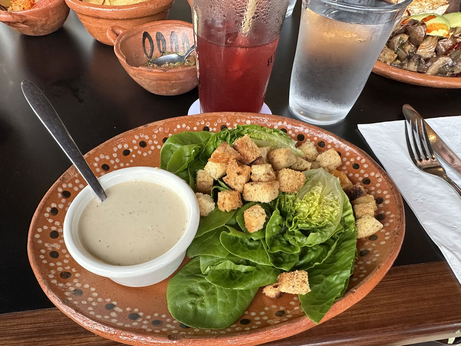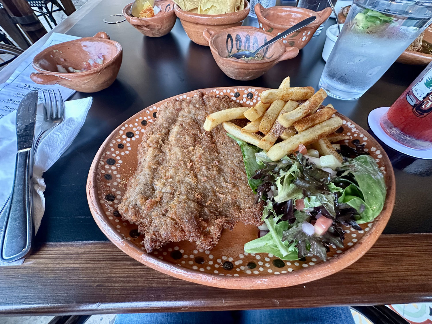 Even with the amazing complimentary starter of tortilla chips and six salsas, we decided to order appetizers. Beth ordered the Caesar Salad and I selected the garlic mushrooms – I love grilled mushrooms. Both were very tasty. For our main courses, Beth chose the Beef Milanese, which was served with French fries and salad. The portion was so large that about half of it came home with us. I snuck a taste and it was delicious. I decided to try the special of the day – Lamb Barbacoa. The pile of barbacoa was not only huge but the lamb was juicy and the flavor amazing. It also came with a bowl of lamb broth, which I finished completely. I also ended up taking home more than half of my barbacoa – it could have easily fed two people.