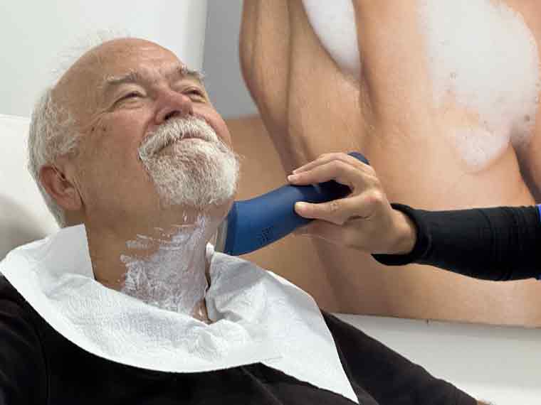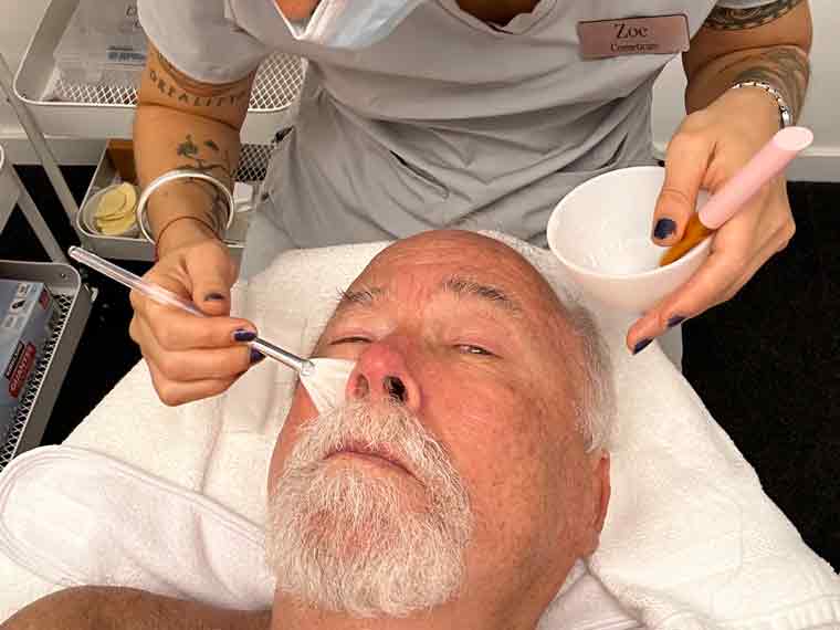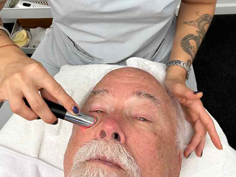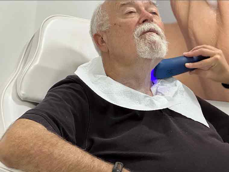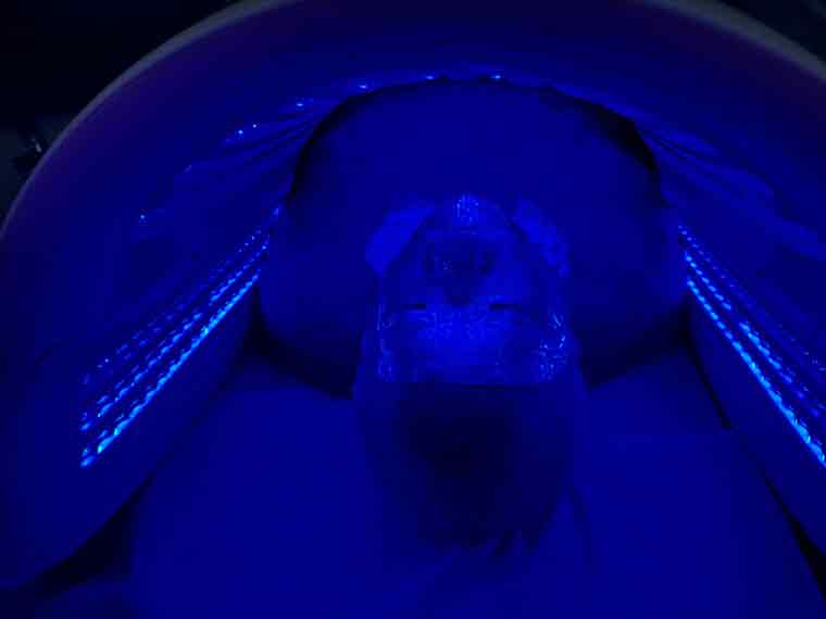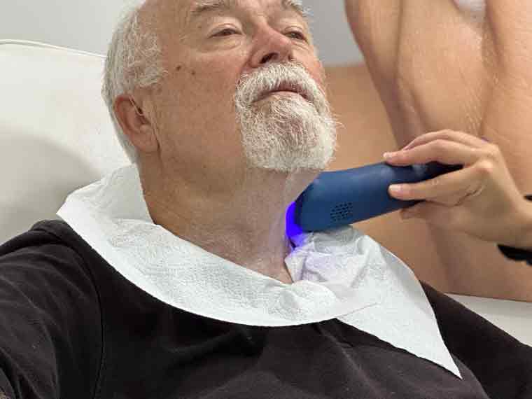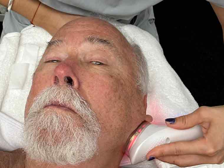 Our second experience with an LED device was at Royal Bee Spa on the marina in Cabo San Lucas. This time it was a demonstration of the Sapphire X Blue LED light device by Zero Gravity. Unlike the Red LED light device, which reaches down into the hypodermis level to stimulate collagen and elastin production, the Blue LED light technology is designed to treat the epidermis – the outer layer of skin – improving texture, treating blemishes, brown spots and to reduce sebaceous hyperplasia (enlarged oil glands). Both my wife and I had our necks treated with this device. Beth noticed that the bumps on her skin on her neck had been reduced dramatically.