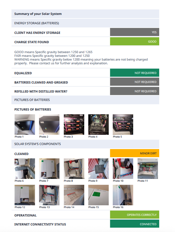 Like any other complex system, it is important to undertake period maintenance of your solar system. What does this include: cleaning the solar panels; cleaning the electronic equipment; checking internet connections for remote monitoring; updating firmware on the inverter and battery management system; checking the temperature in the room where your solar equipment is installed.