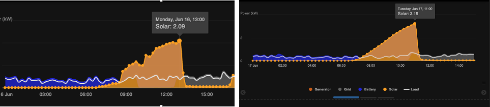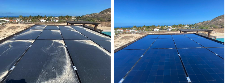 We have regular maintenance every two months for our system. The After Sales Service team van arrived with three staff from Innovacion Solar. Two of the team went to the three-floor deck to clear the solar panels. Water was sprayed on the panels and then squeegeed off. Then, the two workers put fabric over the end of their poles and dried the panels. Dirt on the panels can make a significant difference in the performance of the system. In this case, the maximum kW absorbed went from 2.09 to 3.18 the next day. This makes a real difference in how long it takes for the batteries to recharge. The other team member went into our solar room to check the electronic equipment – inverter and batteries. The next day a complete report was sent to me by email on the status of all of the components of the system with photos. The report also included detailed photos of each component of the system.