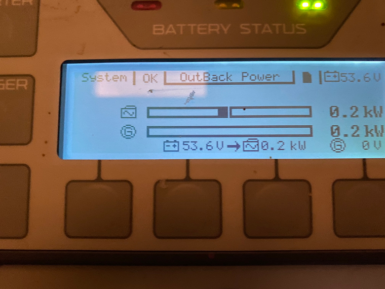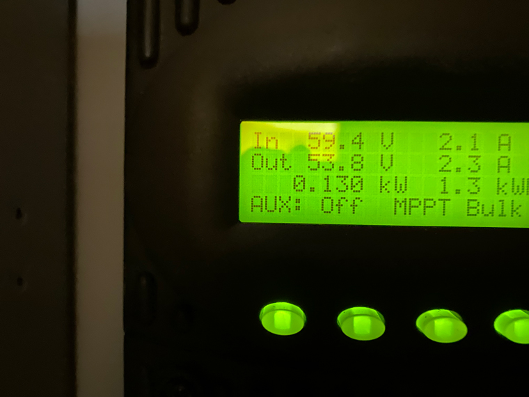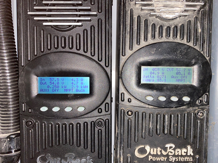 Our lithium-ion batteries charge on GLARE alone. As long as there is a glare coming through the clouds, these batteries will charge. The full charge on our 48V system is 55.2 volts. One day, we reached 54V and during the four days, we charged to 53.6 V on the other days. Consequently, we never had to start the generator. This is an AMAZING benefit of lithium-ion batteries. They start to charge immediately as long as some light is hitting the panels, without a need to go through the bulk, charge and float process required by lead acid batteries.