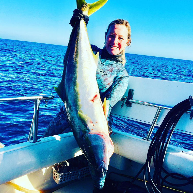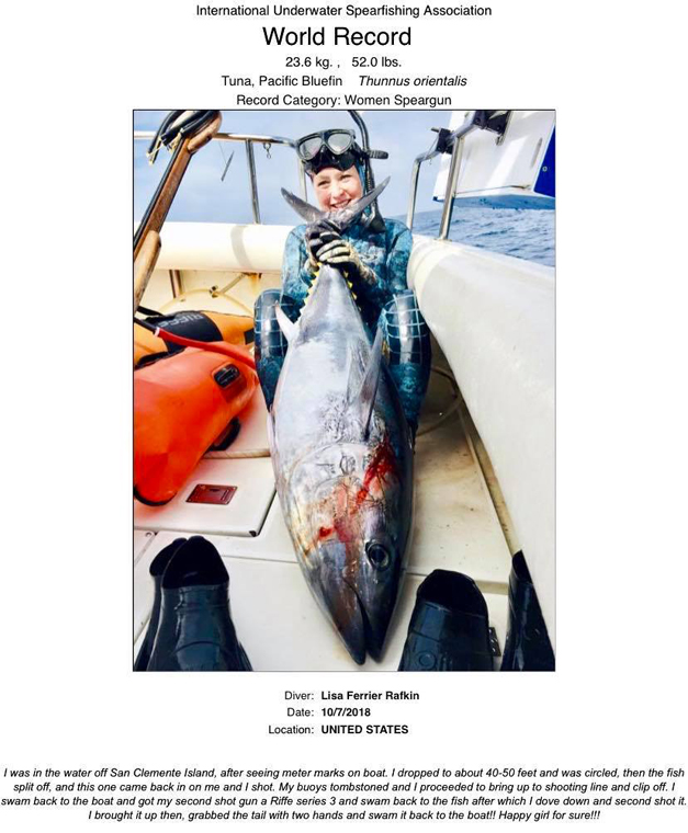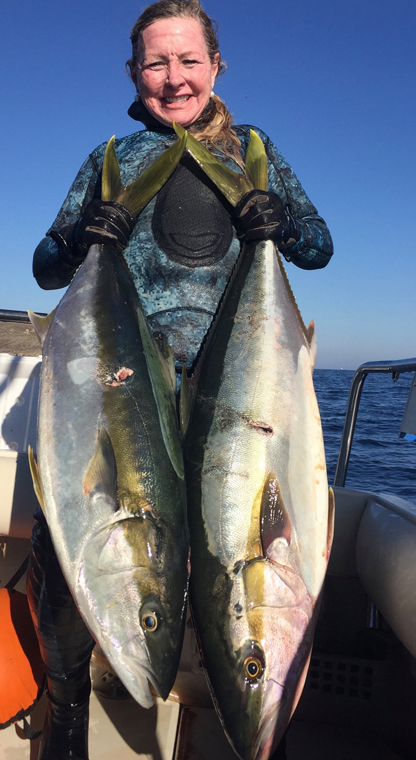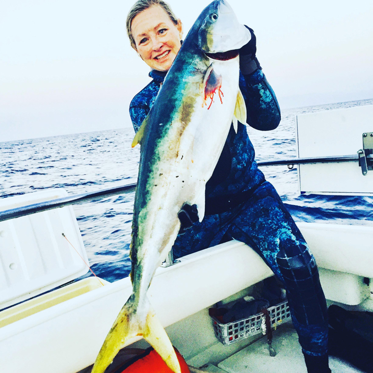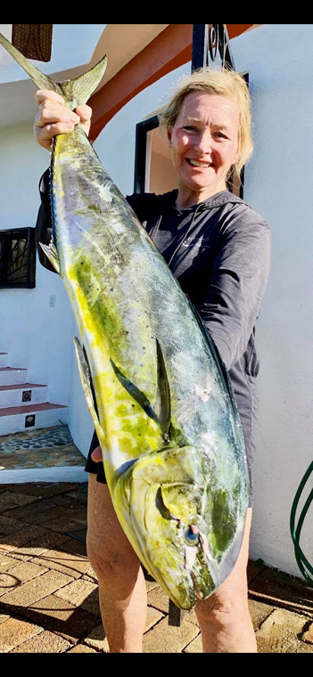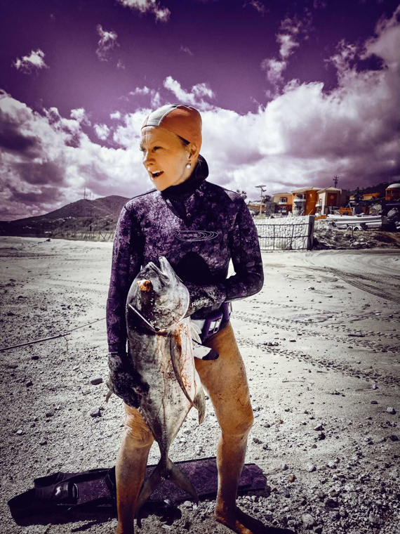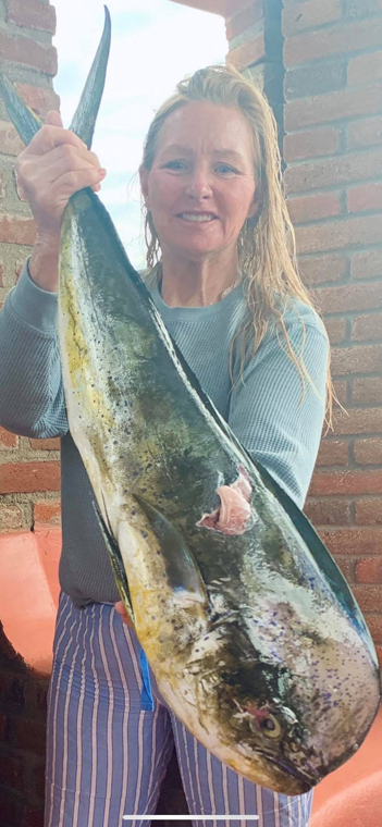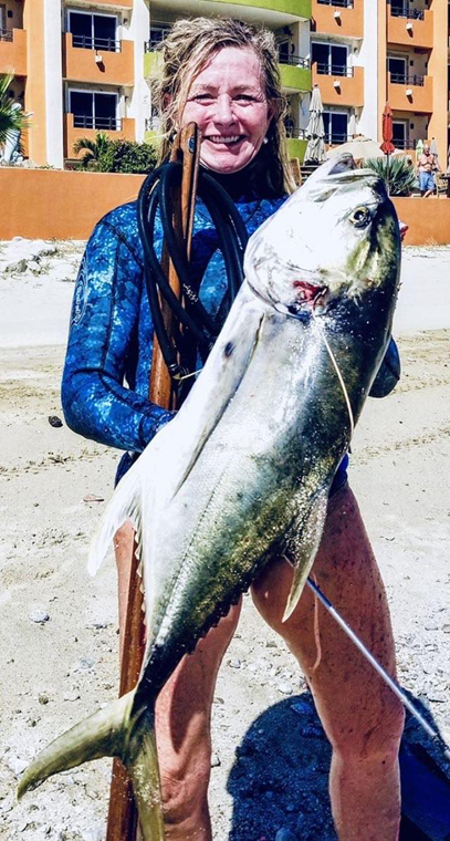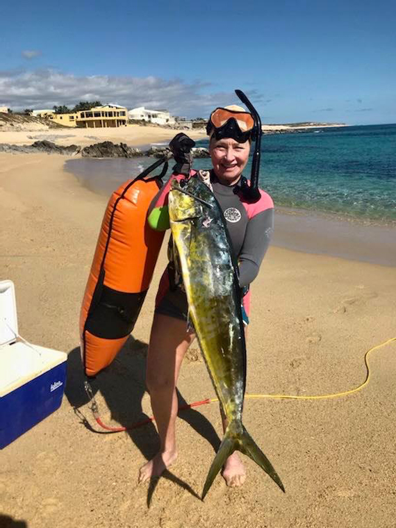 Back to the spearfisher on our beach.  It turns out Lisa Ferrier, a resident of Zacatitos holds the International Underwater Spearfishing Association Women’s Speargun World Record for the largest Bluefin Tuna – 52 pounds from October of 2018.  She is a self-described addict, going out almost everyday and regularly bringing in bluefin tuna and dorado.  She said that she makes sure that everything that she spears is being eaten – it is not just a sport.  Describing deep water spearfishing, she said that when they see a school of fish, she just drops over the side and dives down and waits for the fish to go by.  I doubt that it is really that simple!  A recent article in Spearfishing magazine indicates that Lisa has set eight World Records for Women’s Spearfishing at 56.  What is amazing about this is that she has only been spearfishing for three years – although a lover of the water since she was very young.  Her husband, Rocky Rafkin has been spearfishing for 50 years.  When they met (a second marriage), it was clear that it was a spearfishing match made in heaven.  Rocky explained to me that spearfishing is more like hunting than it is like fishing.  He said, “You have to find the refrigerator.  Sooner or later everyone ends up at the refrigerator to get something to eat.”  In other words, spearfishing involves searching out where the bait is that your chosen fish is interested in.  You can’t chase the fish, they have to come to you. And her children are proud of her appearing in and being featured in Spearing and Spearfishing magazines.