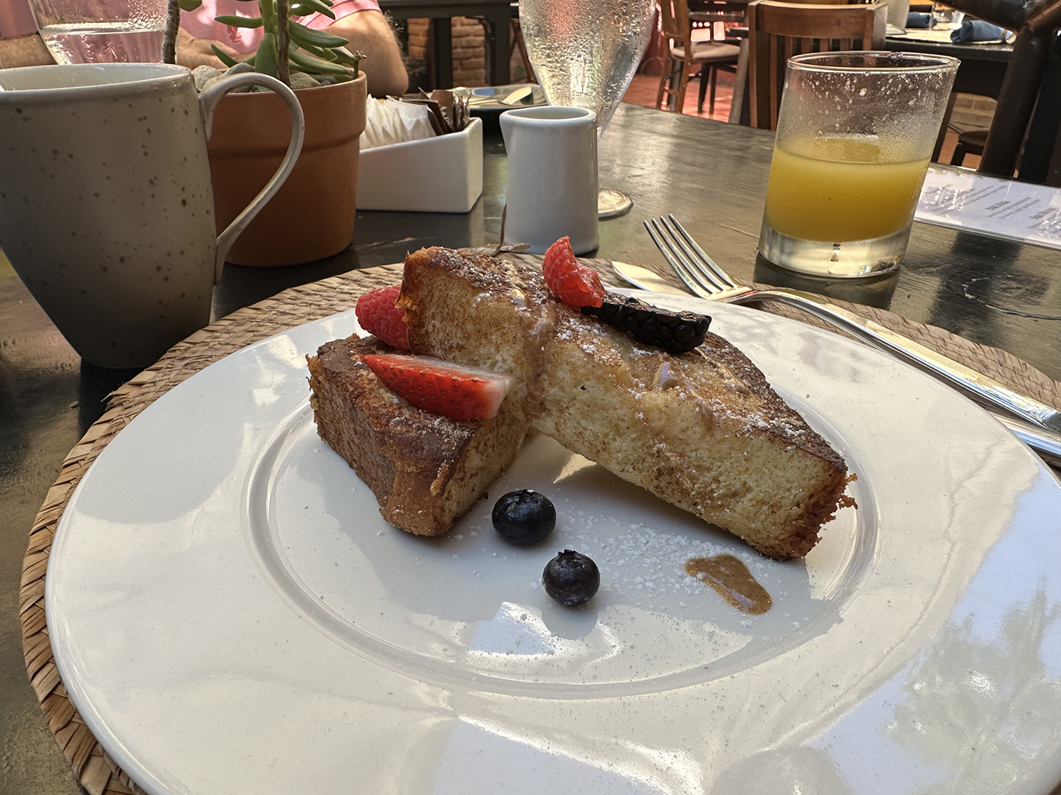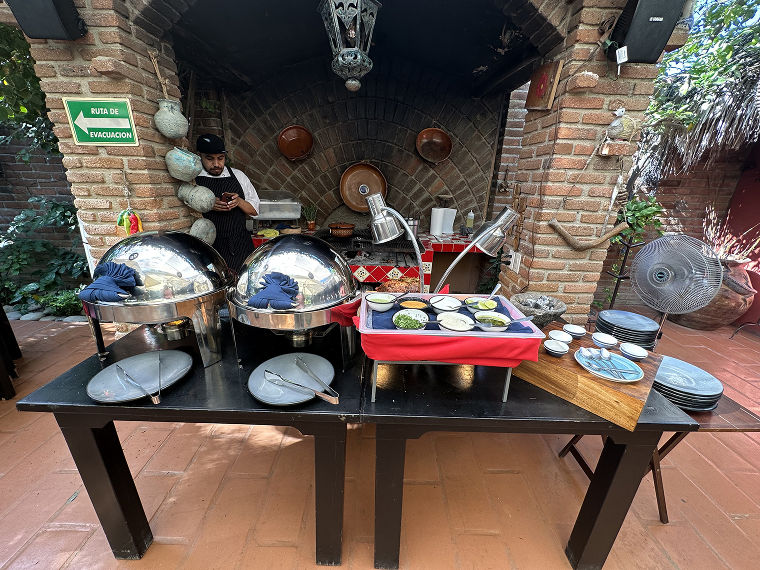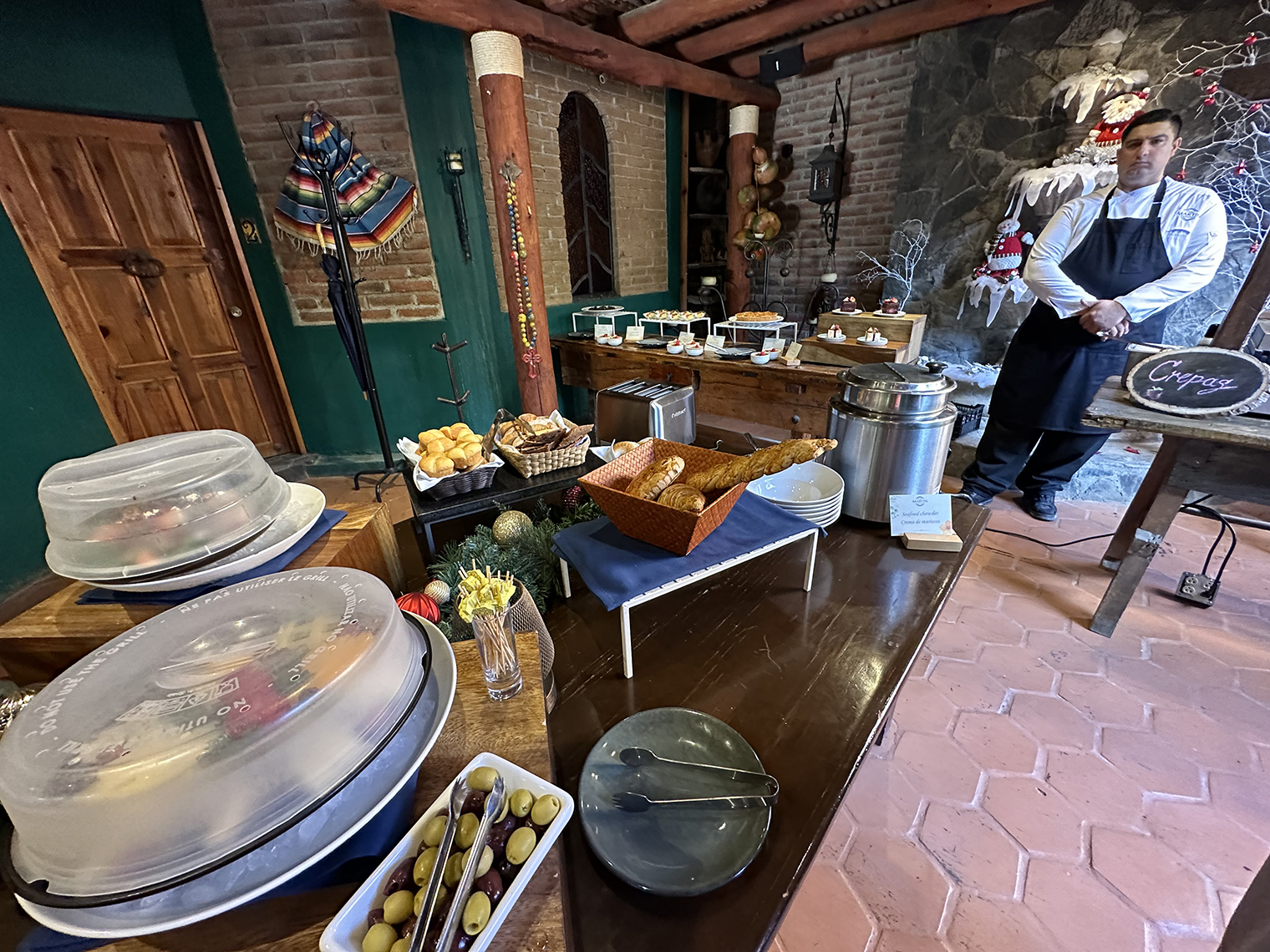 We have been to Casa Martin several times for dinner. The atmosphere, the food and the service are always excellent. We don’t go out for breakfast that often but decided to try the Sunday Brunch at Casa Martin recently. It is offered from 10:00 am to 2:00 pm each Sunday and so I made a reservation for 10:30. We were led to our table and the host described the layout of the brunch and offered us a choice of drinks – mimosa, Bloody Mary and others – to go with our brunch (included). He pointed to the bar area at the back of the restaurant and said that we would find a quesadilla station, waffle and crepe station as well as salads, cheese, hot items and desserts in that area. We were seated near the carving station, which offered roast beef, lamb barbacoa, grilled vegetables and corn on the cob. The menu for breakfast items was on the table and included everything from French toast to fruit, eggs including Eggs Benedict and Chilaquiles. He explained that these were smaller portions so that we could also enjoy other items from the stations or buffet.