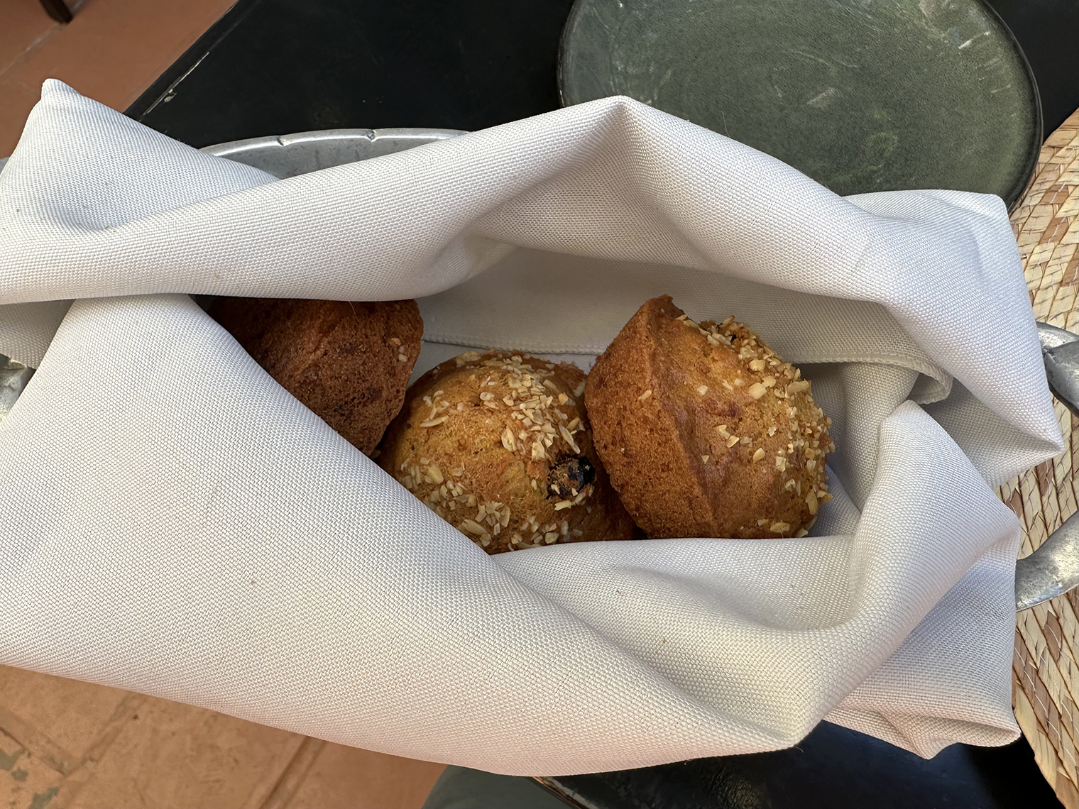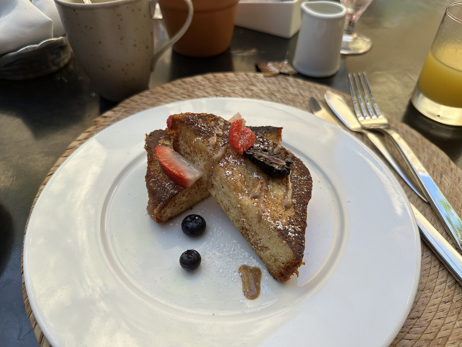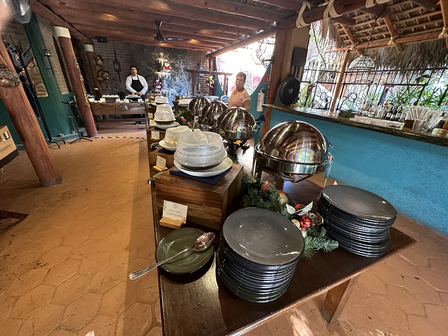 We have been to Casa Martin several times for dinner. The atmosphere, the food and the service are always excellent. We don’t go out for breakfast that often but decided to try the Sunday Brunch at Casa Martin recently. It is offered from 10:00 am to 2:00 pm each Sunday and so I made a reservation for 10:30. We were led to our table and the host described the layout of the brunch and offered us a choice of drinks – mimosa, Bloody Mary and others – to go with our brunch (included). He pointed to the bar area at the back of the restaurant and said that we would find a quesadilla station, waffle and crepe station as well as salads, cheese, hot items and desserts in that area. We were seated near the carving station, which offered roast beef, lamb barbacoa, grilled vegetables and corn on the cob. The menu for breakfast items was on the table and included everything from French toast to fruit, eggs including Eggs Benedict and Chilaquiles. He explained that these were smaller portions so that we could also enjoy other items from the stations or buffet.
