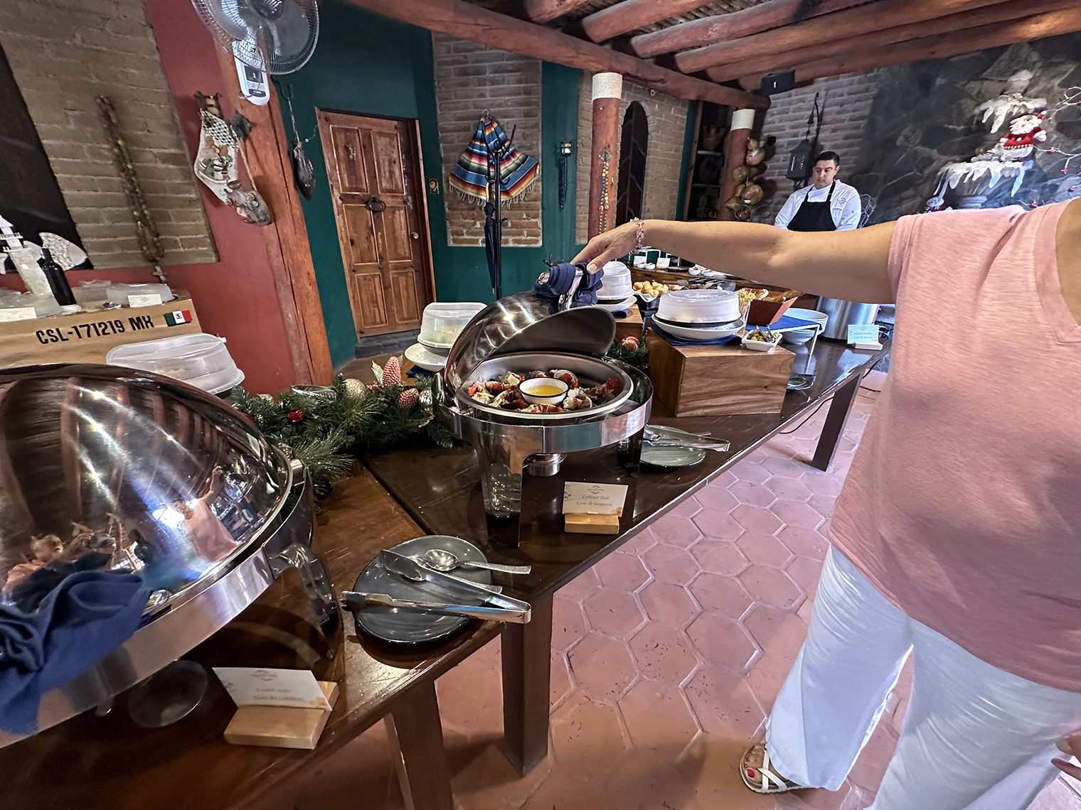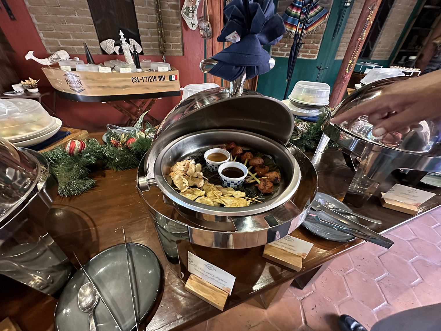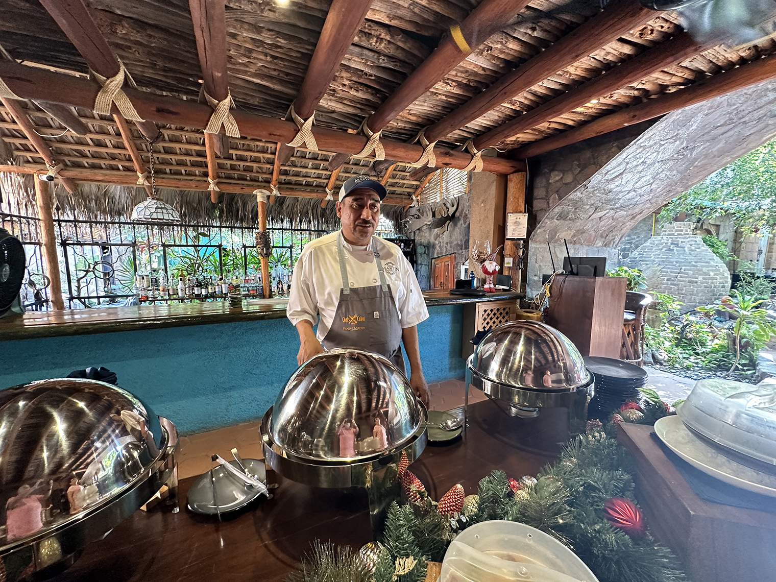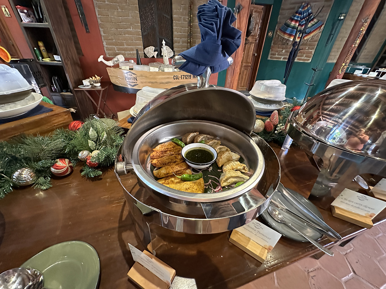 Chef Roger came to the table and asked if we had tried the lamb barbacoa. He explained that it was prepared in the traditional mainland Mexican way in an underground pit and cooked overnight with its special sauce. How could I resist, and so I went back to the carving station, where the grill chef made one for me with a blue-corn tortilla heated on the grill. There was a choice of salsa to add to the lamb taco. Again, the flavors were excellent.