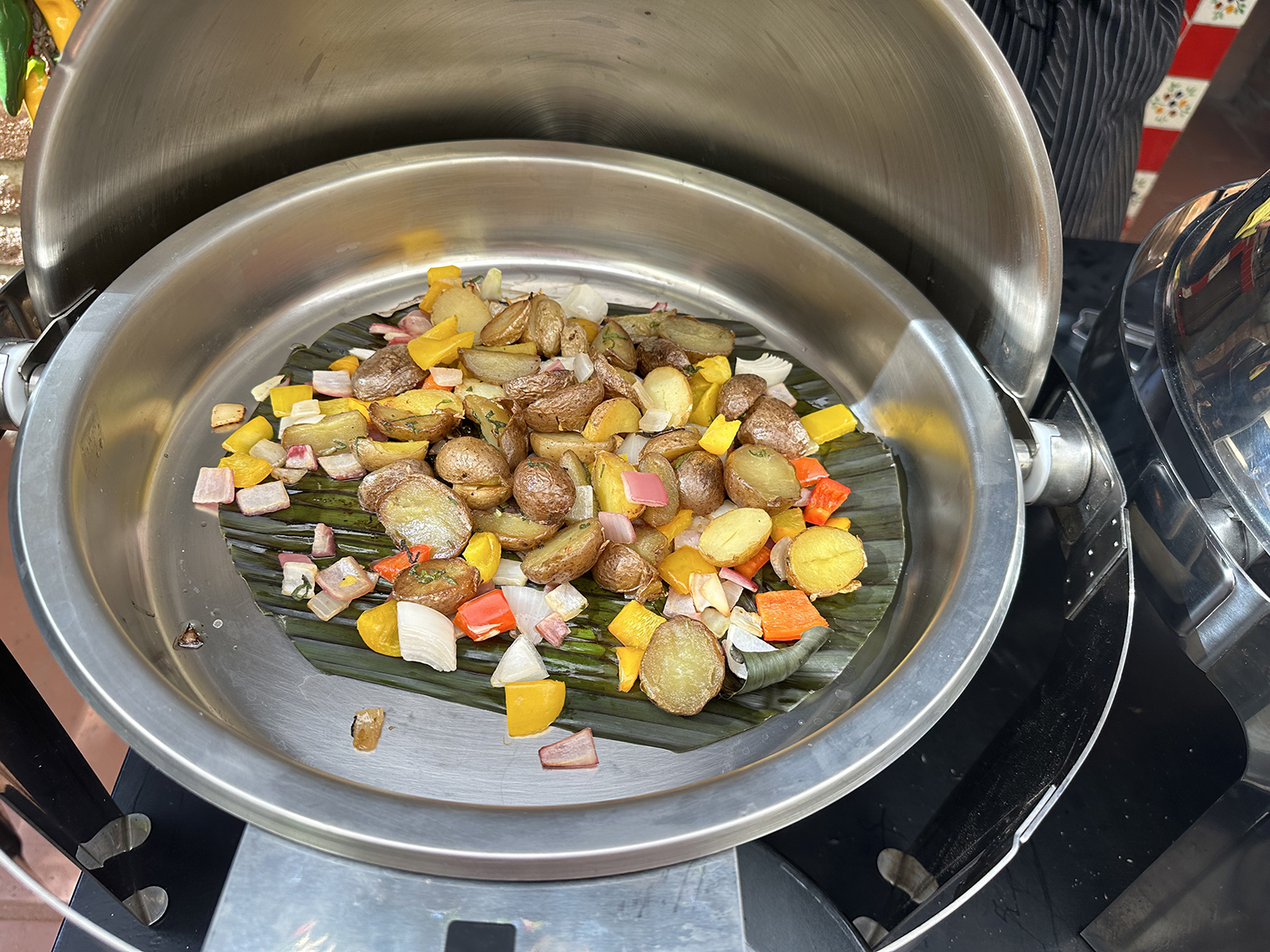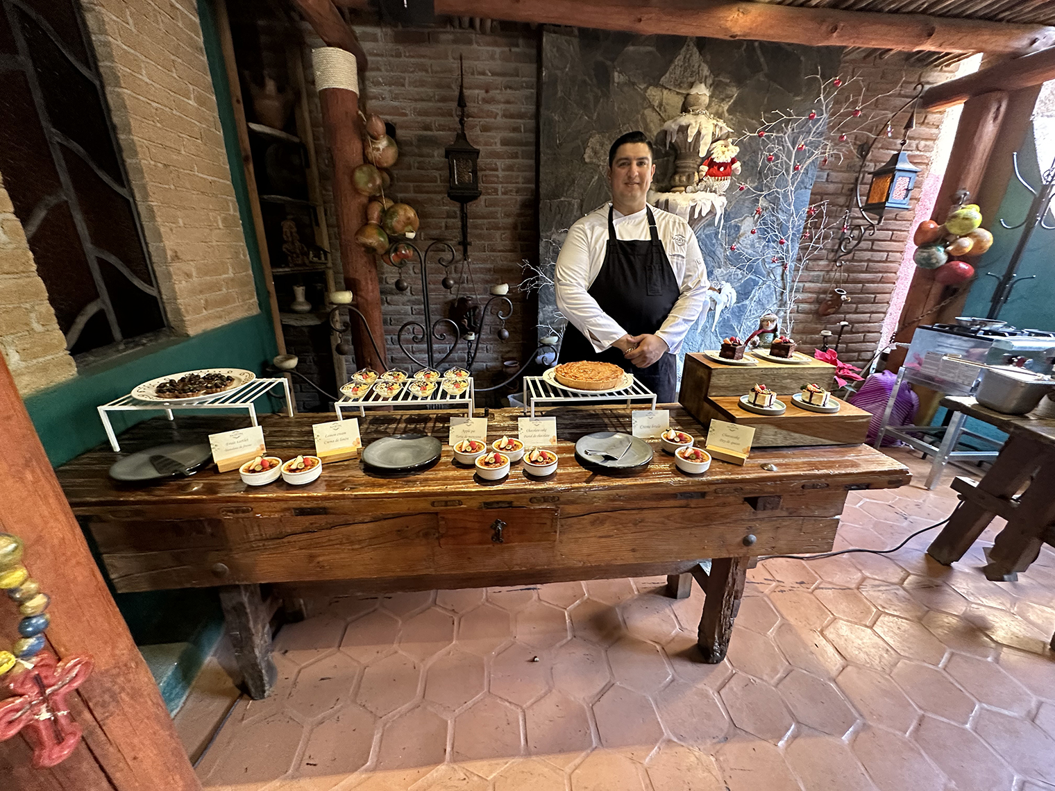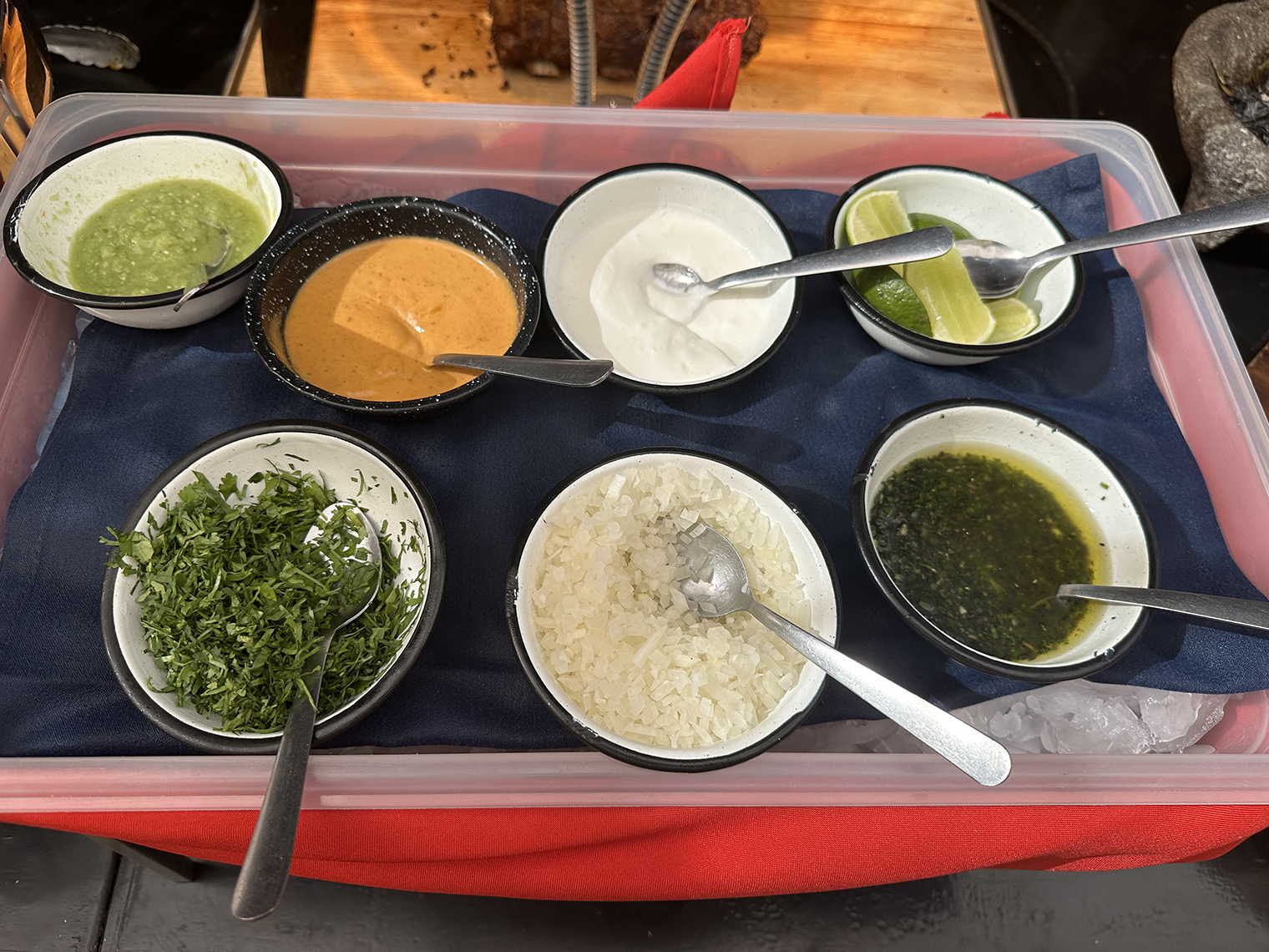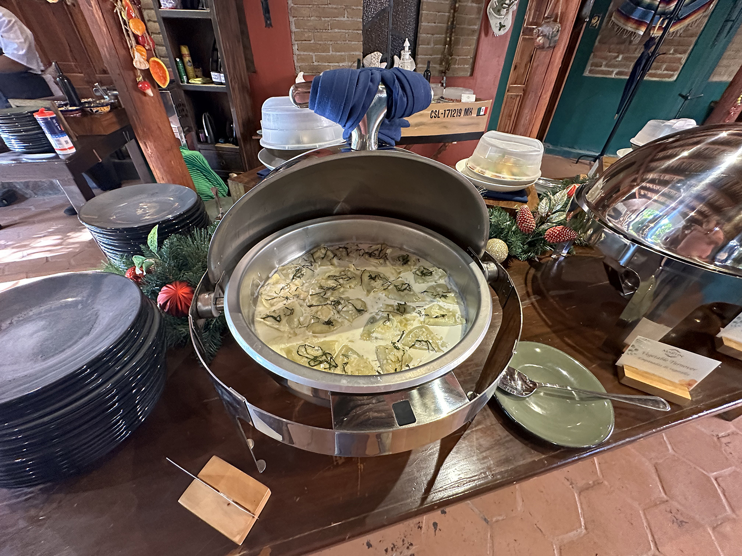 Chef Roger came to the table and asked if we had tried the lamb barbacoa. He explained that it was prepared in the traditional mainland Mexican way in an underground pit and cooked overnight with its special sauce. How could I resist, and so I went back to the carving station, where the grill chef made one for me with a blue-corn tortilla heated on the grill. There was a choice of salsa to add to the lamb taco. Again, the flavors were excellent.