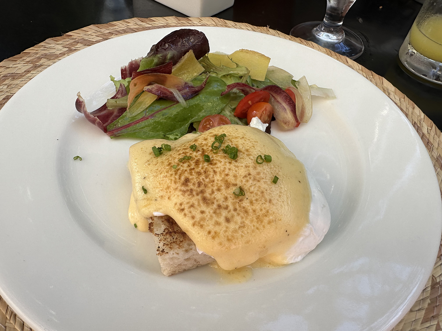 Our server came by and asked if we would like water or anything else to drink. We both asked for the fresh-squeezed orange juice. Along with the juices came a basket of freshly baked muffins. We ordered our breakfast choices – French toast for Beth and Eggs Benedict for me (without ham) and decided to visit the buffet. While we were at buffet, Chef Roger Martin came out to say hello and to describe the items that were available. He indicated that the Brunch was based on the one that he had created at Pitahayas in Cabo del Sol. The choices were absolutely amazing. There was a table with fresh fish items – shrimp cocktail, sushi, ceviche, and more. There were five different salads – quinoa, beet, country, garden, caprese – each sitting on a plate on a bed of ice to keep them cool and fresh. The hot-side of the long table included four-cheese ravioli, empanadas with vegetables or beef, curried chicken and lamb ball skewers, grilled vegetables, and lobster tails. At the waffle and crepe station, the sous chef would make yours with a choice of many toppings. The carving station provided even more choices. While we were up, Beth got some caprese salad.