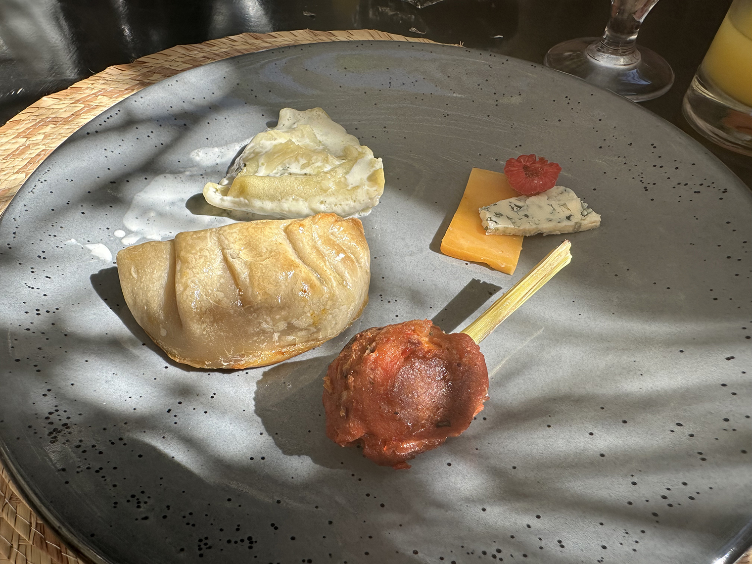 We sat back down, and our first course was delivered – the French Toast and Egg Benedict, which came with a little salad. Both were delicious. I even snuck a taste of Beth’s French Toast. I next ordered a waffle with caramel sauce and fresh fruit – blueberries and raspberries. The waffle, which was about half the normal size, and I could have gone for just a quarter, tasted and looked great. Next Beth decided to try the roast beef, which she asked the grill chef to cook a little more and it was served with grilled vegetables. The single slice was also huge and cooked to perfection for her. My sojourn to the buffet table resulted in a plate with a four-cheese ravioli, a vegetable turnover, a lamb ball and some different cheeses. I didn’t want to have too much of anything as I wanted to keep sampling what was available. Beth’s selection included the beef and vegetable turnover, a lobster tail, and a piece of garlic bread. The flavors were amazing and nothing was left on the plates. I then quickly also tried a mushroom quesadilla from the Quesadilla Station.