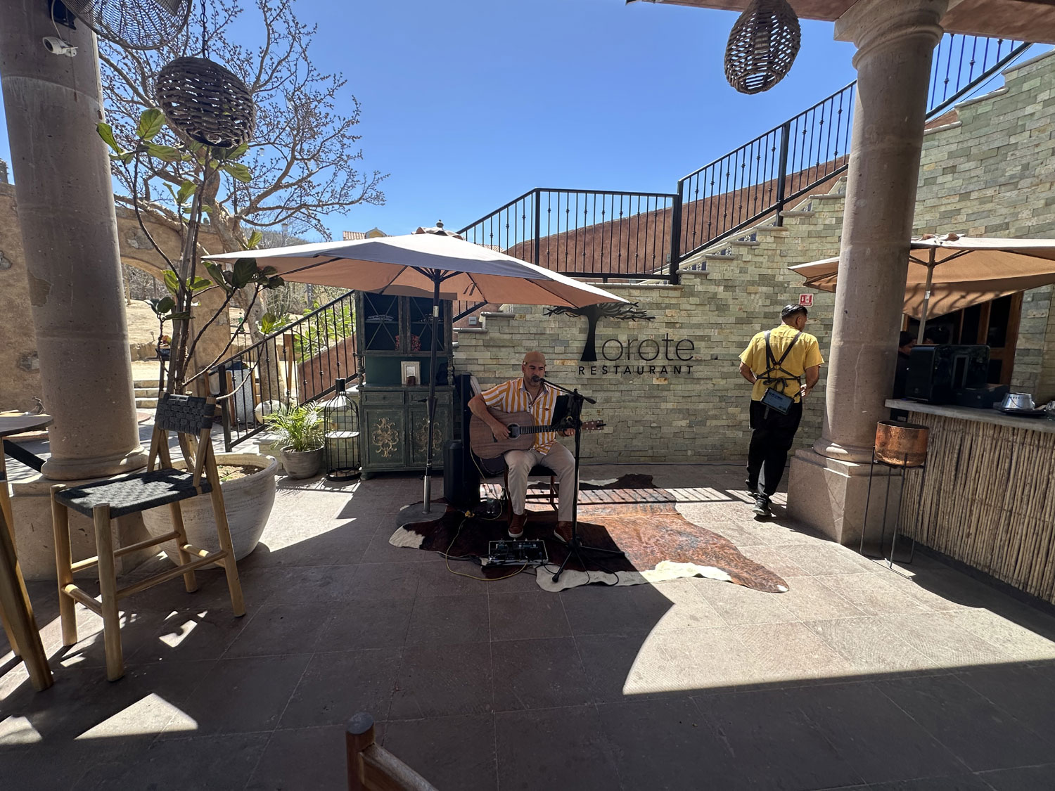 But that is not all. The dessert was both a French toast stuffed with cream and strawberries accompanied by vanilla ice cream, and a small brownie with creme fresh and raspberry sauce. No wonder we were there for over two and a half hours. During our meal, we were entertained by the guitar and vocal stylings of Eduardo Companioni. He played a combination of Spanish and English hits. Chef Victor dropped by to see how we enjoyed our brunch – and we raved. With two servers on each table, the service is truly among the best in Los Cabos.