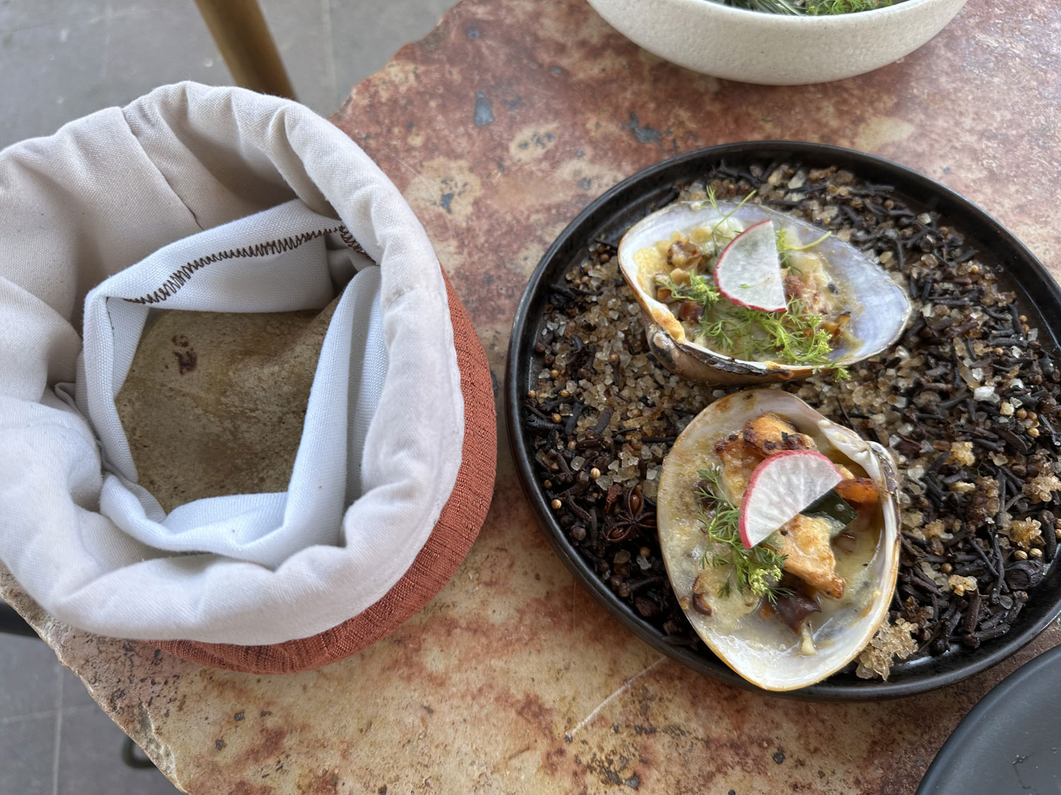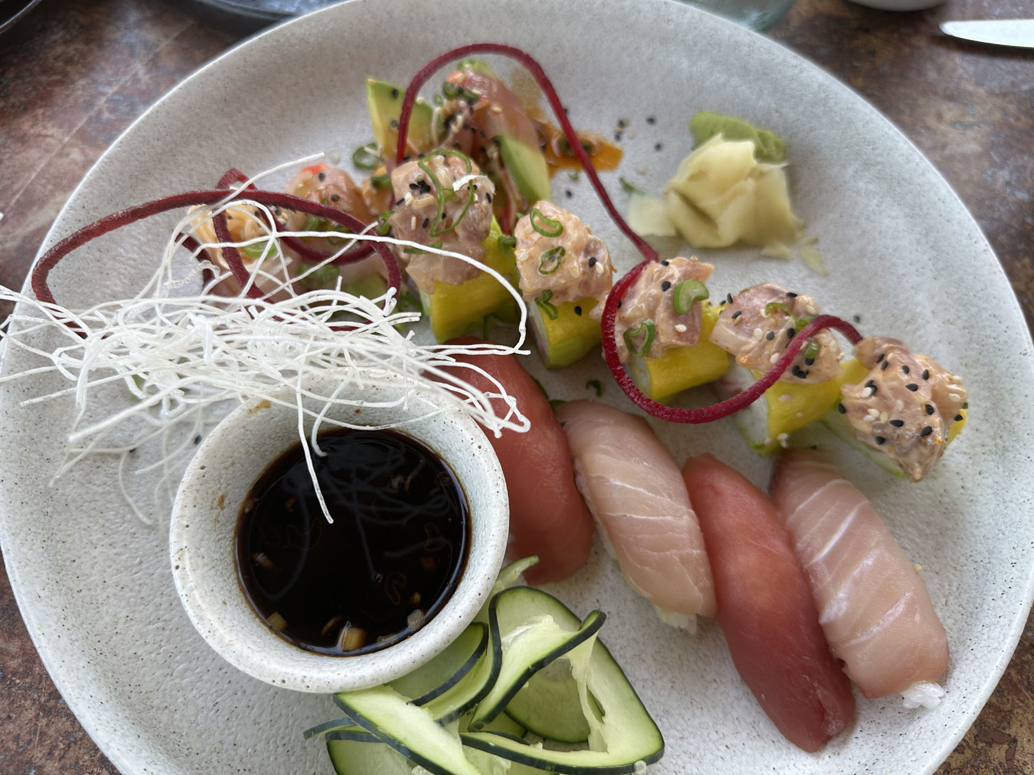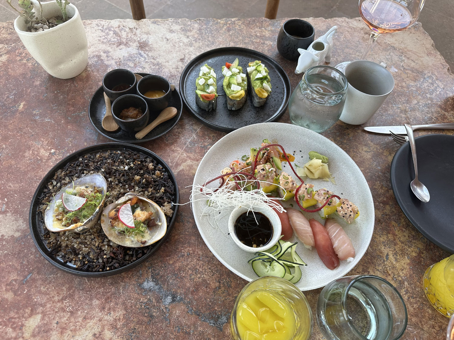 The appetizers for our brunch included local catch Sushi with nouri of tuna and hamachi, sushi rolls and Curricanes, wood-fired baked clams with seafood, bacon and cheese and tortillas to make tacos if you like, and fresh oysters with delicious ceviche, and goat cheese & fresh herbs avocado toast. You can even have more of one if you like. There is definitely too much for two people.