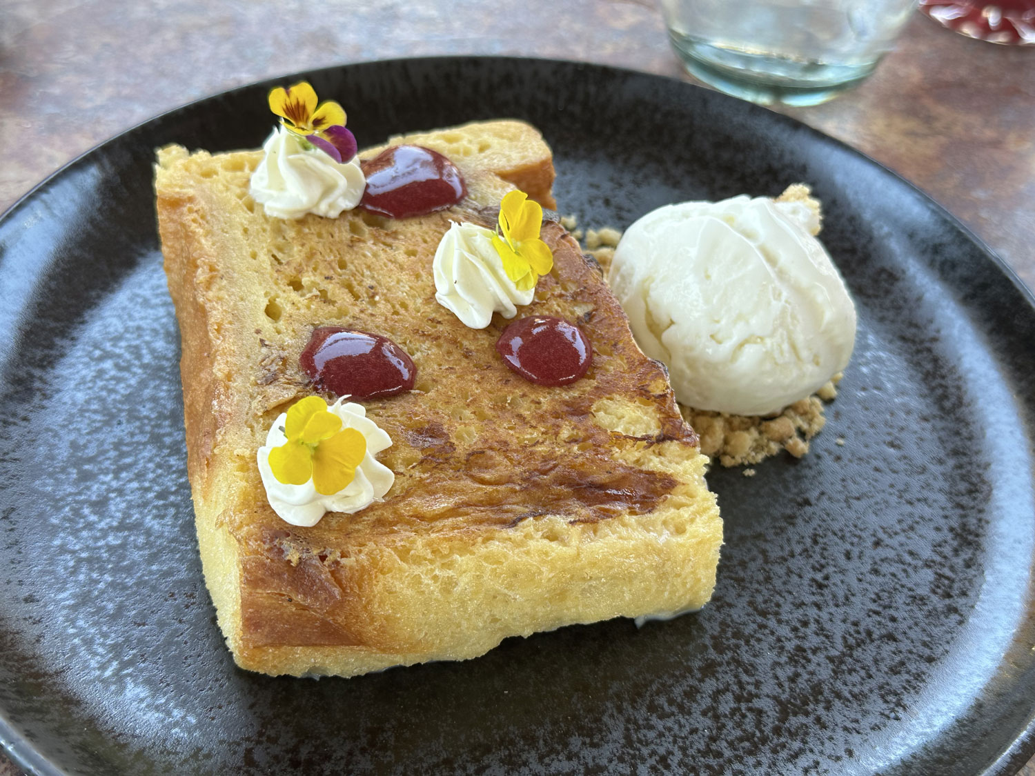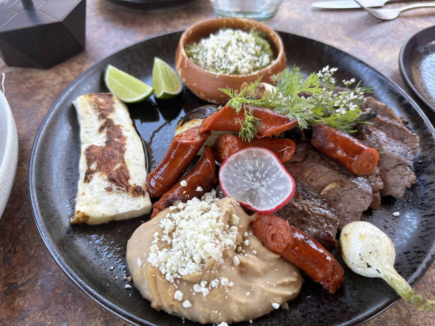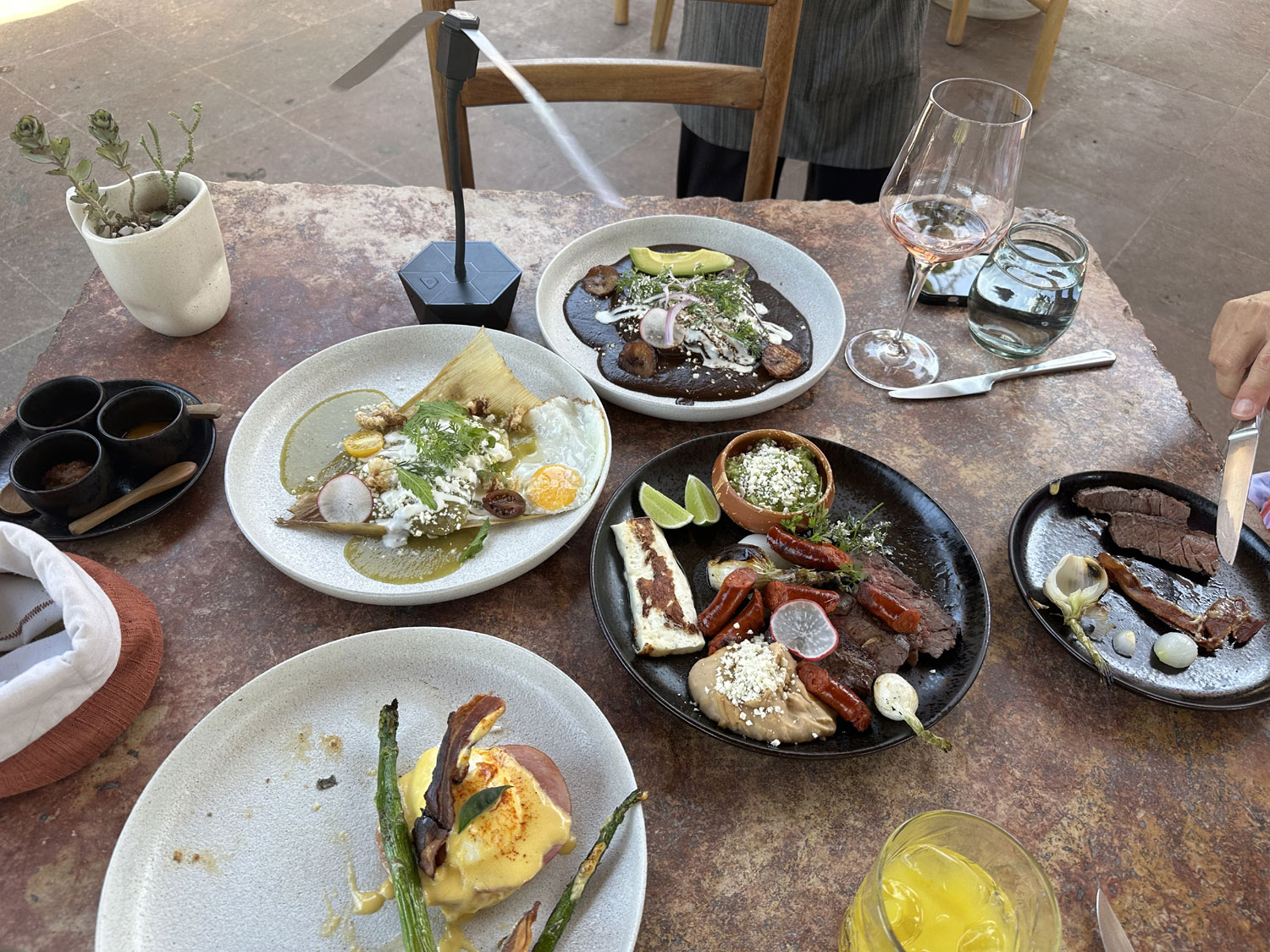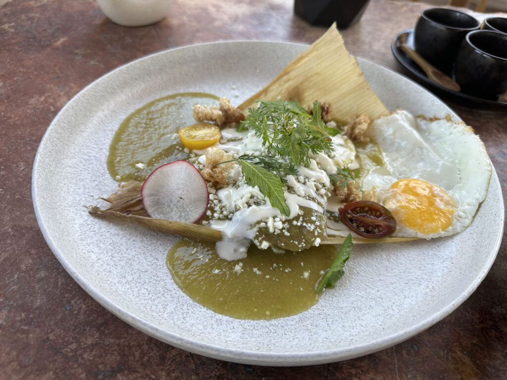 The menu allows you to choose from 10 different entrées for your main course. We selected organic chicken & mole negro enchiladas, sour cream and aged cheese, arrachera steak and chorizo soy roasted onions, guacamole, queso asado, tortillas y quesadillas, classic eggs Benedict with smoked pork loin, grilled asparagus and bacon, and suckling pig & black bean tamales, hoja santa salsa verde, chicharrones, with fried egg. When you look at the photos, it will be clear that this is a lot of food, presented beautifully, and the combination of spices and sauces make each unique and delicious.