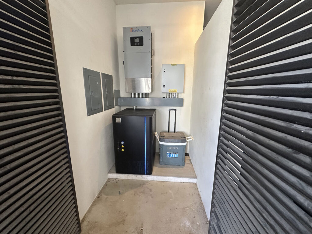 This house on the beach features two levels with a large roof deck on the third level, and a pool that covers the whole front of the house, which is on the Pacific Ocean in Pescadero. In addition to the main house, there is a large garage that has 30 SunPower 450 W panels on the roof mounted on a patented anodized aluminum racking system, producing the potential for 13.5 kW of energy per hour. The other components of the solar system include a 15 kW Sol-Ark inverter, which converts the solar energy into electricity to both feed to the house and to charge the Blue Ion lithium-ion batteries. The Blue Ion Battery management system holds eight (8) 2 kW batteries, providing 16 kW of storage. The homeowner with Innovacion Solar’s assistance plans to add another Sol-Ark inverter and another 16 kW of Blue Ion batteries, moving the house toward grid independence. For back up during storm periods, the house also has a 20-kW propane Kohler generator that automatically starts if the batteries are drained. The whole system can be monitored and adjusted remotely on a phone or computer through Stellar, Blue Planet Energy’s monitoring system. The monitor provides the state of charge including how long it will take to fully charge or discharge the batteries, the temperature of the batteries, and the use of electricity from the grid.