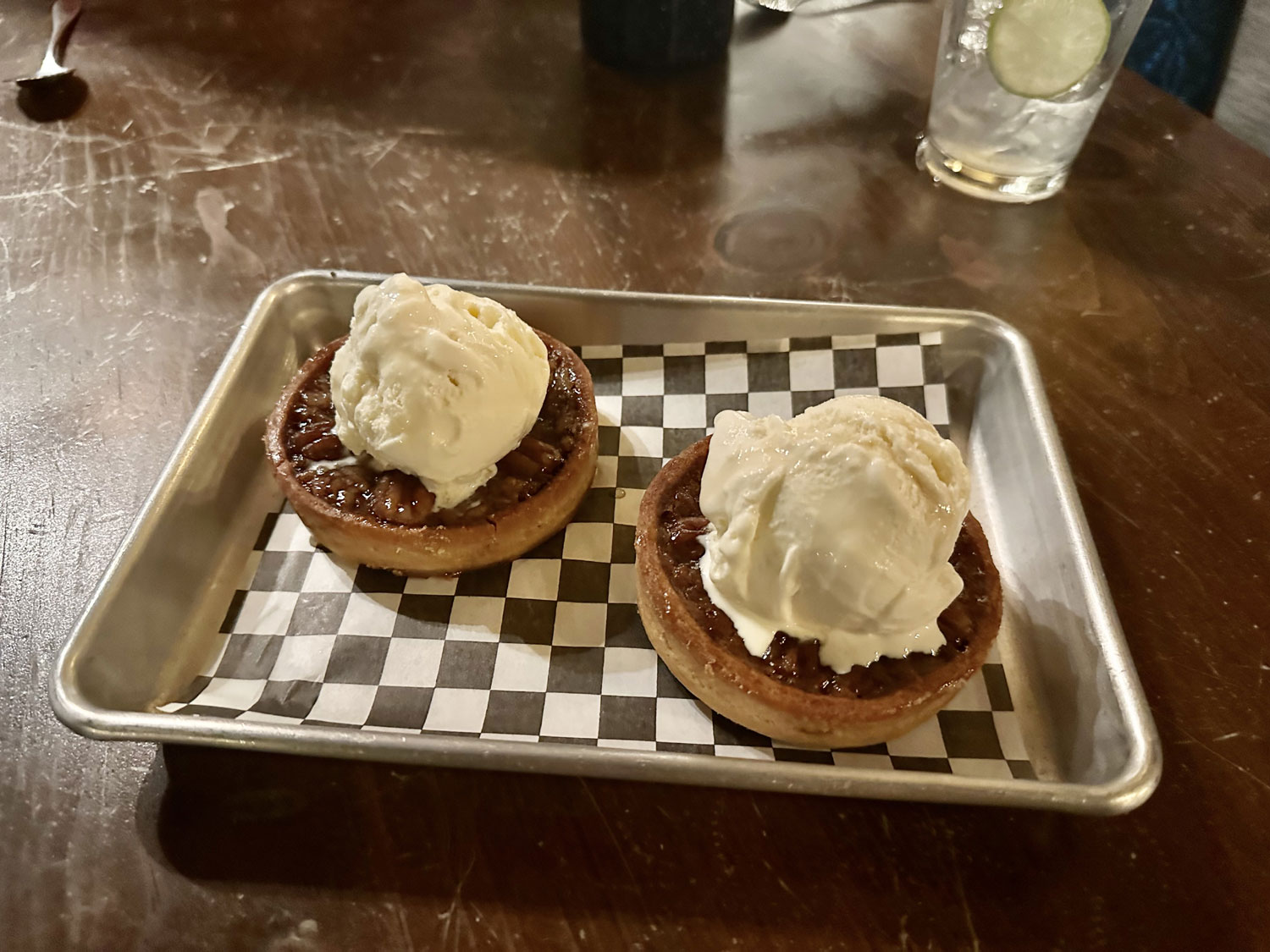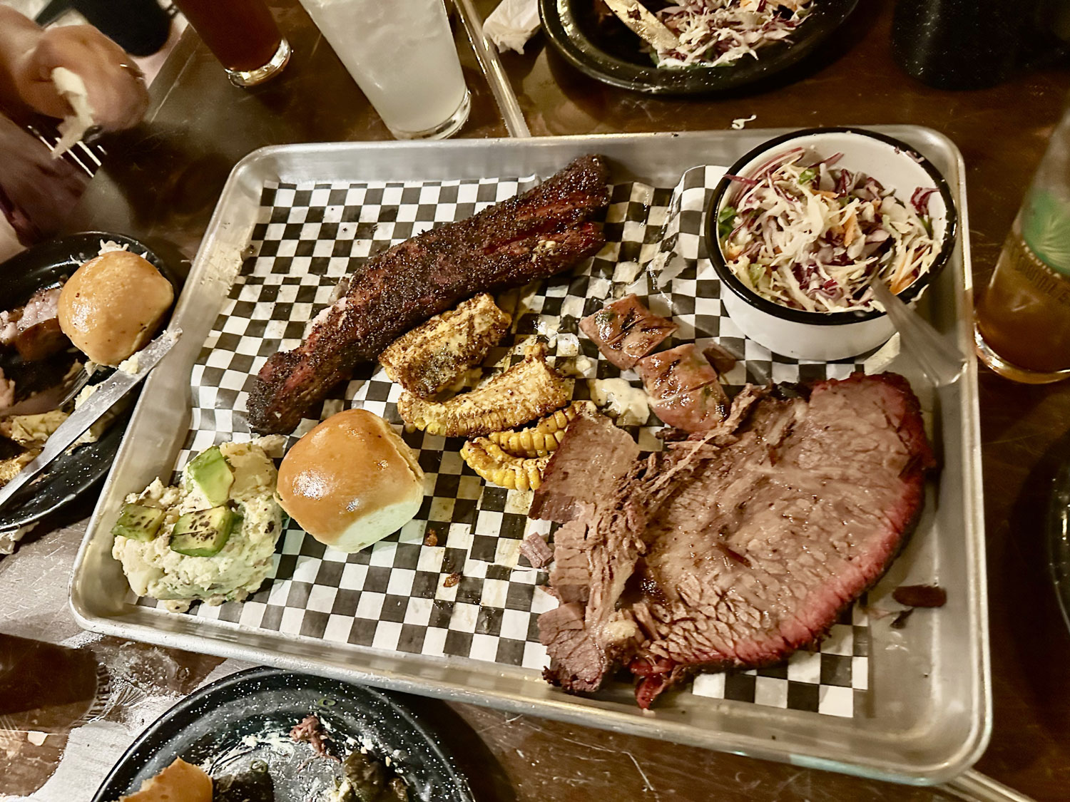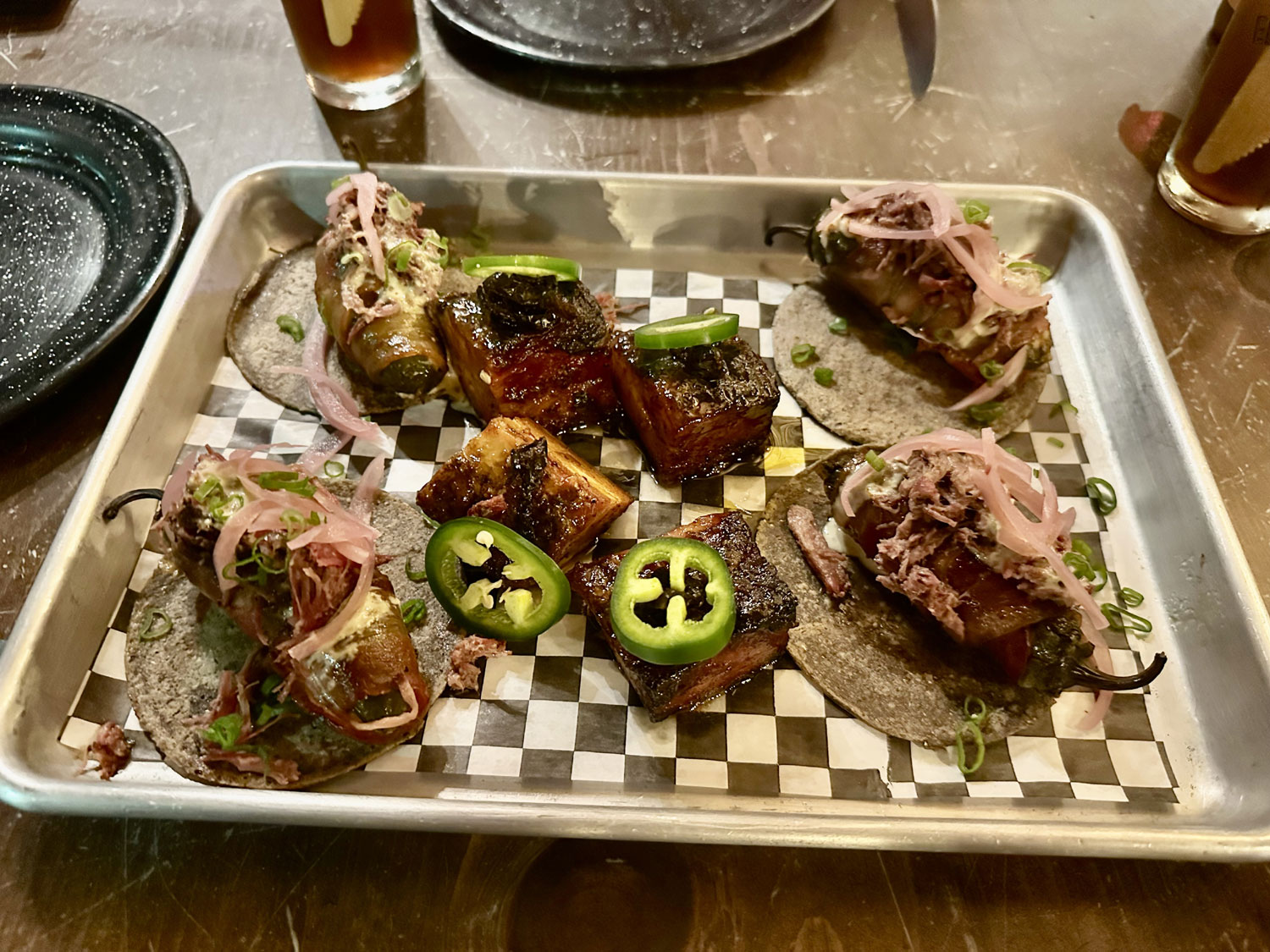 The meal created by the two chefs, Kris Kabush and Al Lavin (of Barbanegra and Oye Bastardo had several surprises. The first course appetizers included pork belly with an amazing sweet sauce of top and stuffed peppers wrapped in bacon. Great flavors. The main course came on a large tray with sides of potato salad and coleslaw. There was a huge piece of brisket, smoked sausage, and a large bacon rib. The bacon rib was something else. The large rib was soaked in brine for three days before being smoked and had an amazing flavor. The brisket was so tender that it almost fell apart. The meats were accompanied by very unique quarters of corn on the cob with a special sweet dressing on the top. The final course – dessert – was a pecan tart with vanilla ice cream. It was amazing. We all enjoyed our drinks and the music as we devoured the three courses. The service was excellent. Mike Grabow did a great job of bringing country to Taba BBQ with both country hits and original songs. It was a great evening.