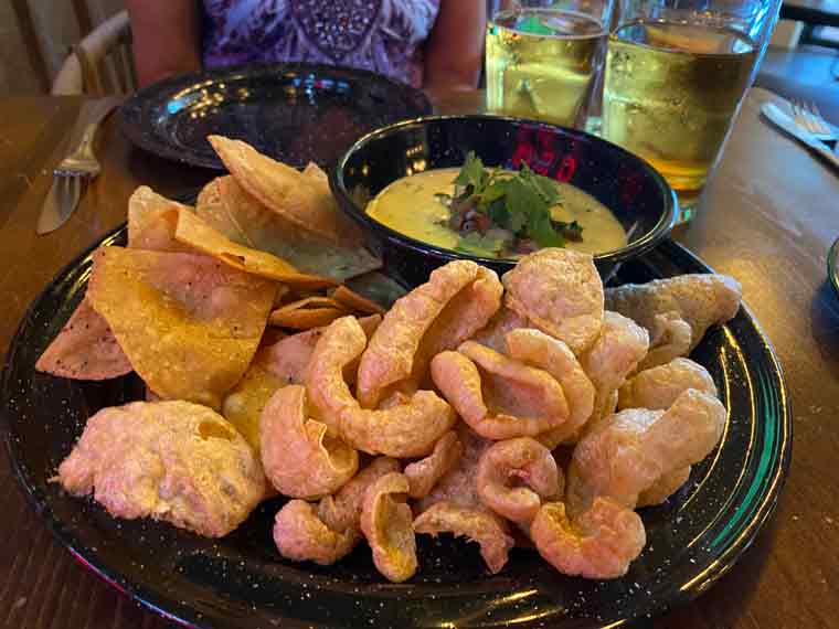 I could go to Taba BBQ just for the sides – mac & cheese, chili beans, potato salad, coleslaw and fries. On New Year’s Eve, we went for a whale watching and sunset cruise with Cabo Sails and then went to Taba BBQ for an early dinner. They even have parking beside the restaurant so you don’t have the typical problem of finding a place to park in Cabo San Lucas and walking to your restaurant. As usual, we were greeted by the friendly staff and chose a table inside. Our server brought over the house made BBQ sauces and explained each of them. Tracey, who loves spice just wanted to know which ones were the hottest. I ordered some of the Texas Queso dip that is melted cheese with some bits of brisket and other spices that is served with tortilla chips and chicharron (pork rinds).