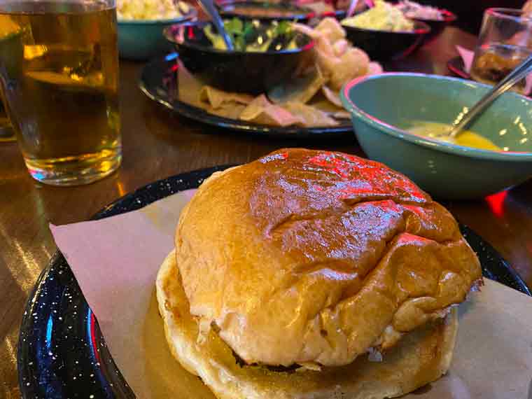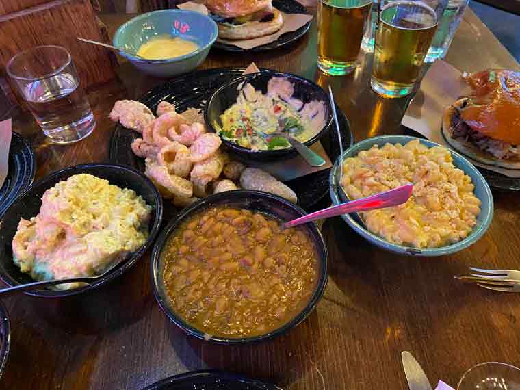 True to form, I ordered the large size of the potato salad, chili beans, Mac & Cheese, coleslaw and french fries for the table. My entrée choice was the pulled pork sandwich. Both Beth and Tracy ordered the small Brisket plate, which is served with onions, pickles and a roll. Chris ordered the medium ribs – also served with onions, pickles and rolls. When the food was served, Tracy dug into the BBQ sauces to test how truly hot they were and we all sampled the sides.
