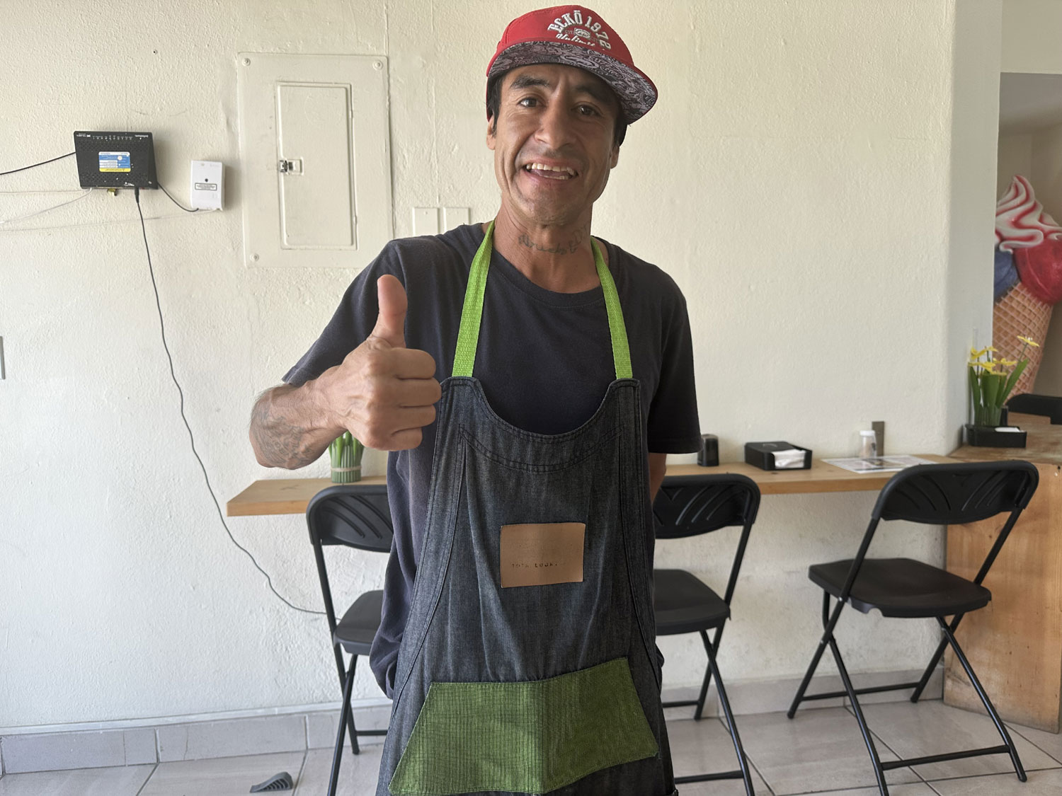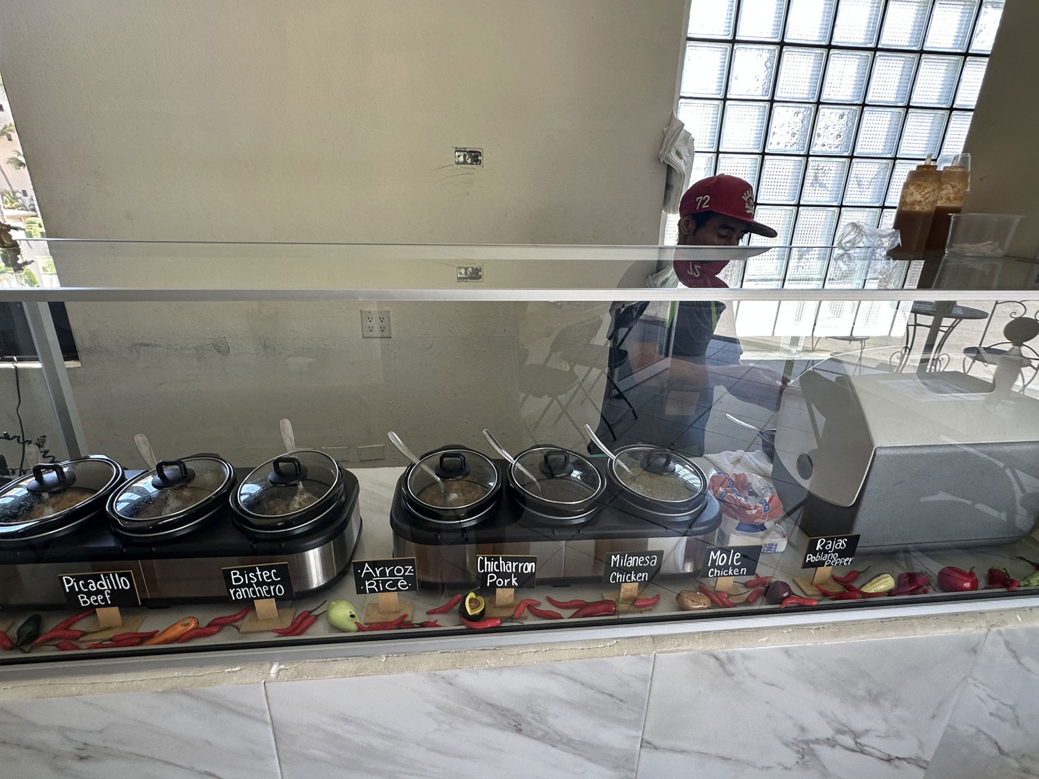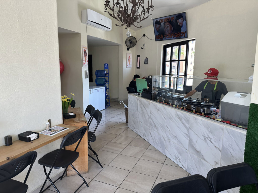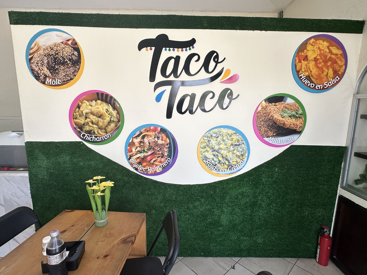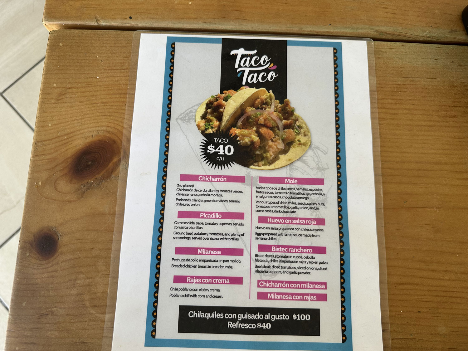 In the small corner spot in the plaza next to the entrance to Coral Baja Resort, replacing Dominos Pizza is Taco Taco – Tacos de Guisado. With one table outside, another inside and a number of seats along the wall, Taco Taco offers eight different types of tacos. I sat down at the table inside the restaurant. The menu was already placed on the table. The choice of tacos is not just the standard chicken, beef, fish, or shrimp but rather Chicharron, Picadillo, Milanesa, Rajas con crema, Mole, Huevo en salsa roja, Bistec ranchero and some Milanesa variations with chicharron or rajas. I decided to try a chicken milanesa taco and the bistec ranchero taco. I also ordered a diet Coke.