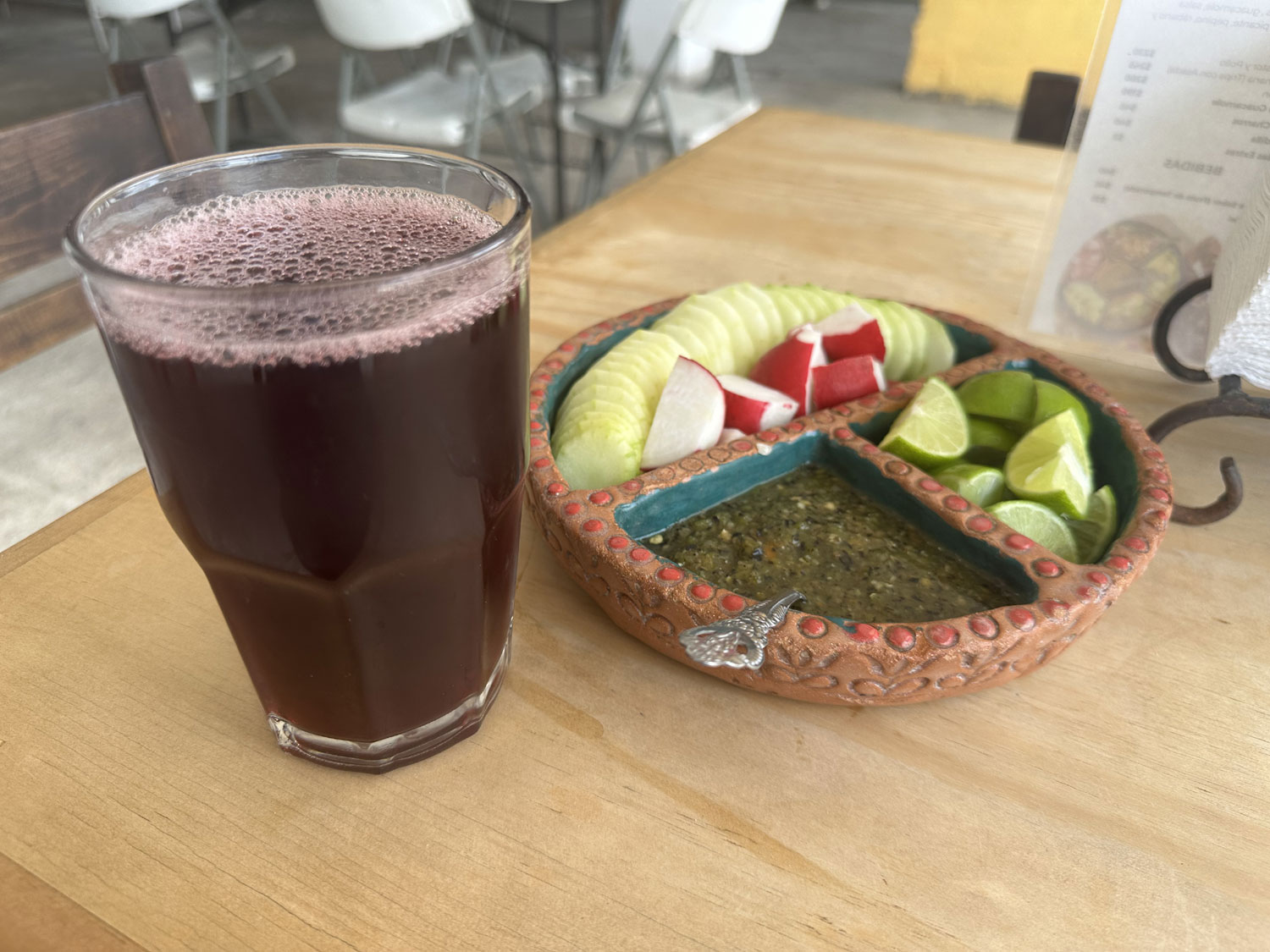 I ordered two tacos – one chicken and one al pastor – with flour tortillas. She asked if I would like the extras on the tacos – onions, cilantro, guacamole, cilantro and salsa. Definitely. I also ordered a Jamaica water to drink. I chose a table in the main dining area, which had murals painted on two of the walls. A server brought me a tray full of sliced cucumbers, radishes, limes and salsa.