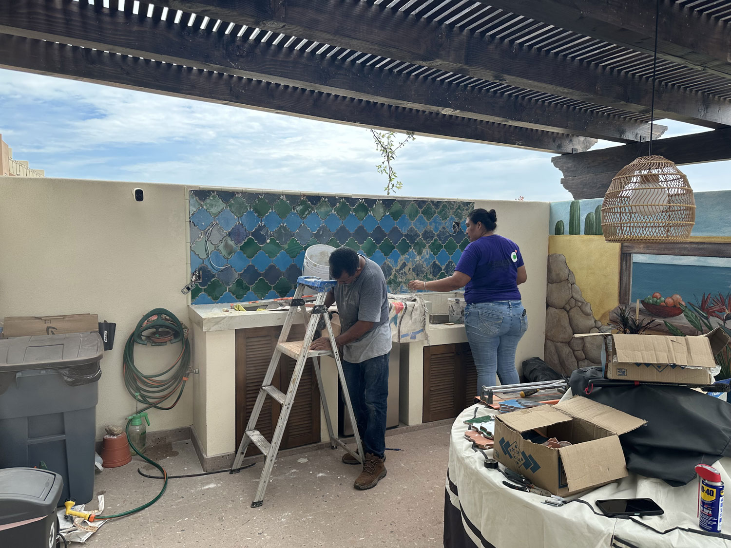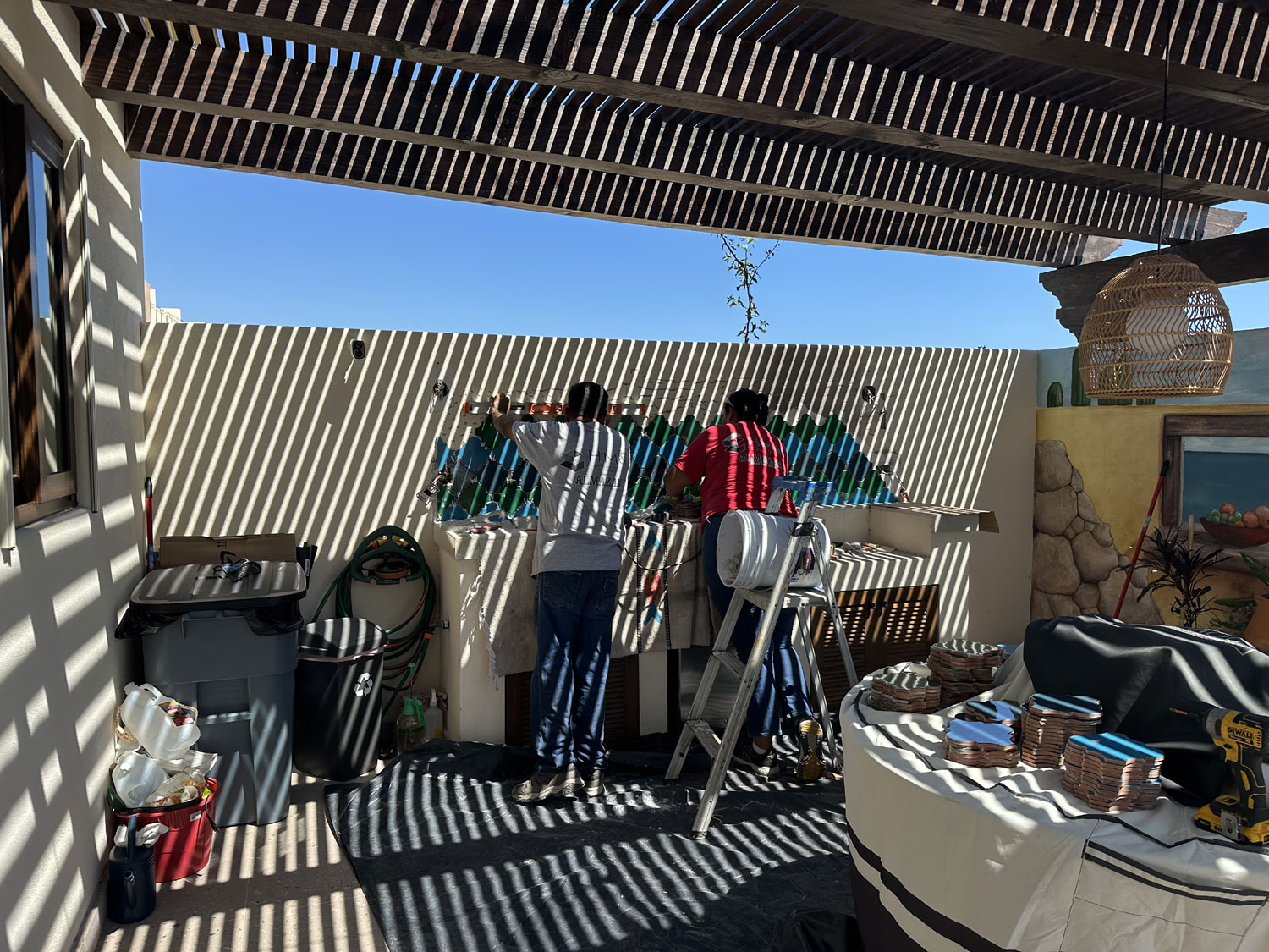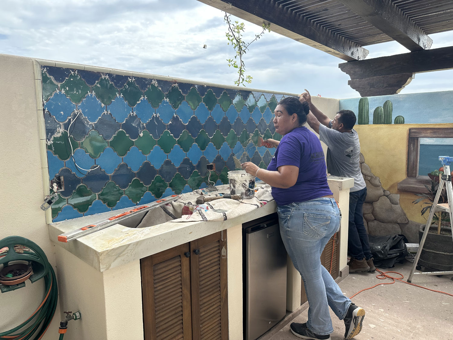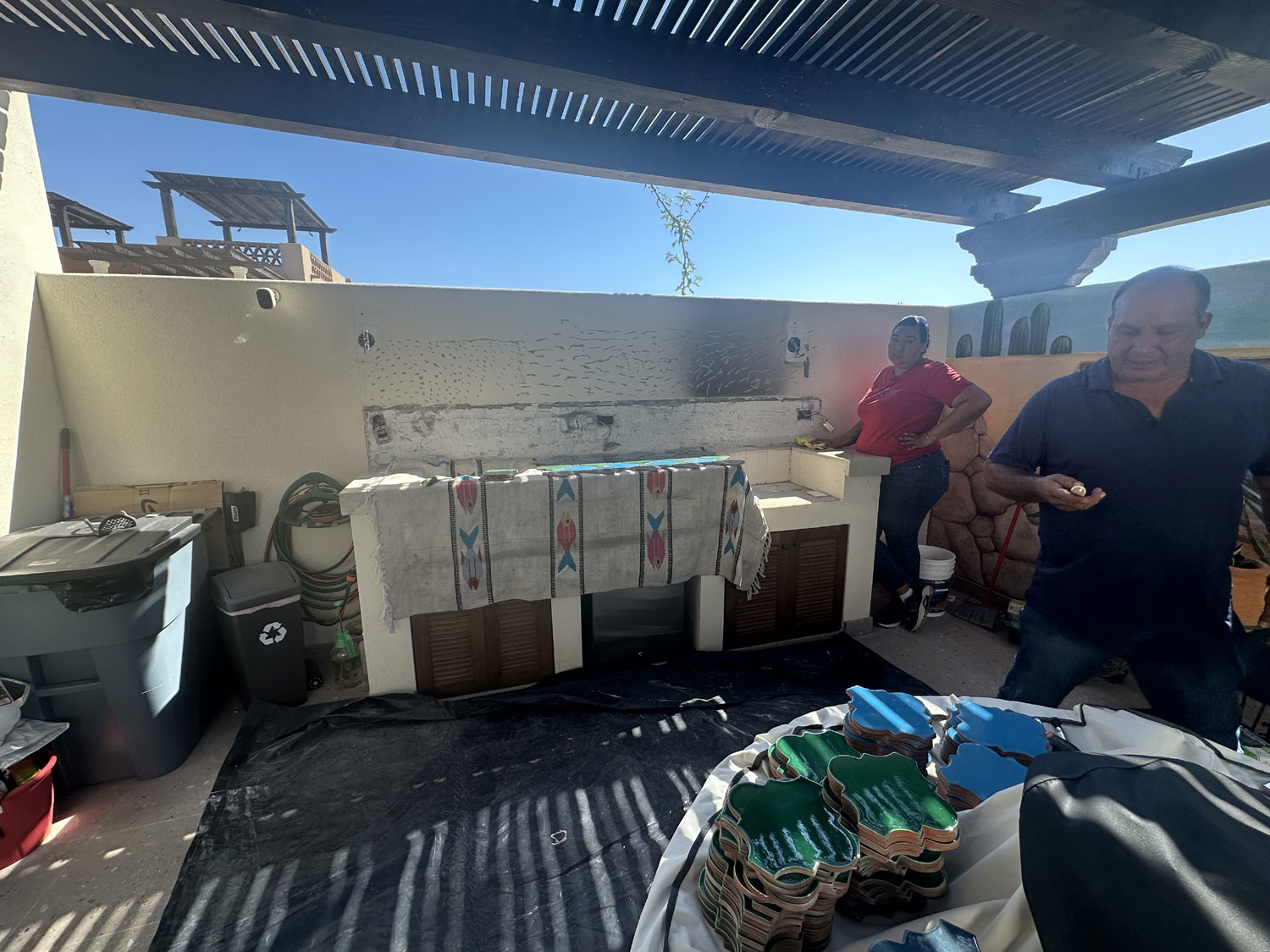 So, we went to Terrazul Tiles in Chamizal to pick interesting tiles to do the backsplash. Given that we have a mural on the long wall of the patio, we wanted tiles that would bring out the colors. Terrazul is the best source in San Jose del Cabo for handmade tiles. After an hour of looking at the different shapes and colors, Beth finally decided on the shape and three colors that she would like to use for the backsplash as well as the border that would be around it. We ordered the tiles.