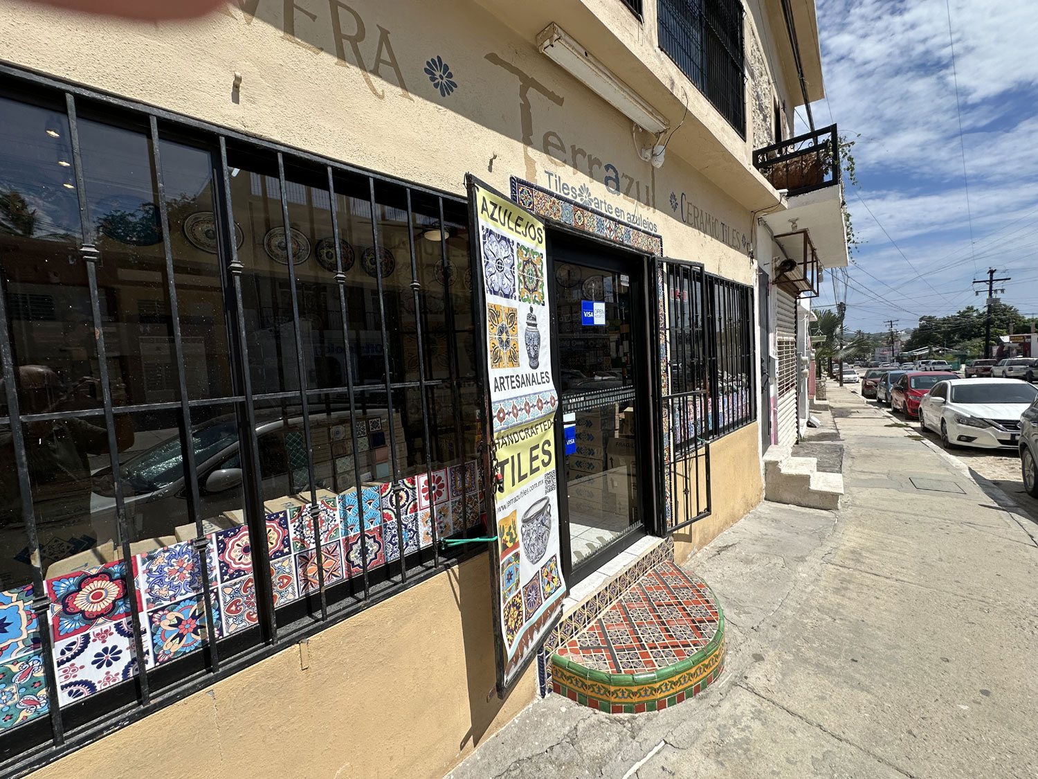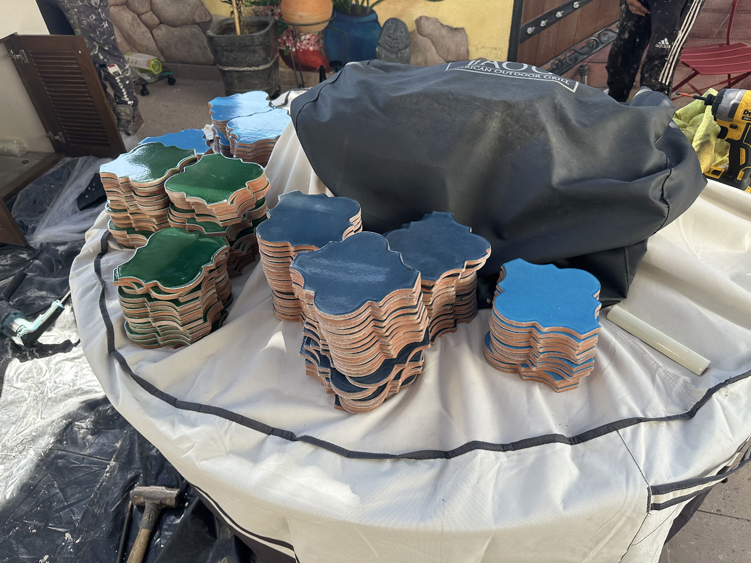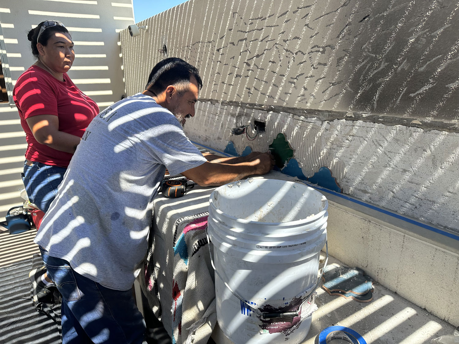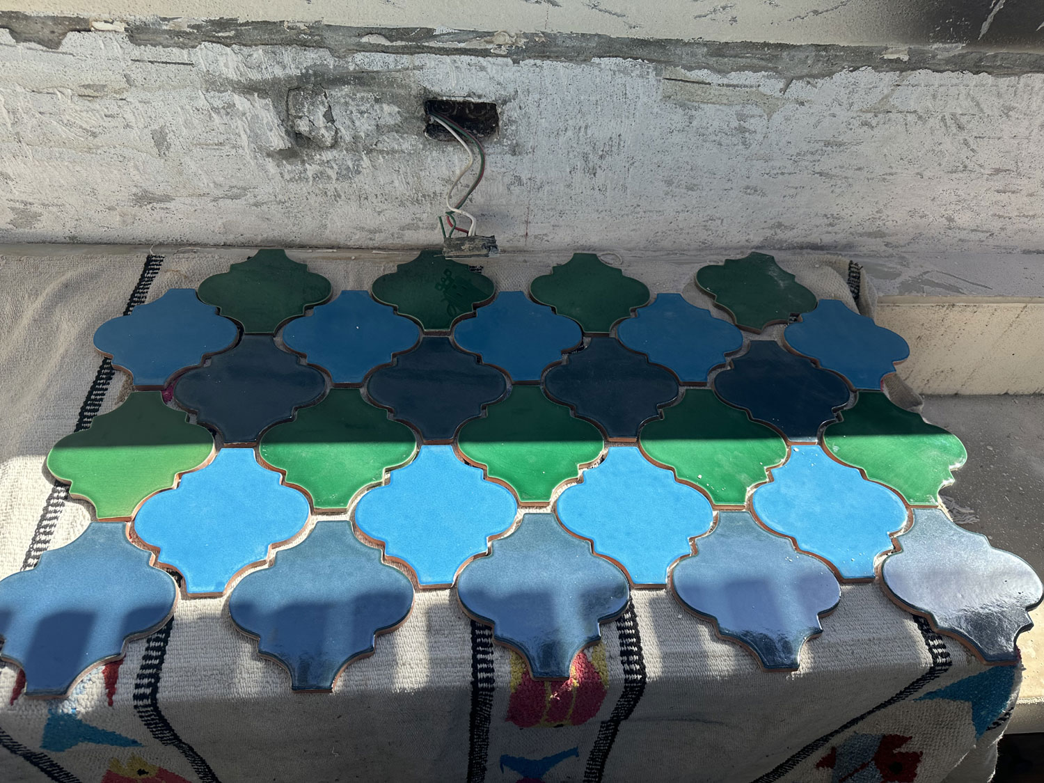 So, we went to Terrazul Tiles in Chamizal to pick interesting tiles to do the backsplash. Given that we have a mural on the long wall of the patio, we wanted tiles that would bring out the colors. Terrazul is the best source in San Jose del Cabo for handmade tiles. After an hour of looking at the different shapes and colors, Beth finally decided on the shape and three colors that she would like to use for the backsplash as well as the border that would be around it. We ordered the tiles.