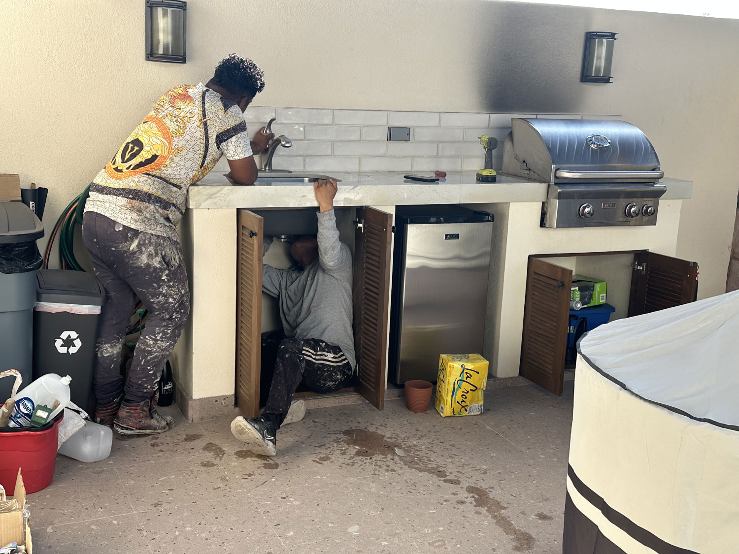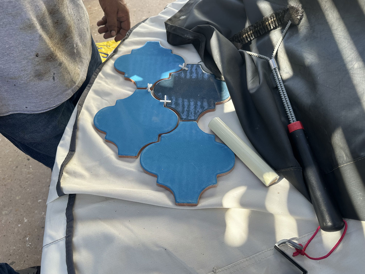 We contacted Eduardo Almazan of Home Maintenance and Improvement by Eduardo to plan the installation with his brother Sergio. When we received the tile, Eduardo brought the team to demo the existing backsplash and take down the lights, which we had decided to replace with the same terracotta sconces that were on the house. The team also removed the sink faucet, electrical switches, and the BBQ to allow complete access. Sergio then recommended the pattern to install and talked with Beth about her preference for spacing and the color of the grout. Because of the uneven nature of the handmade tiles, the size of the spacer was decided.