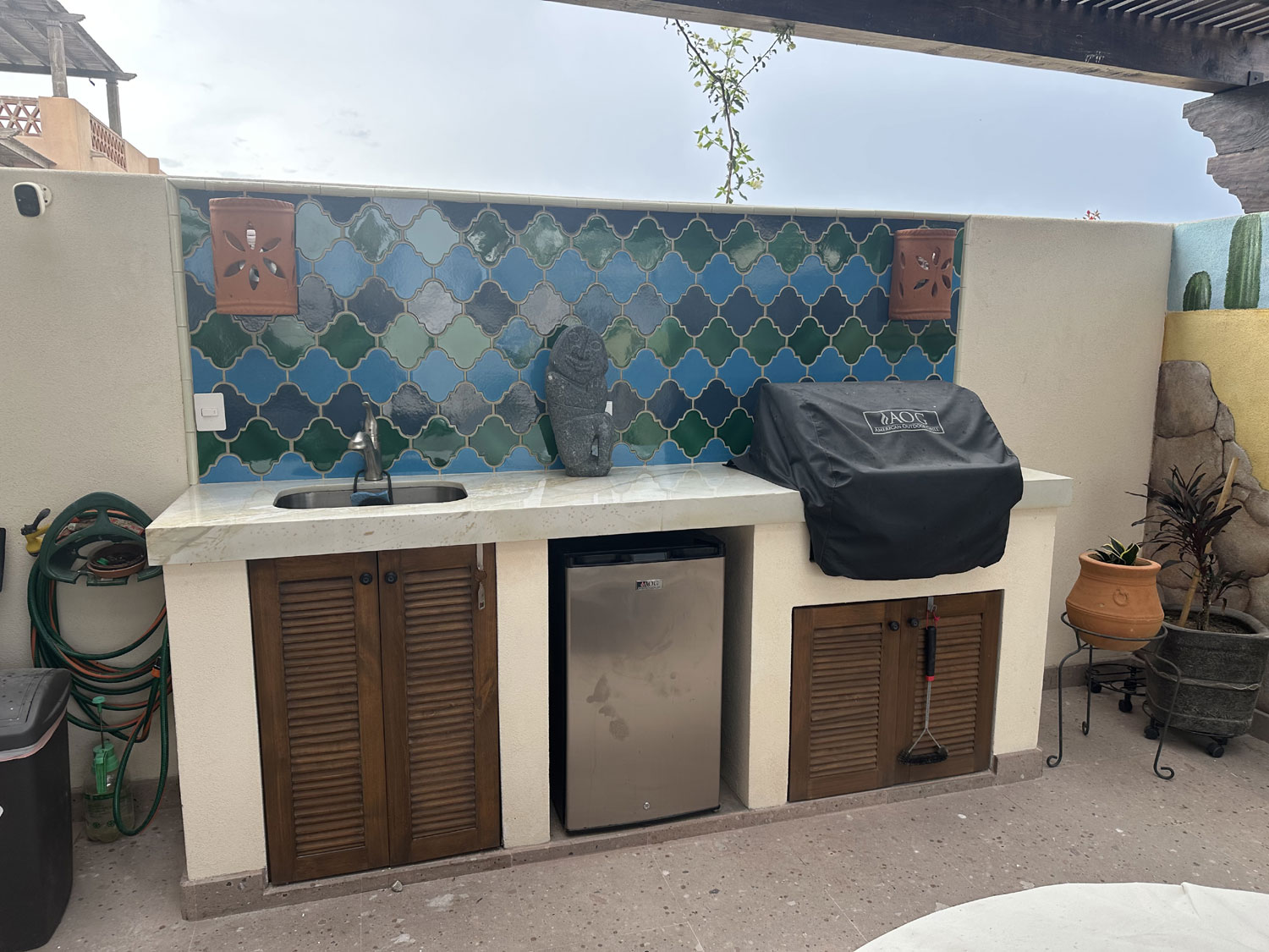 Originally, we have the same white tile that was in our kitchen installed as a backsplash for our outdoor kitchen. After a few years, we recognized our mistakes. First, the backsplash needed to go to the top of the wall and not just part way up. Second, because of this, the smoke from the BBQ had actually blackened the wall behind it – and it was impossible to clean.