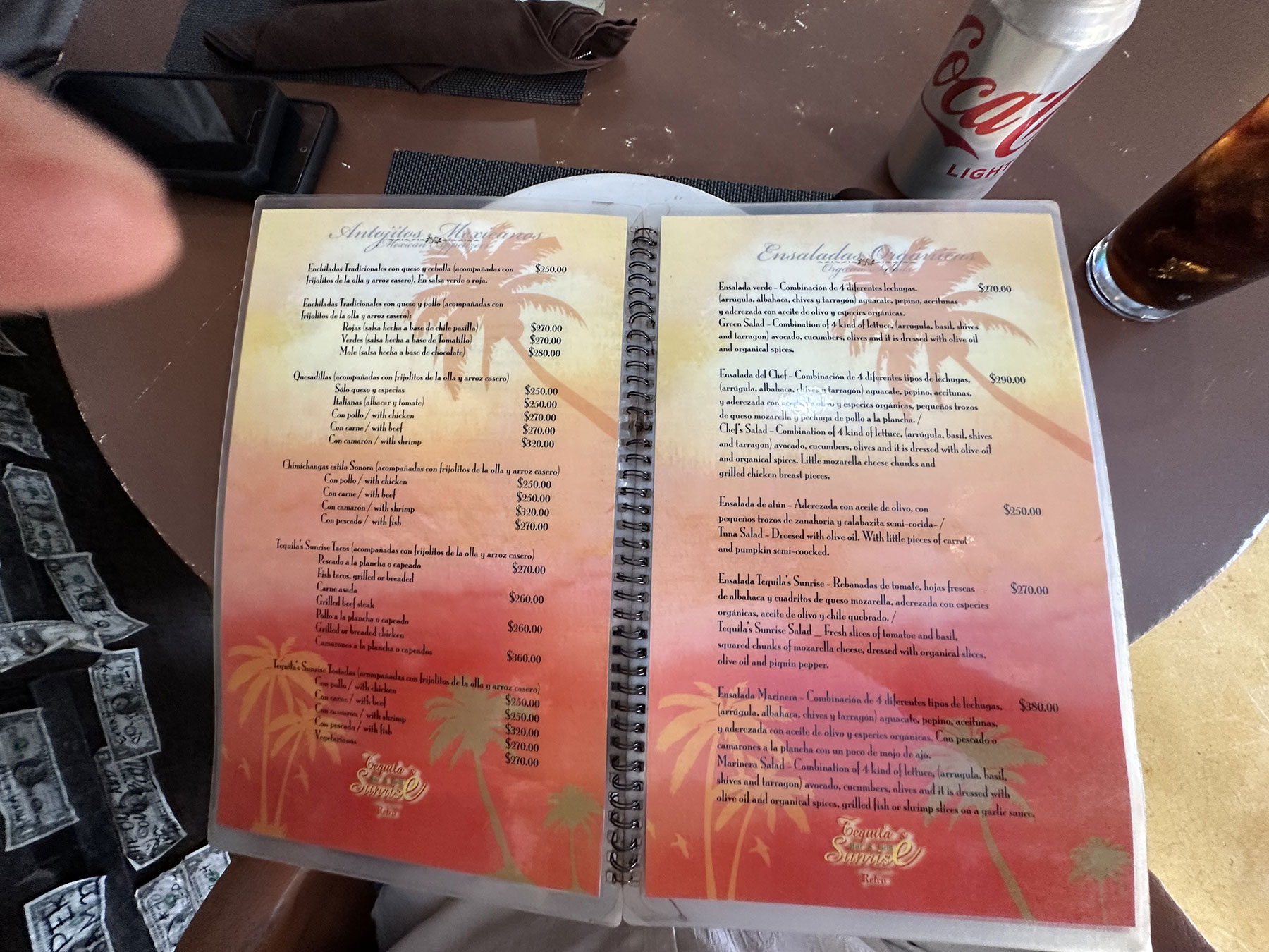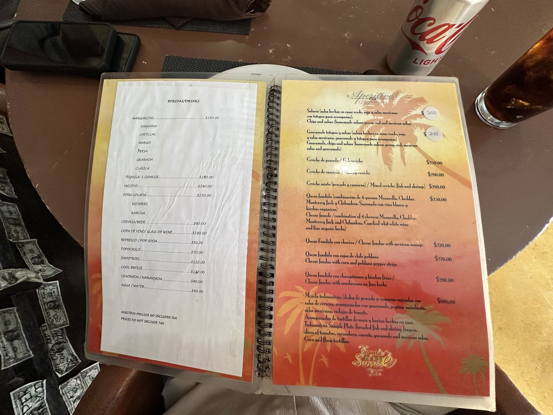 Two things to note: The restaurant is cash only and the prices on the menu do not include IVA (which is noted on the drinks page of the menu).