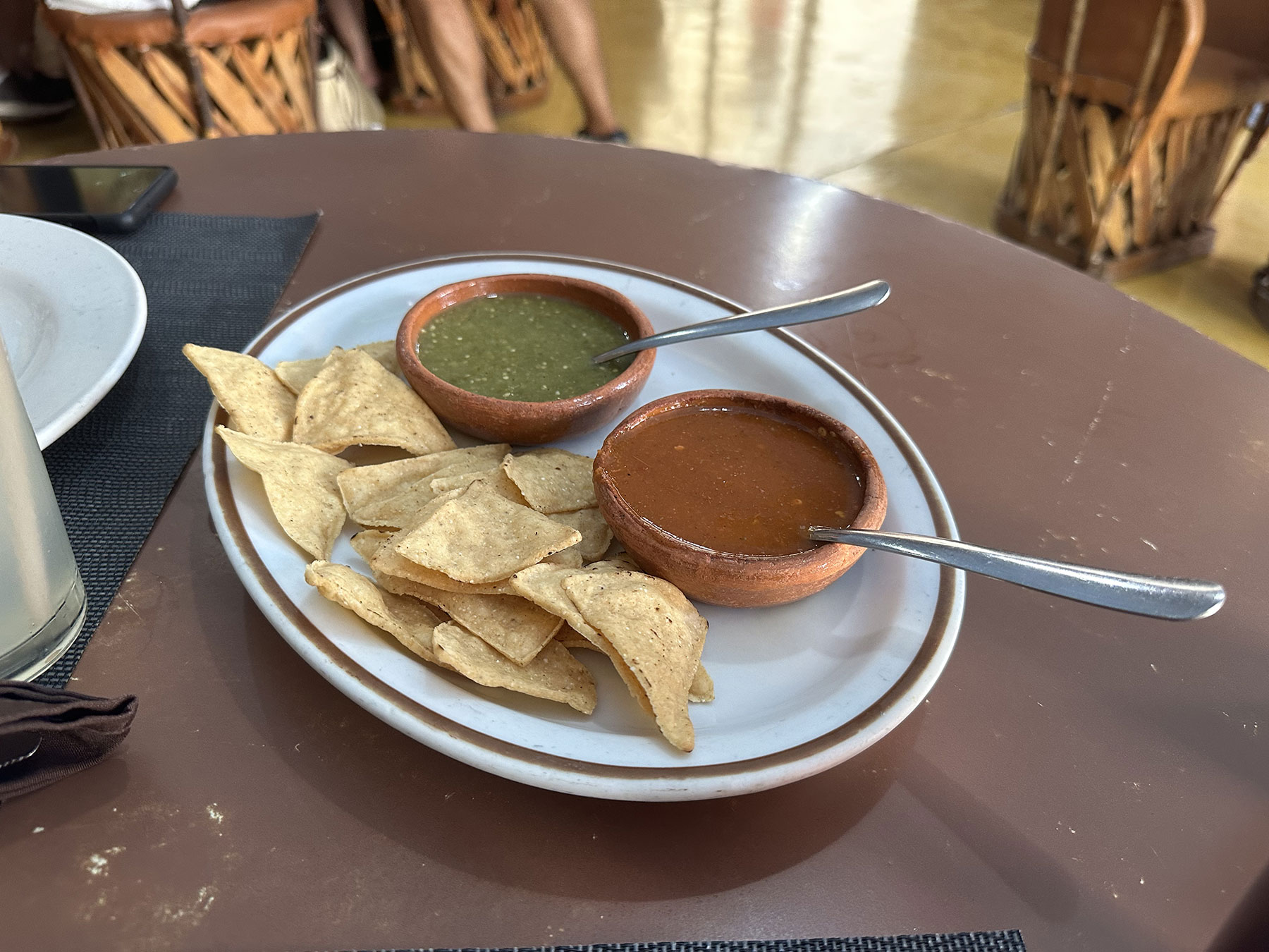 The menu offers Appetizers – guacamole, ceviche, grilled cheese – Salads, Quesadillas, Chile Rellenos, House Specialties – shrimp, fish-of-the-day, Mexican combinations, steak, enchiladas, grilled chicken, moles, and more. While we were reviewing the menu, our server brought us some tortilla chips along with two salsas to enjoy while we sipped on our drinks.