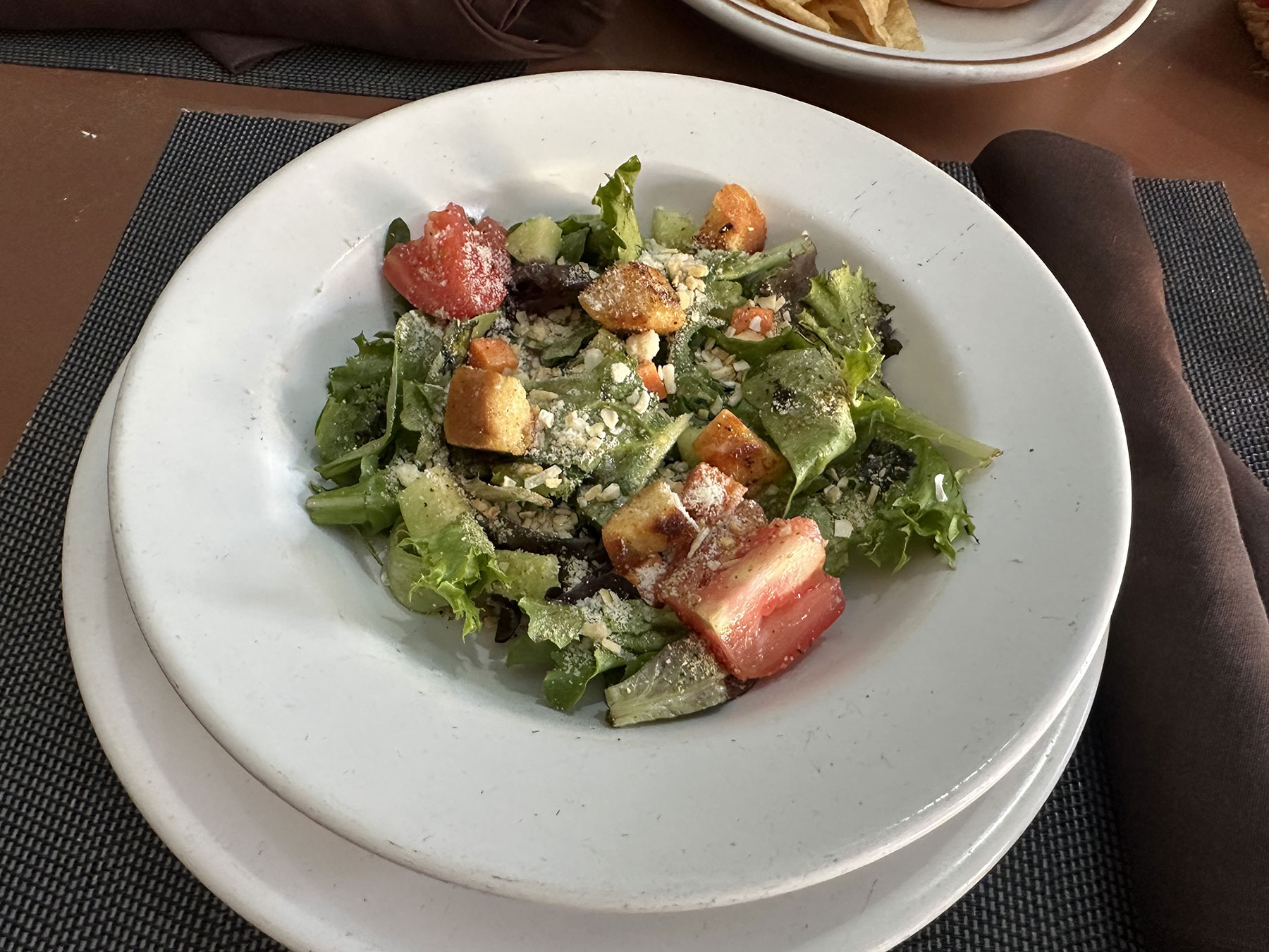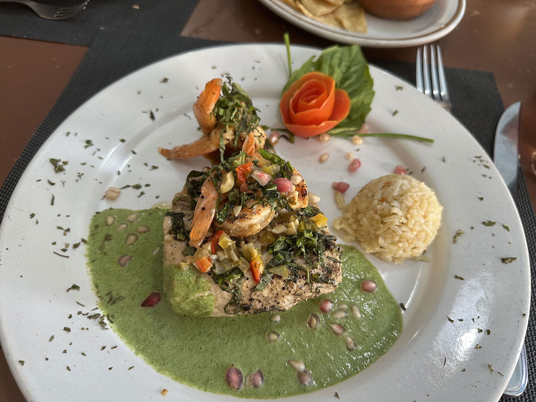 For our lunch, Diego selected the enchiladas and I decided to try the Fish Filet with Shrimps in a garlic sauce. The Fish special was served with a large salad with lettuce, tomatoes, pine nuts and parmesan cheese, which we shared. Diego’s enchilada platter had three enchiladas covered in a green sauce with rice and beans. My fish-of-the day was a very large piece of sea bass with two shrimp and chopped vegetables on top, two shrimp on the side, rice, and an excellent green garlic sauce. The portion of fish was so big that I took more than half of it home with me. The flavors were great.
