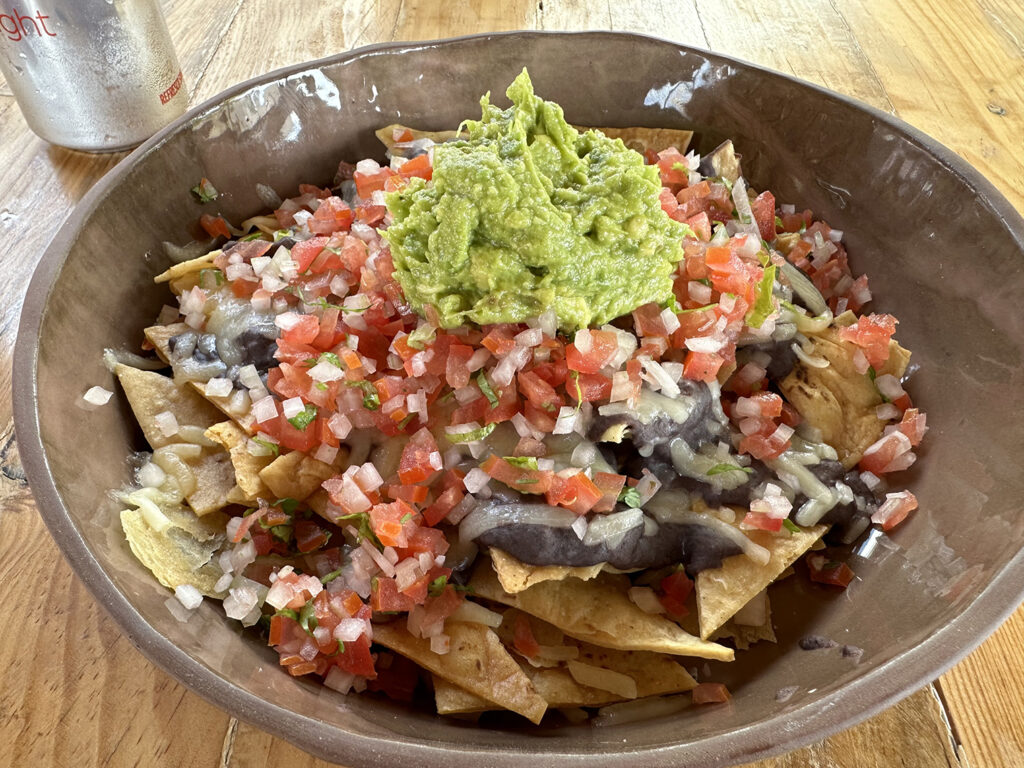 The breakfast menu offers any style of eggs with protein additions, French Toast, Fruit, Chilaquiles and Toasts. Their coffee is a special blend that is made for them by Docecuarenta in Todos Santos. Raul mentioned that it is completing well against the popular coffee at Baja Beans next door. The lunch and dinner menu offers appetizers – guacamole, ceviche, taquitos, nachos, croquetas – tacos and tostadas and pizza and tlayuda from the wood-fired oven. With a full bar and beer on tap, there are good beverages to complement the meal.