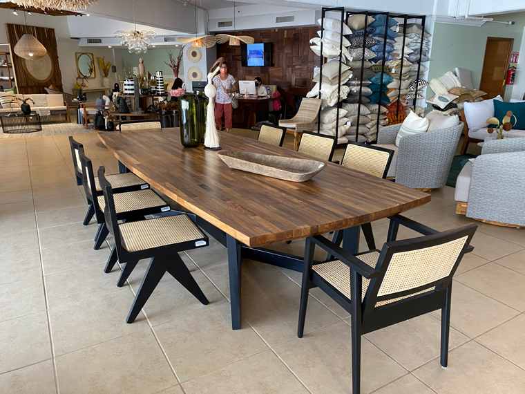 The first thing that you see is the range of outdoor furniture made with natural woods – tables, chairs, chaise pool lounges. There are even chairs and coffee (or drink tables) carved completely out of trunks of trees. Many of the chairs use woven materials for the backs of the seats. Everything is very stylish and also well made. We then went inside the large retail location to see how the natural woods were used in the construction of dining room tables and chairs, coffee tables and bedroom furniture. Again, there were some items that were completely carved out of single pieces of wood. As several of the dining tables (both regular and bar height) were very large, we asked on of the members of the staff, if they custom made furniture. We were assured that this was a large part of their business and that we could specify the style, size and color of the furniture that we would like to have made. In fact, the Facebook page shows photos of their hand building process for their Mexican artisan furniture.