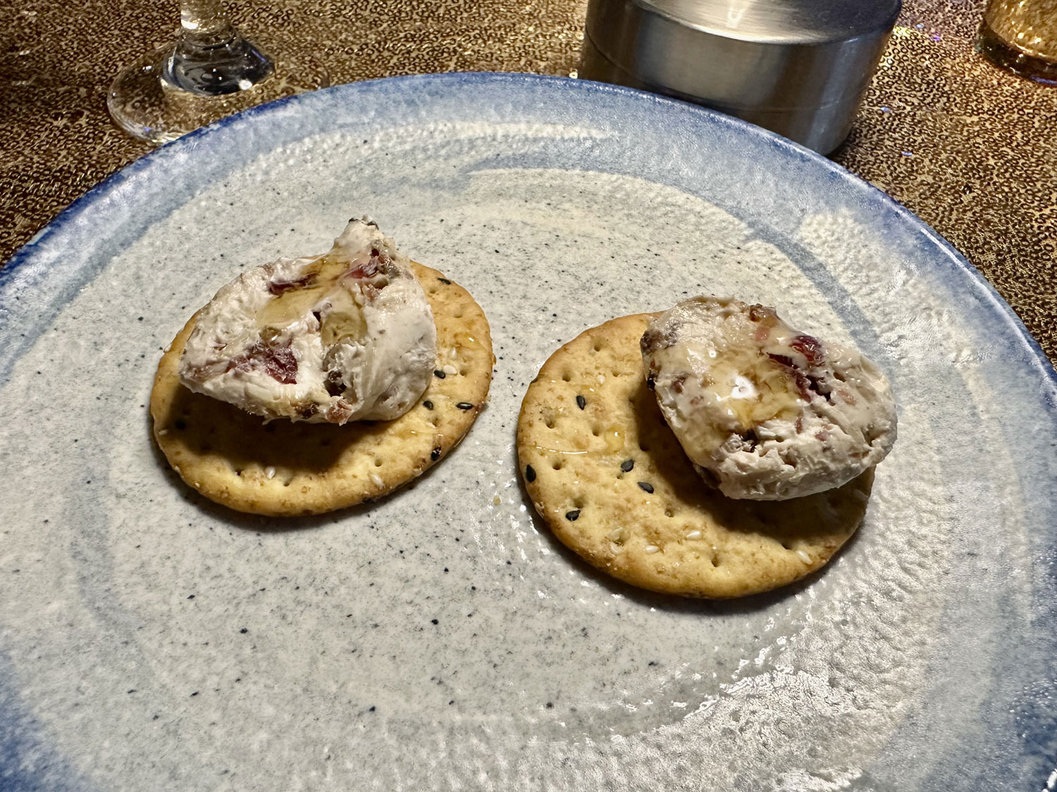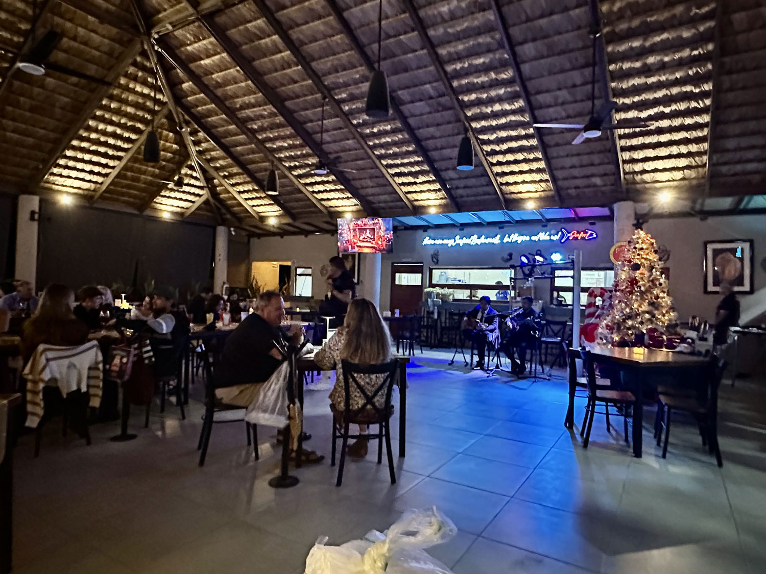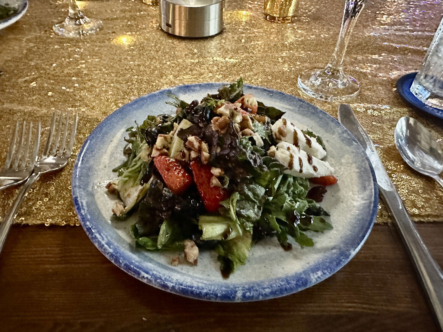 When we arrived for our reservation for New Year’s Eve dinner at La Tuna Restaurant and Bar, we saw a skewer with 12 grapes standing in a champagne glass for each of us on the table. I asked our server the story and then looked up on the whole history with a Google search. La Tuna had decorated the restaurant to celebrate New Year’s Eve and offered a special four-course menu – Arugula Salad, Lobster Bisque, a main course (we selected the salted ribeye from the three choices), and a red velvet cake dessert. Our meal began with an amuse of a berry cream cheese with honey and nuts on top of a cracker. The meal and service were excellent. We enjoyed live entertainment from Daniel Flores and another guitarist throughout the meal.