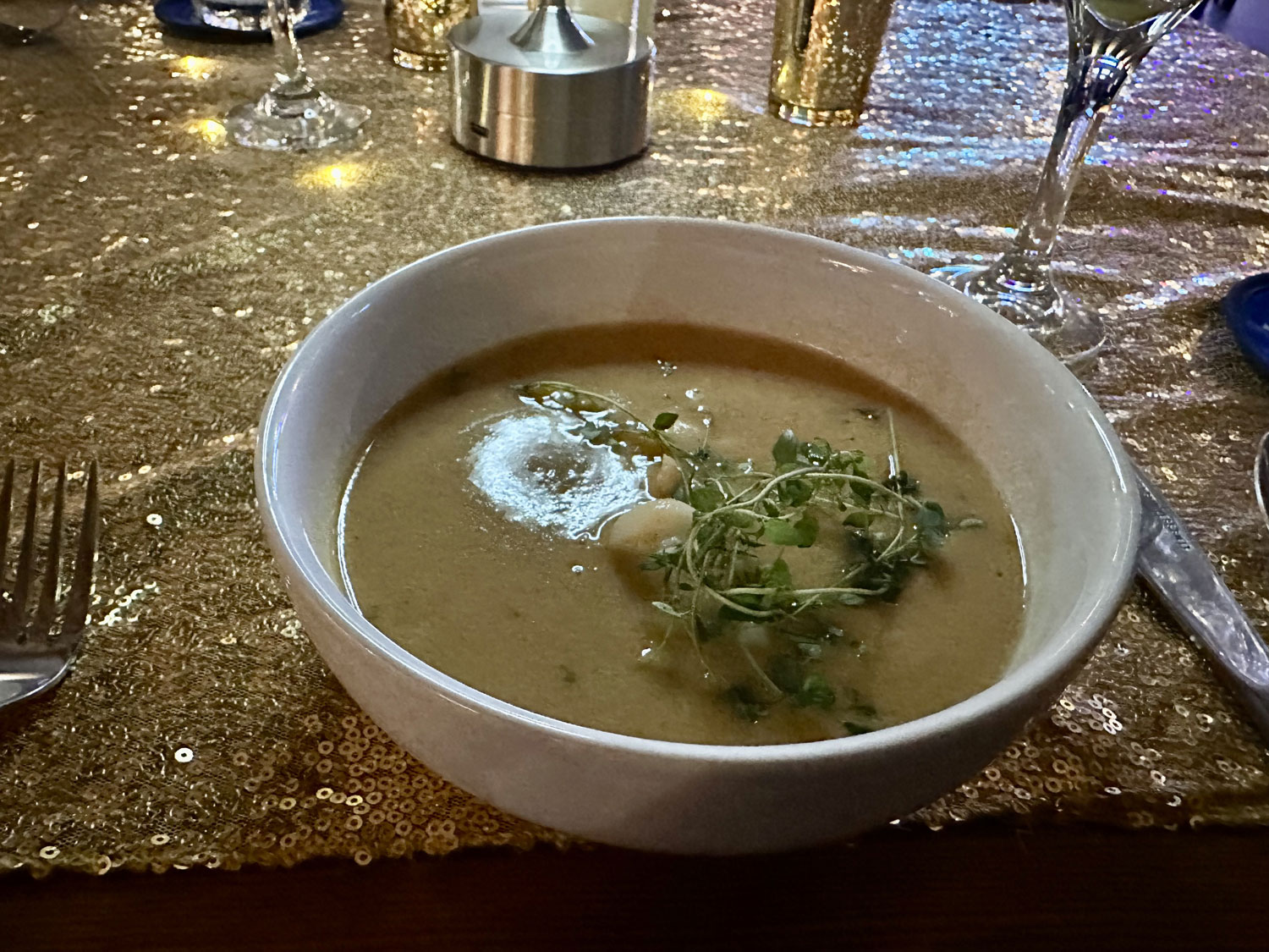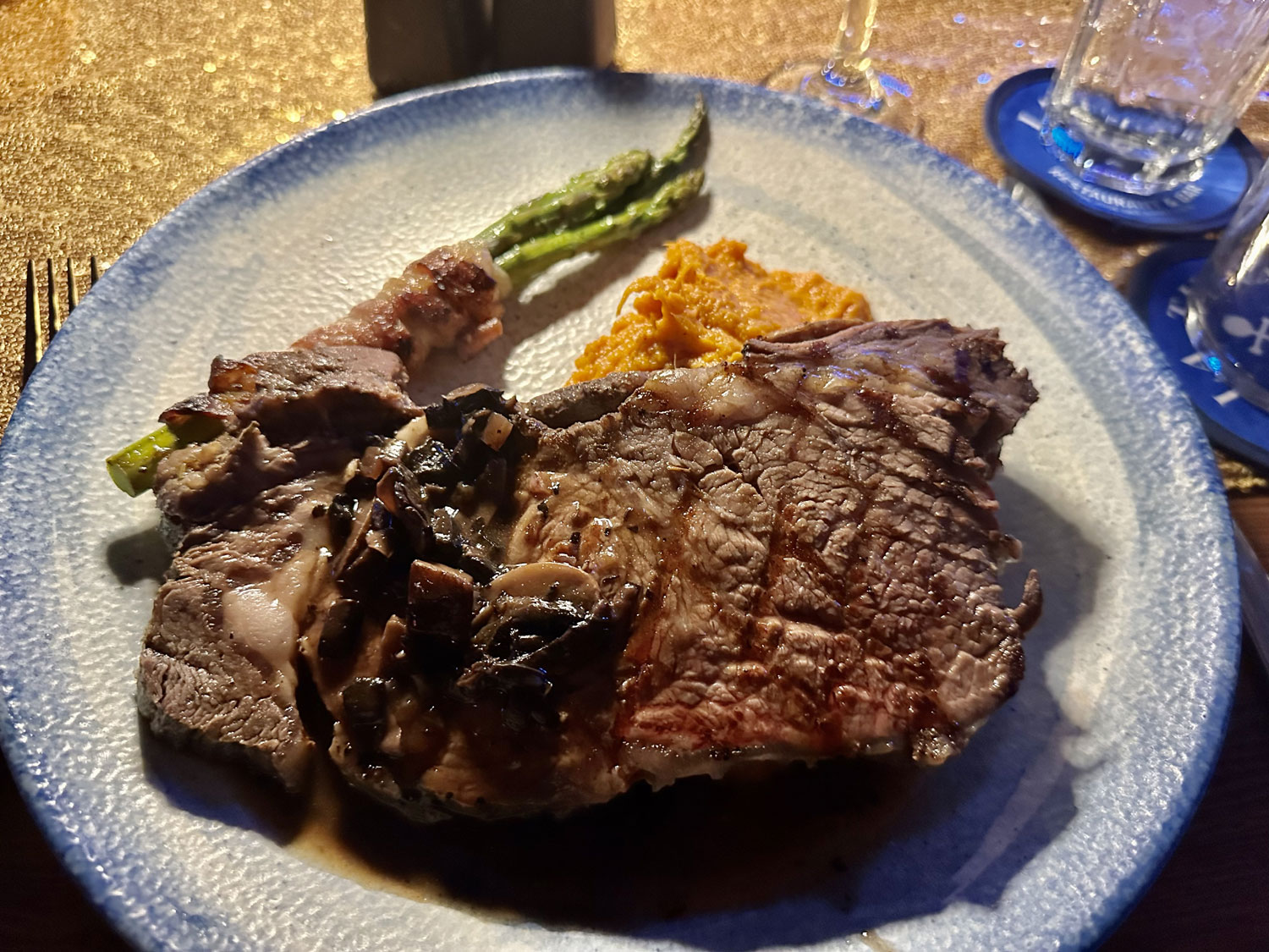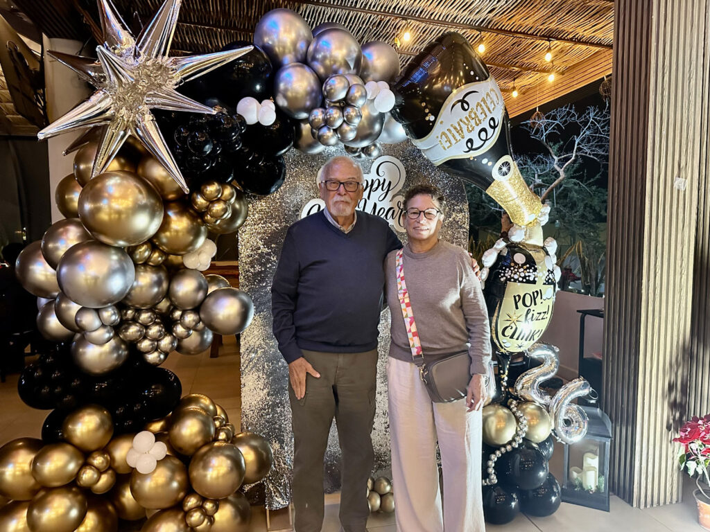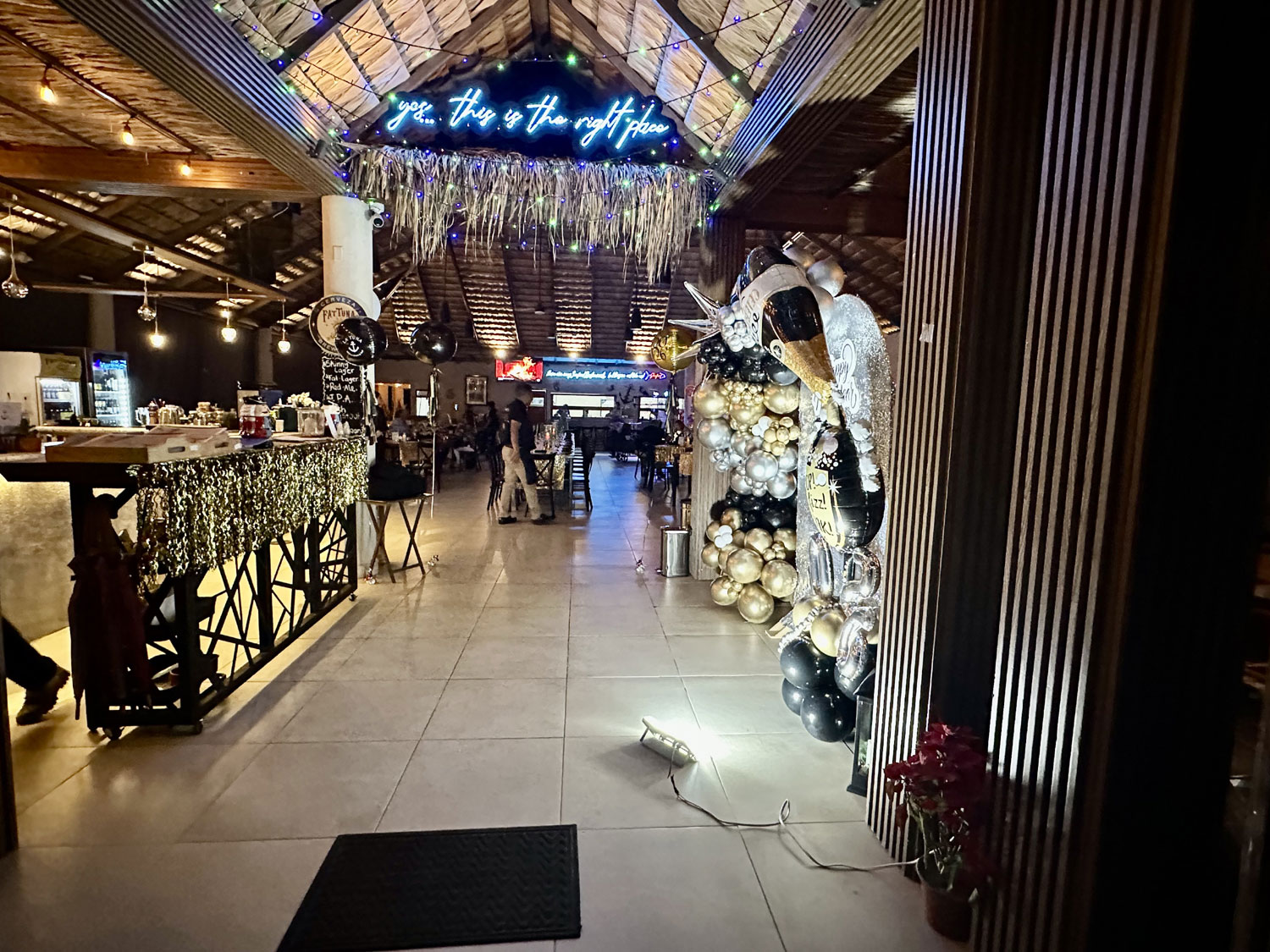 When we arrived for our reservation for New Year’s Eve dinner at La Tuna Restaurant and Bar, we saw a skewer with 12 grapes standing in a champagne glass for each of us on the table. I asked our server the story and then looked up on the whole history with a Google search. La Tuna had decorated the restaurant to celebrate New Year’s Eve and offered a special four-course menu – Arugula Salad, Lobster Bisque, a main course (we selected the salted ribeye from the three choices), and a red velvet cake dessert. Our meal began with an amuse of a berry cream cheese with honey and nuts on top of a cracker. The meal and service were excellent. We enjoyed live entertainment from Daniel Flores and another guitarist throughout the meal.