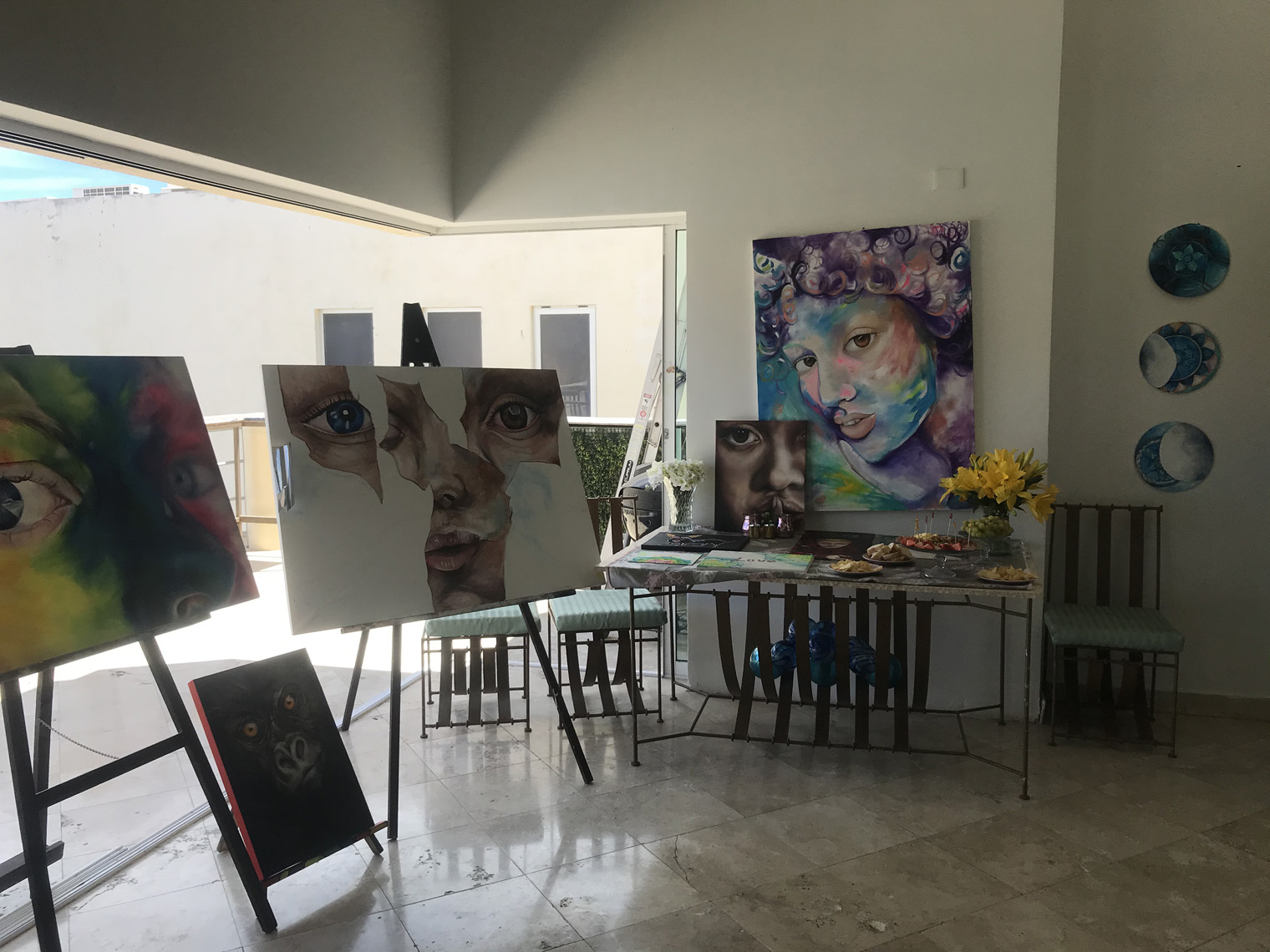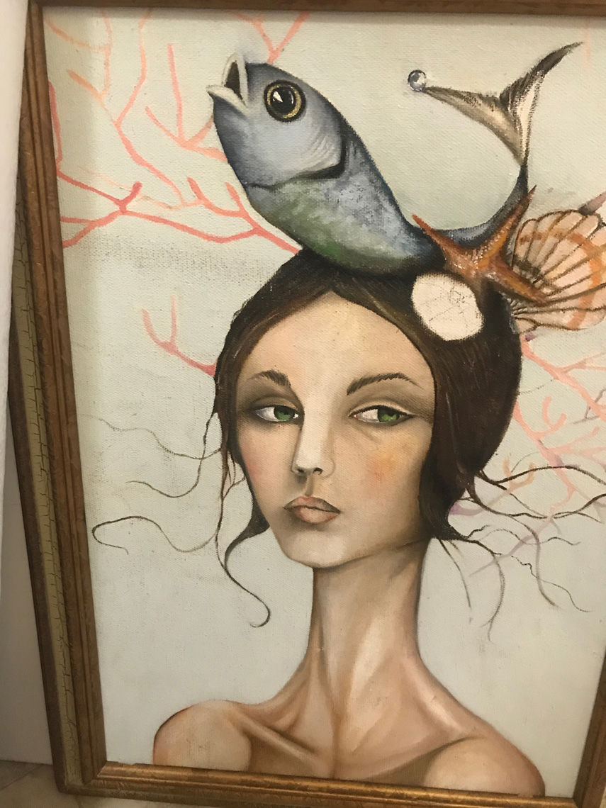 During the interview, I asked her what inspired her and how did she choose the subjects for her paintings. Again, she referred to her insecurity about her talents and then need to challenge them and continue to grow as much as possible as an artist. She has converted a walk-in closet in her condominium in Cabo San Lucas into a studio and spends a lot of time there painting. I said that it seemed that many of her paintings were based on self-portraits. She said that others had felt that too but that it must be subconsciously as she did not plan to do so. Fifi then pointed to one of the images that looked like her and told me that it was her sister.