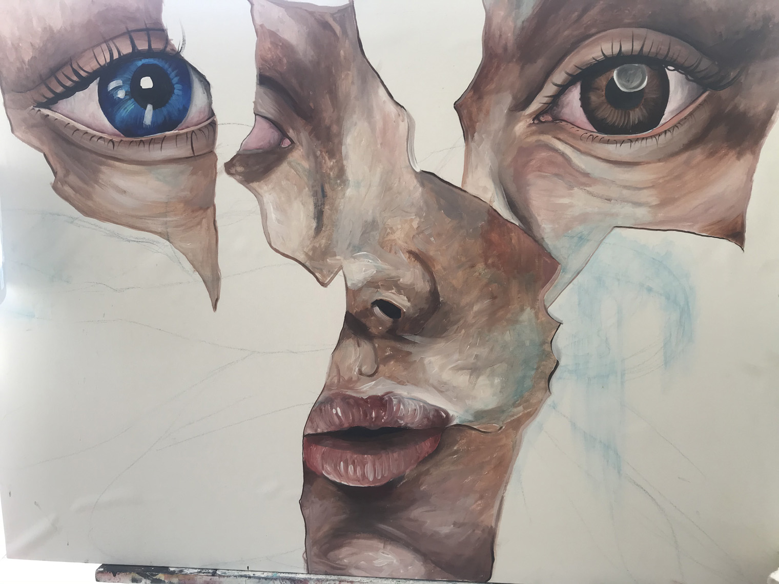 I commented that the eyes in her paintings were very expressive and seemed to be an important part of her work. Fifi said that the eyes are where she starts and moves from them to complete the paintings. Often on Facebook, she posts the progress on her paintings (see a sample below) that shows this initial focus on the eyes.