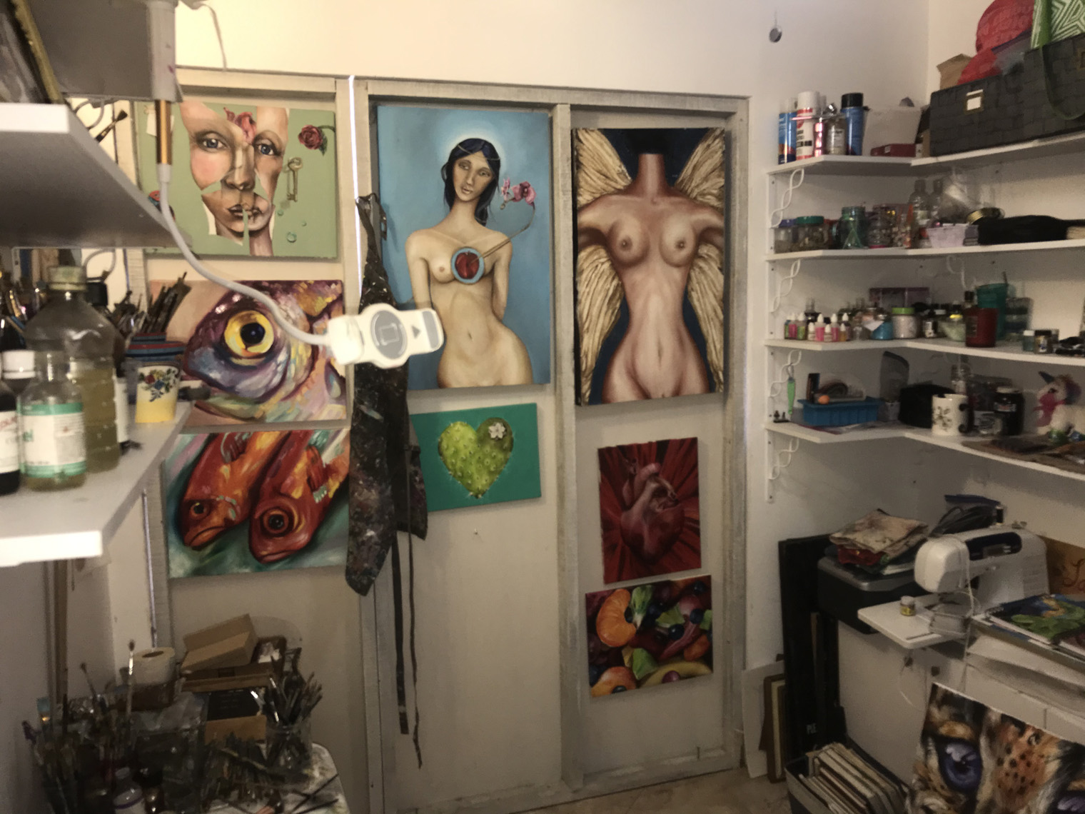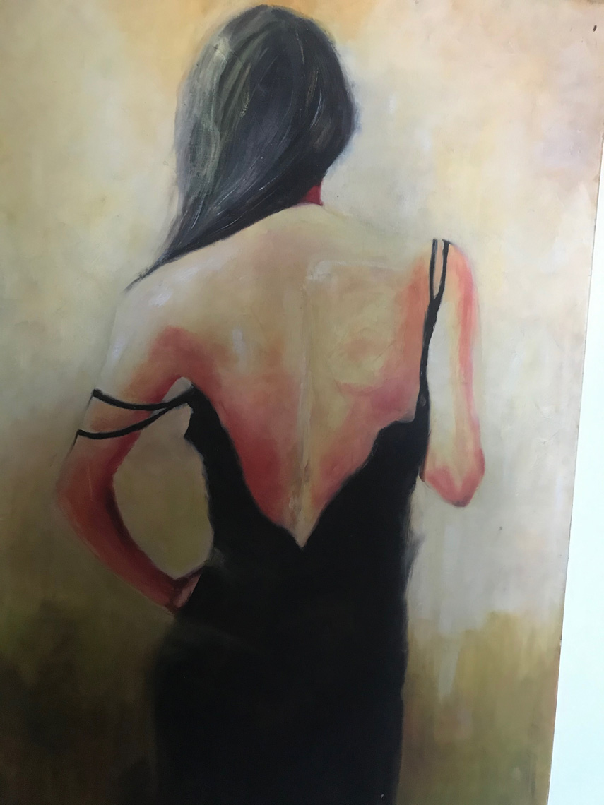 Her works cover a full range of subjects – from a series on animals, to nudes, to women seen from the back to playful and mystical paintings. I asked her what she would like to create. Her response was that she really wanted to be able to realistically paint the lights and colors of water with a figure in it. She showed me a series of photographs that she has used as inspirations to challenge her creativity. Her favorites – two nudes and the painting that she calls “Silence” (noted in photos below).