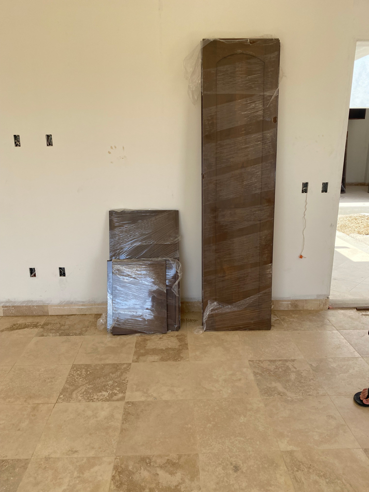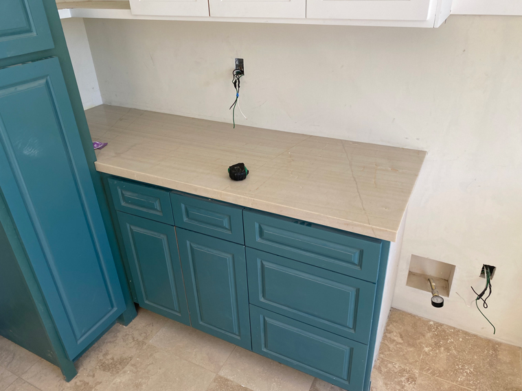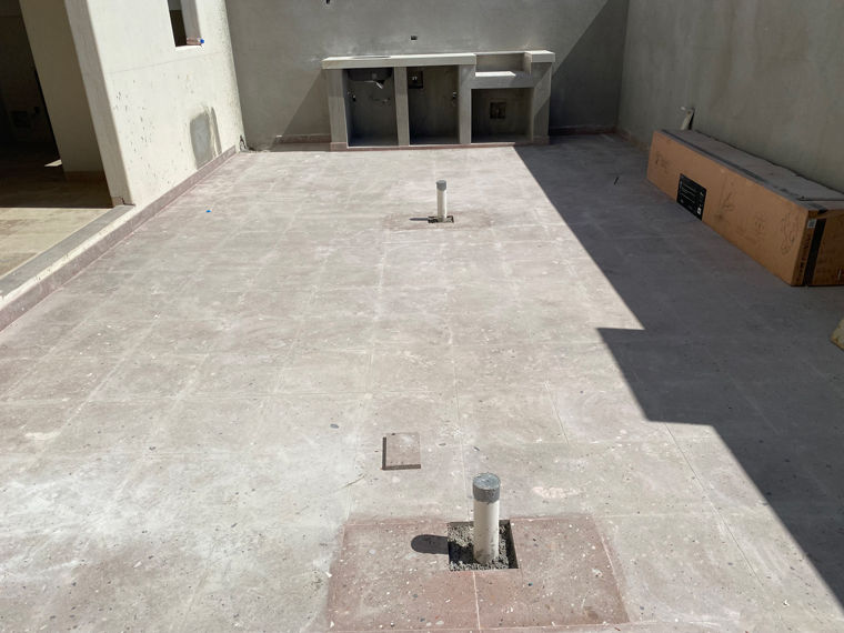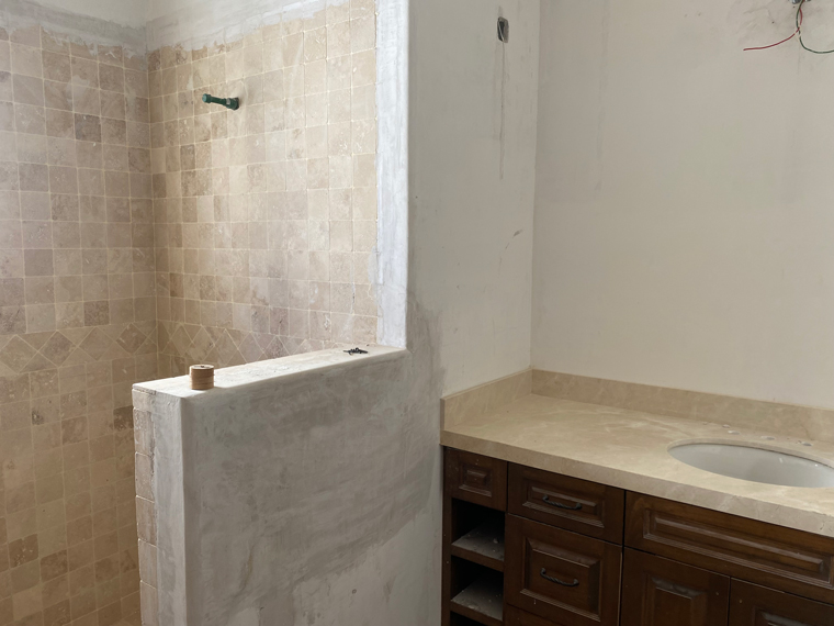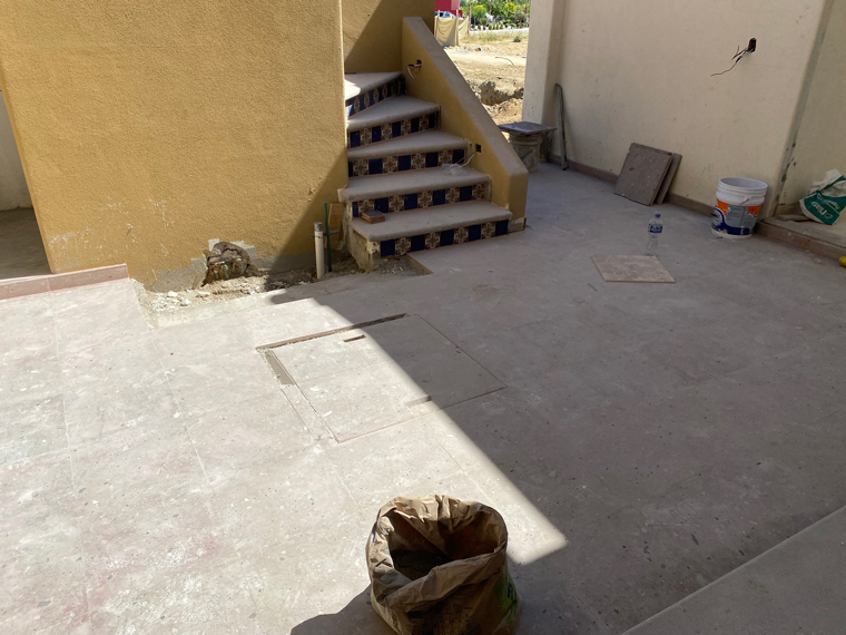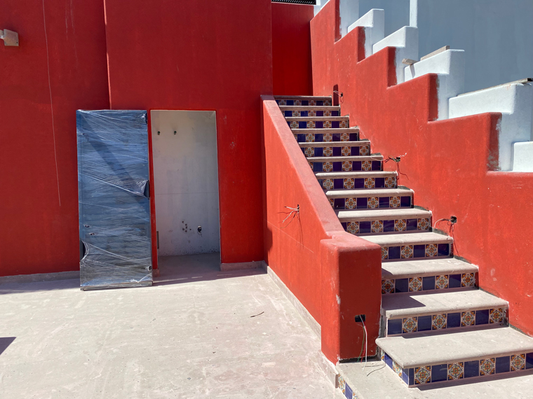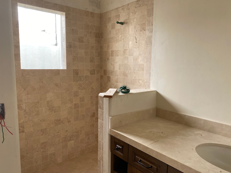 Now the only things that need to be finished with tile are the backsplashes in the indoor and outdoor kitchen with the alabaster subway tile from Porcelanosa and the fountain that is to be built in the courtyard with cantera stone and talavera tiles. The contractor has been doing a great job with all of the installations (other than countertops that were installed by Cabo Stone).